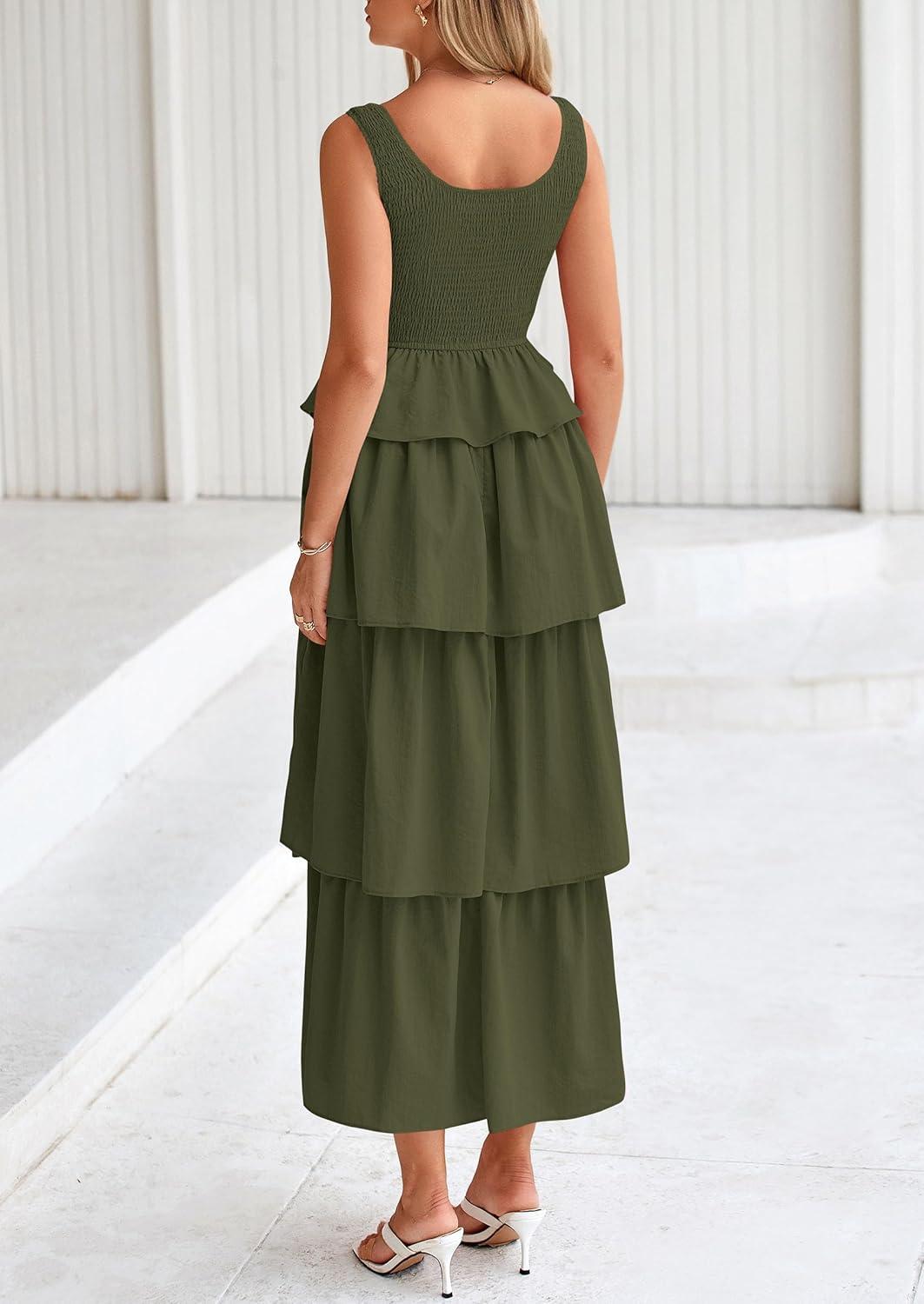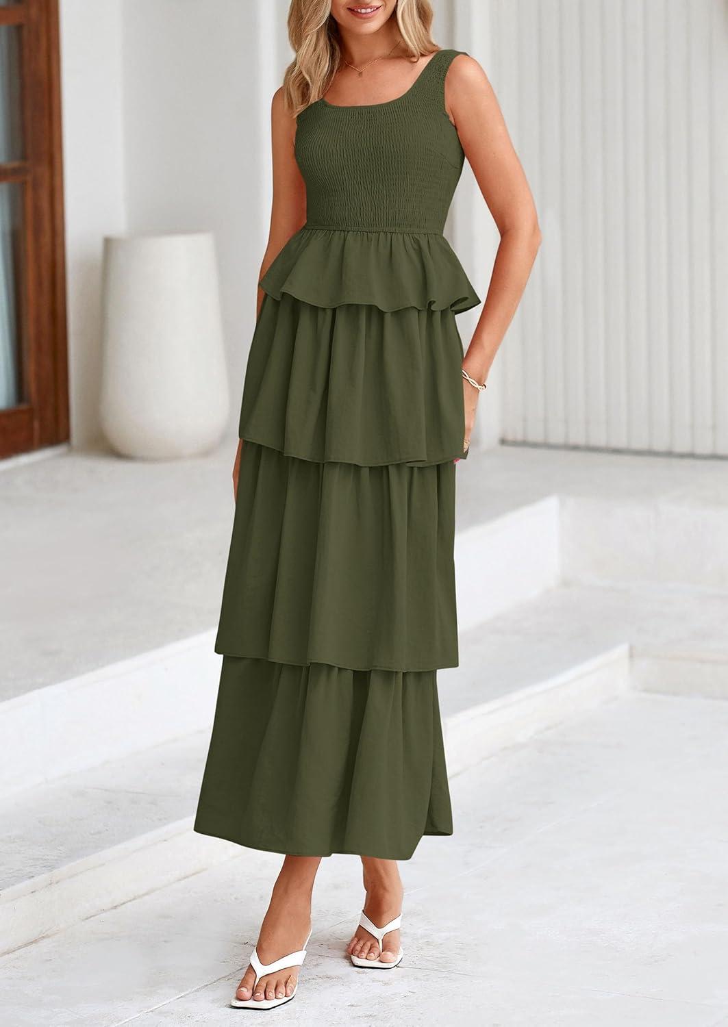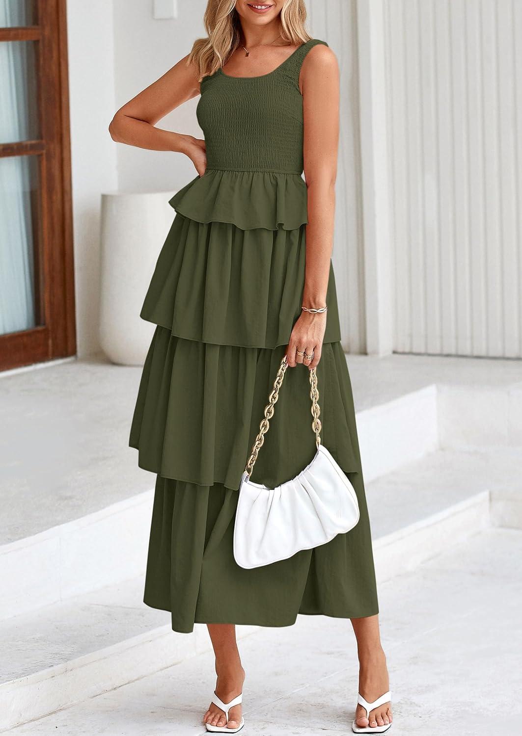 PRETTYGARDEN Womens 2025 Summer Sleeveless Midi Dress Scoop Neck A Line Smocked Ruffle Tiered Layered Beach Vacation Dresses(Army Green)