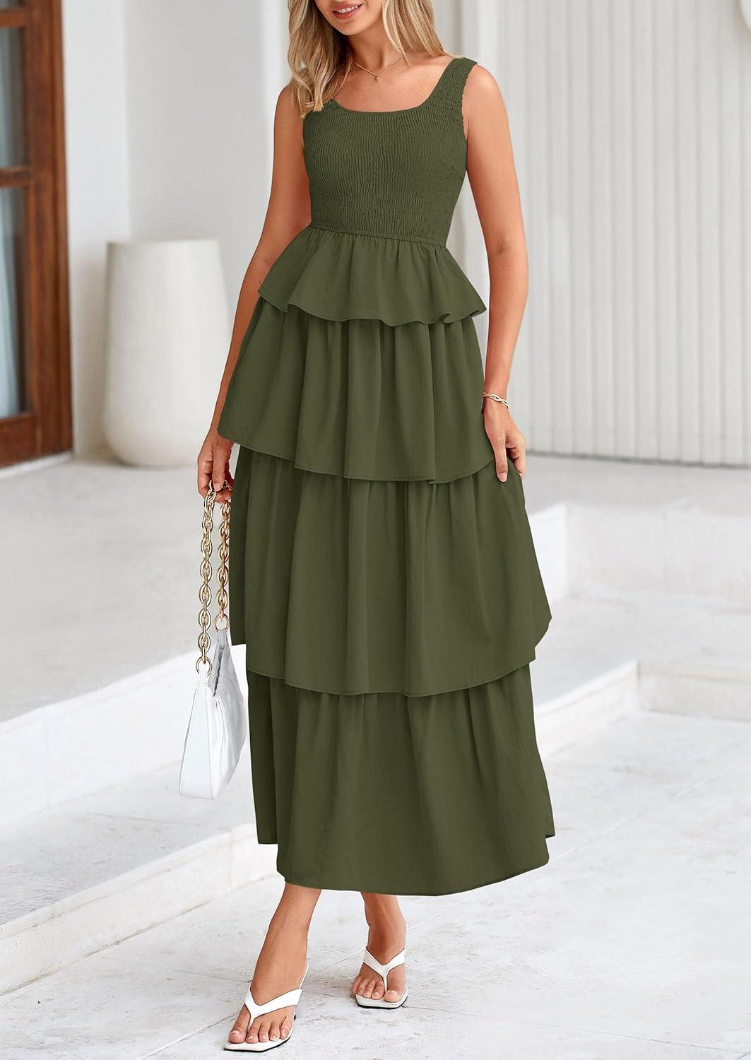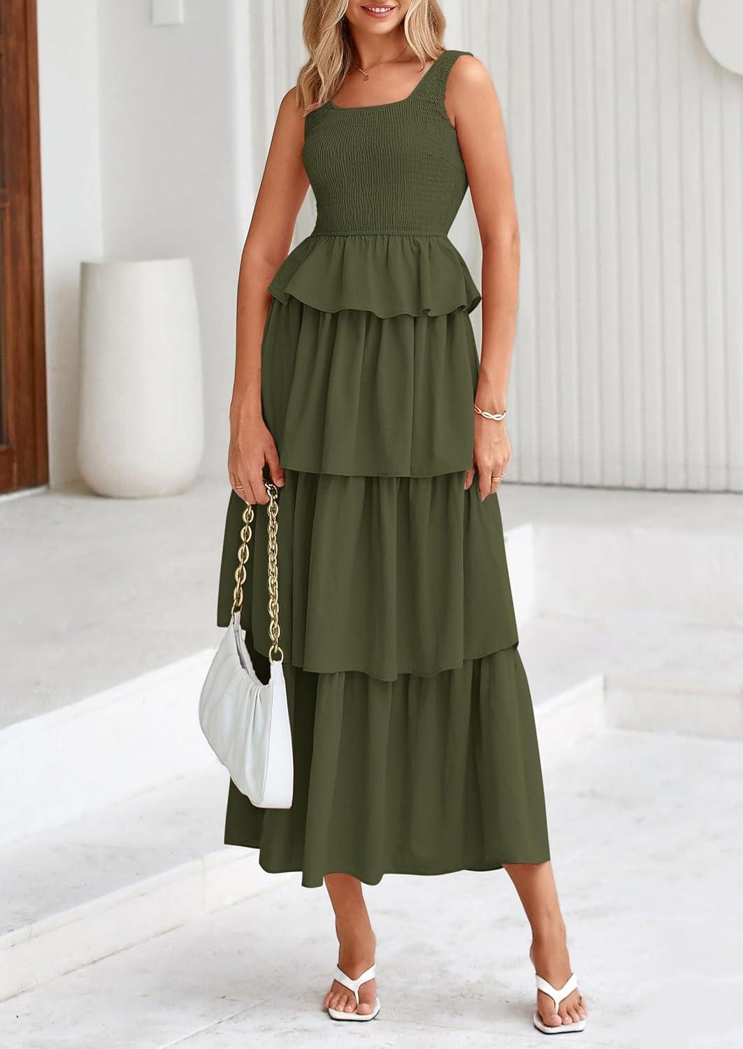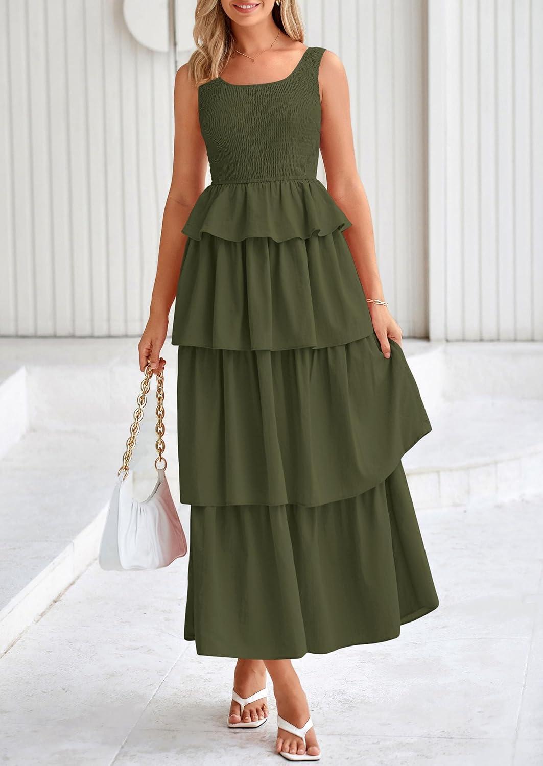 PRETTYGARDEN Womens 2025 Summer Sleeveless Midi Dress Scoop Neck A Line Smocked Ruffle Tiered Layered Beach Vacation Dresses(Army Green)