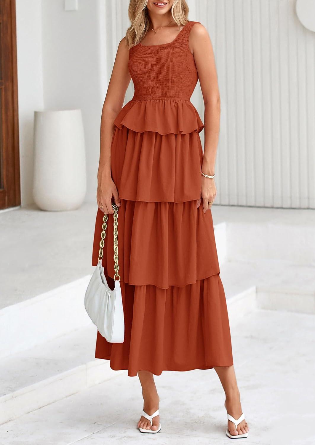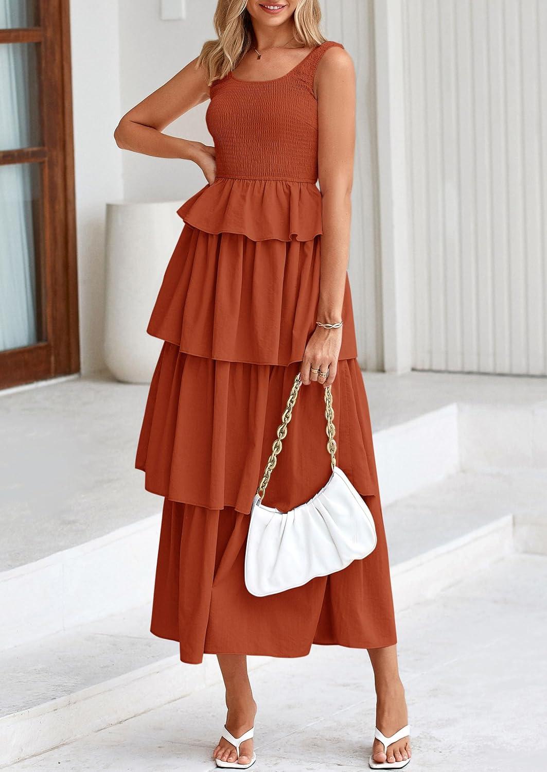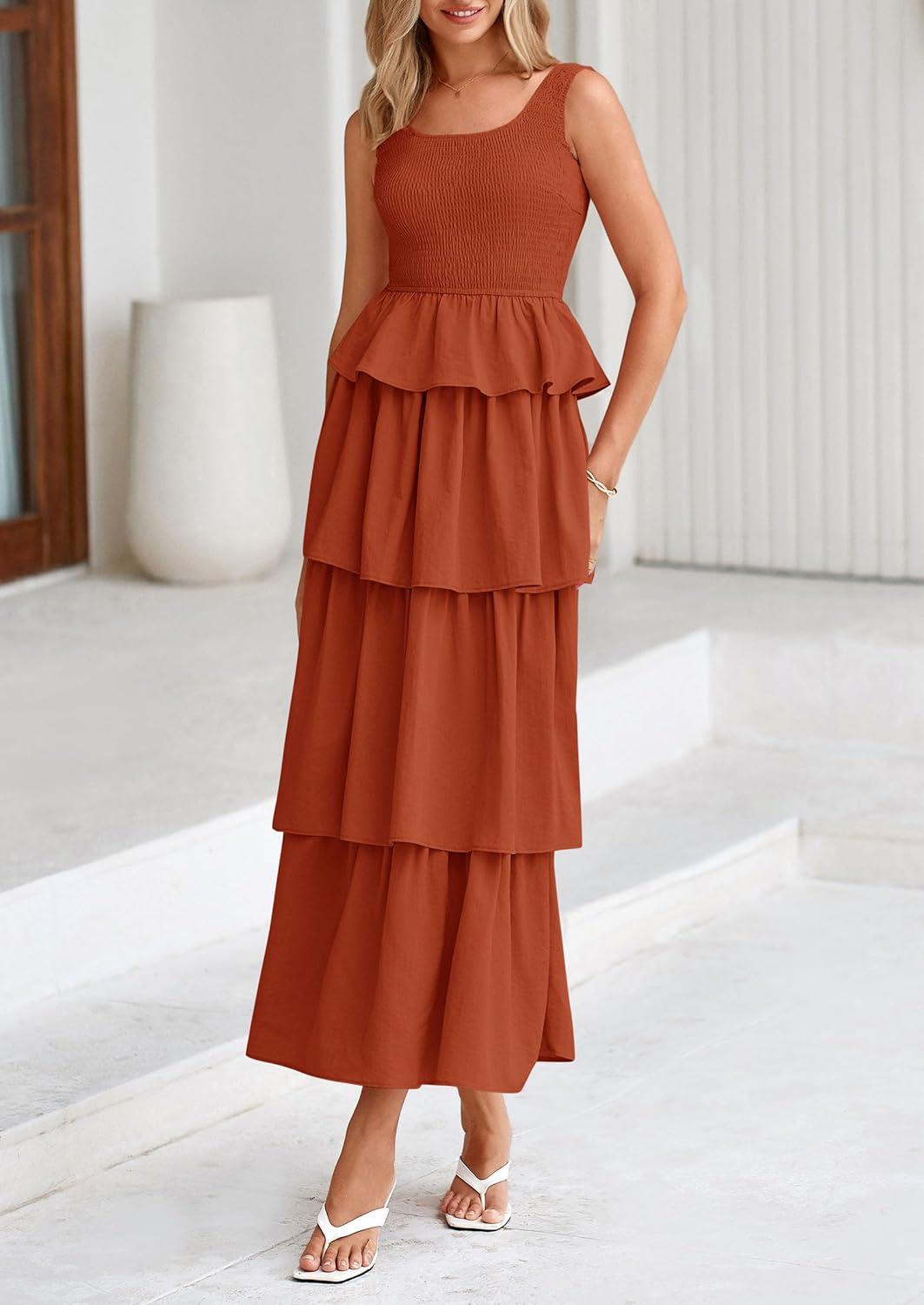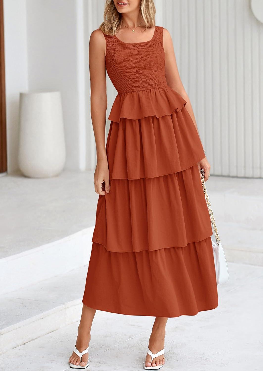 PRETTYGARDEN Womens 2025 Summer Sleeveless Midi Dress Scoop Neck A Line Smocked Ruffle Tiered Layered Beach Vacation Dresses(Brick Red)