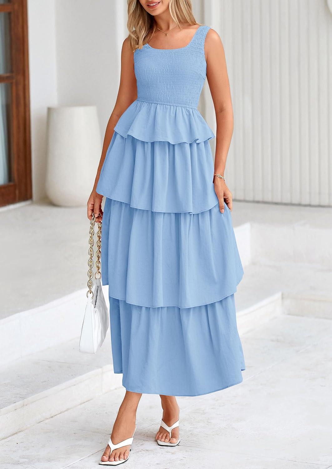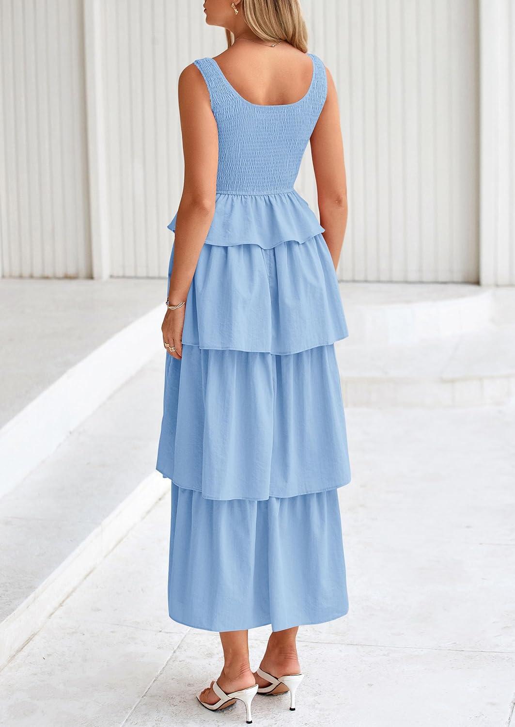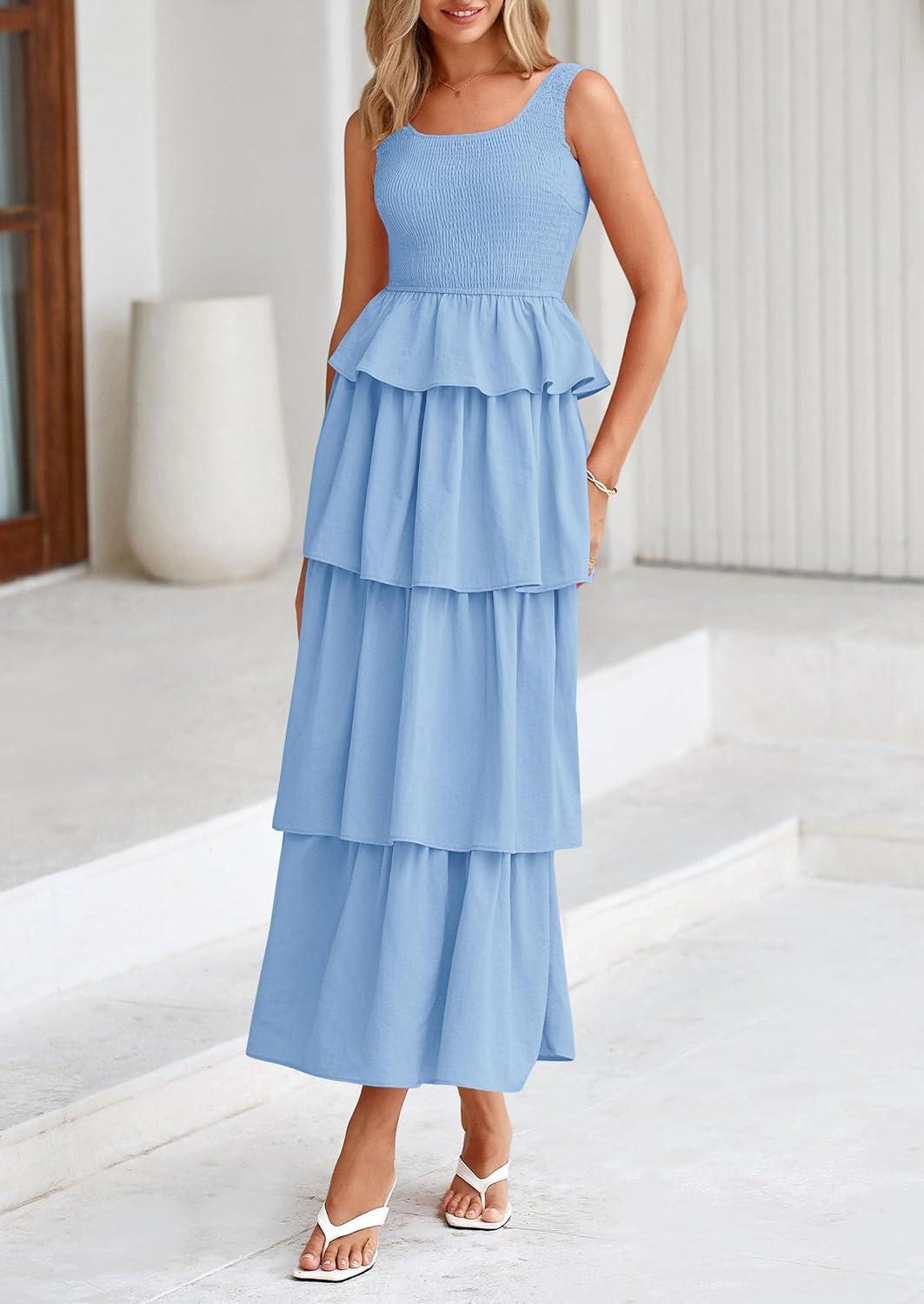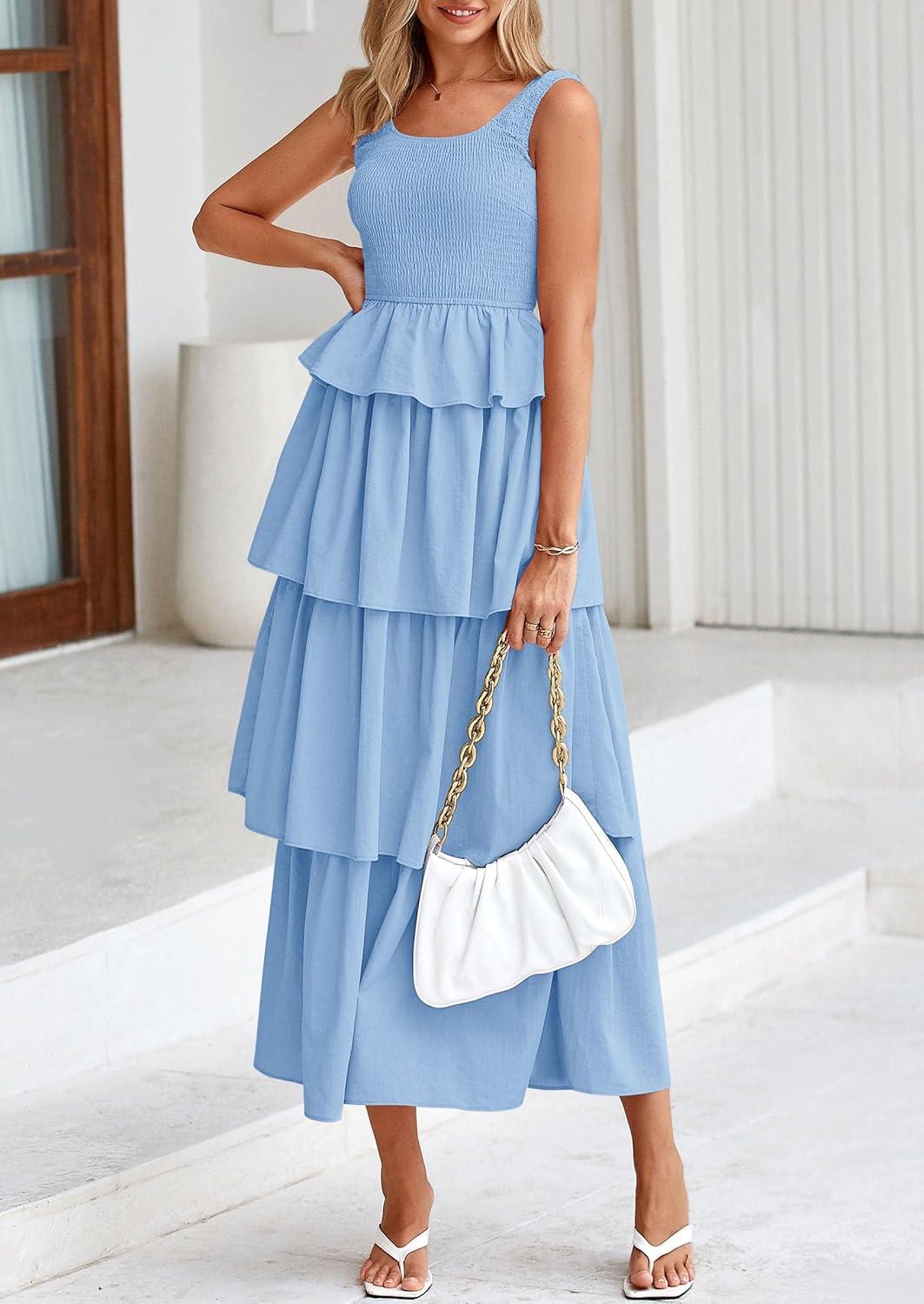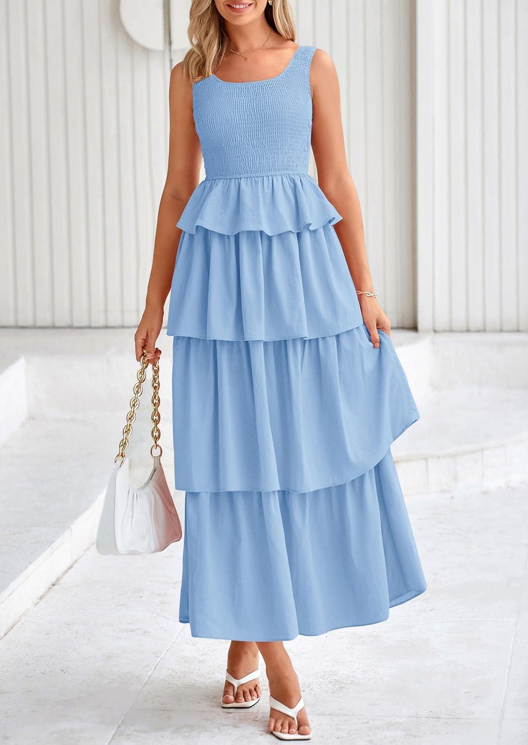 PRETTYGARDEN Womens 2025 Summer Sleeveless Midi Dress Scoop Neck A Line Smocked Ruffle Tiered Layered Beach Vacation Dresses(Light Blue)