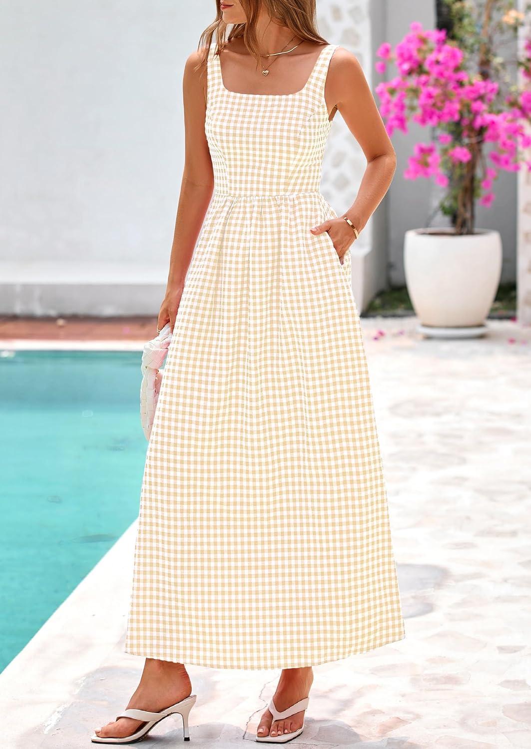 PRETTYGARDEN Women’s 2025 Summer Spaghetti Strap Maxi Dresses Plaid Square Neck A Line Casual Beach Vacation Long Sundress(Beige)