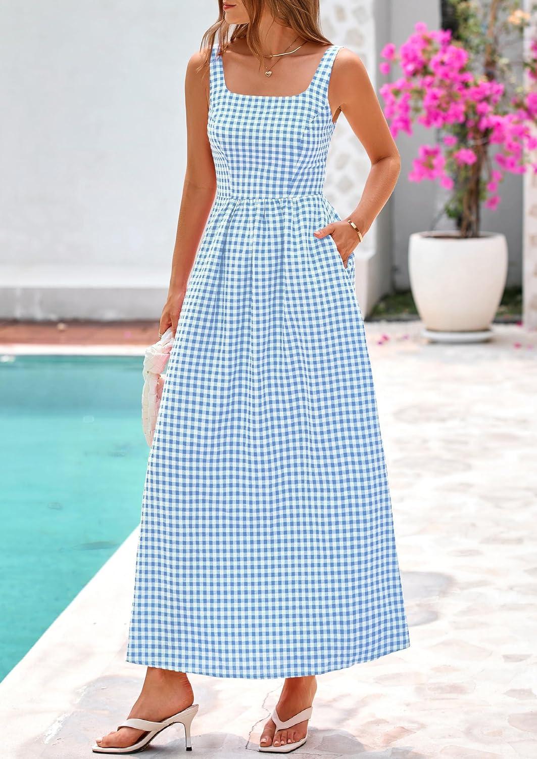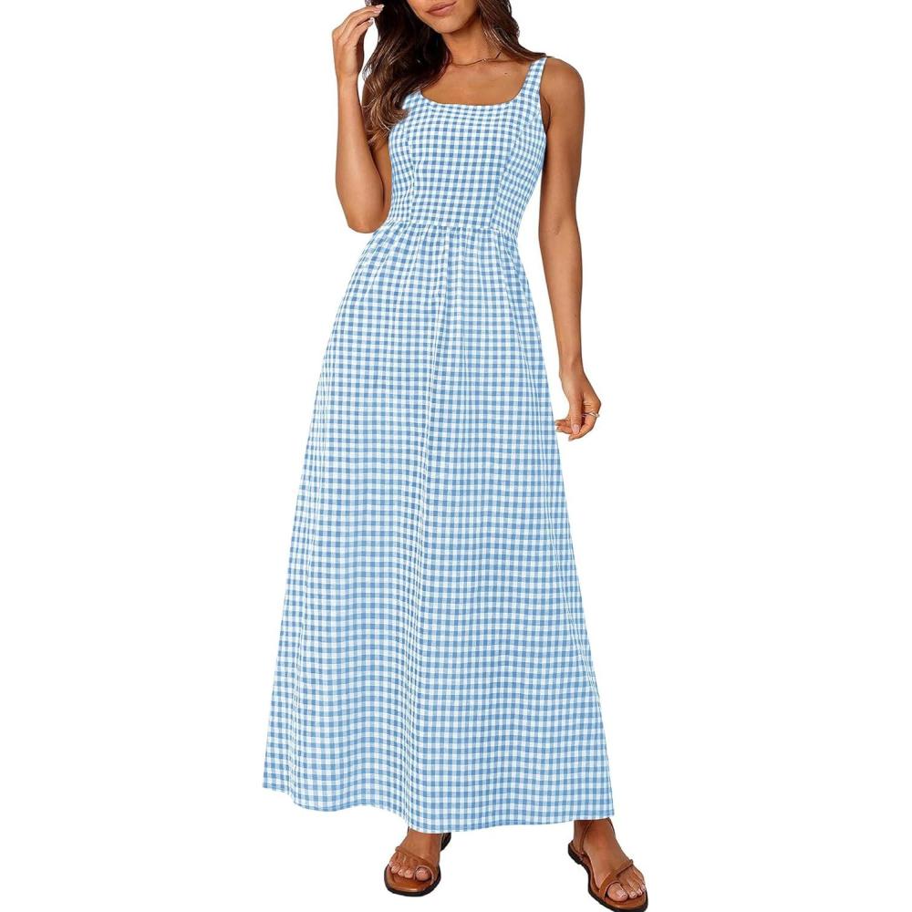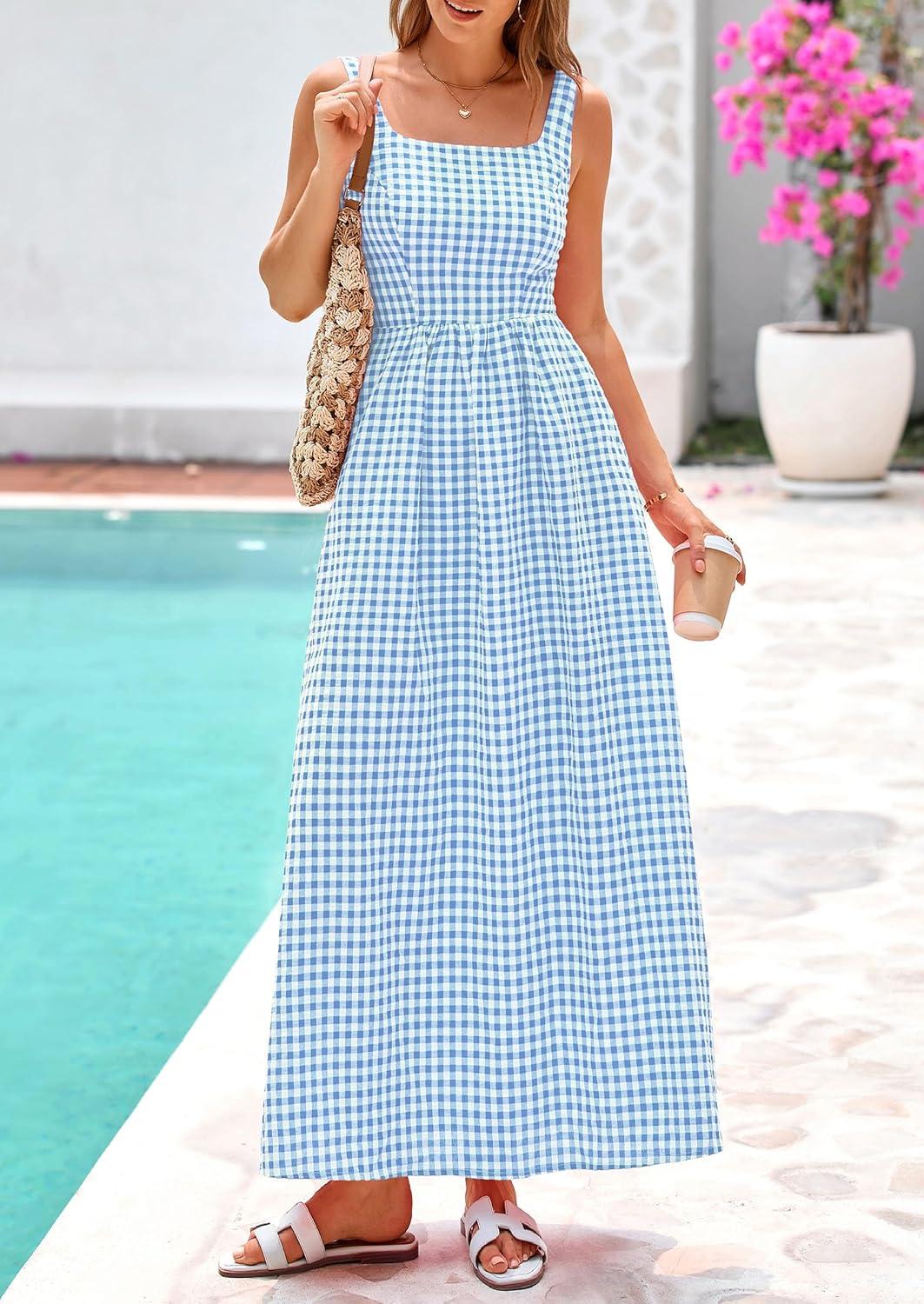 PRETTYGARDEN Women's 2025 Summer Spaghetti Strap Maxi Dresses Plaid Square Neck A Line Casual Beach Vacation Long Sundress(Dusty Blue)