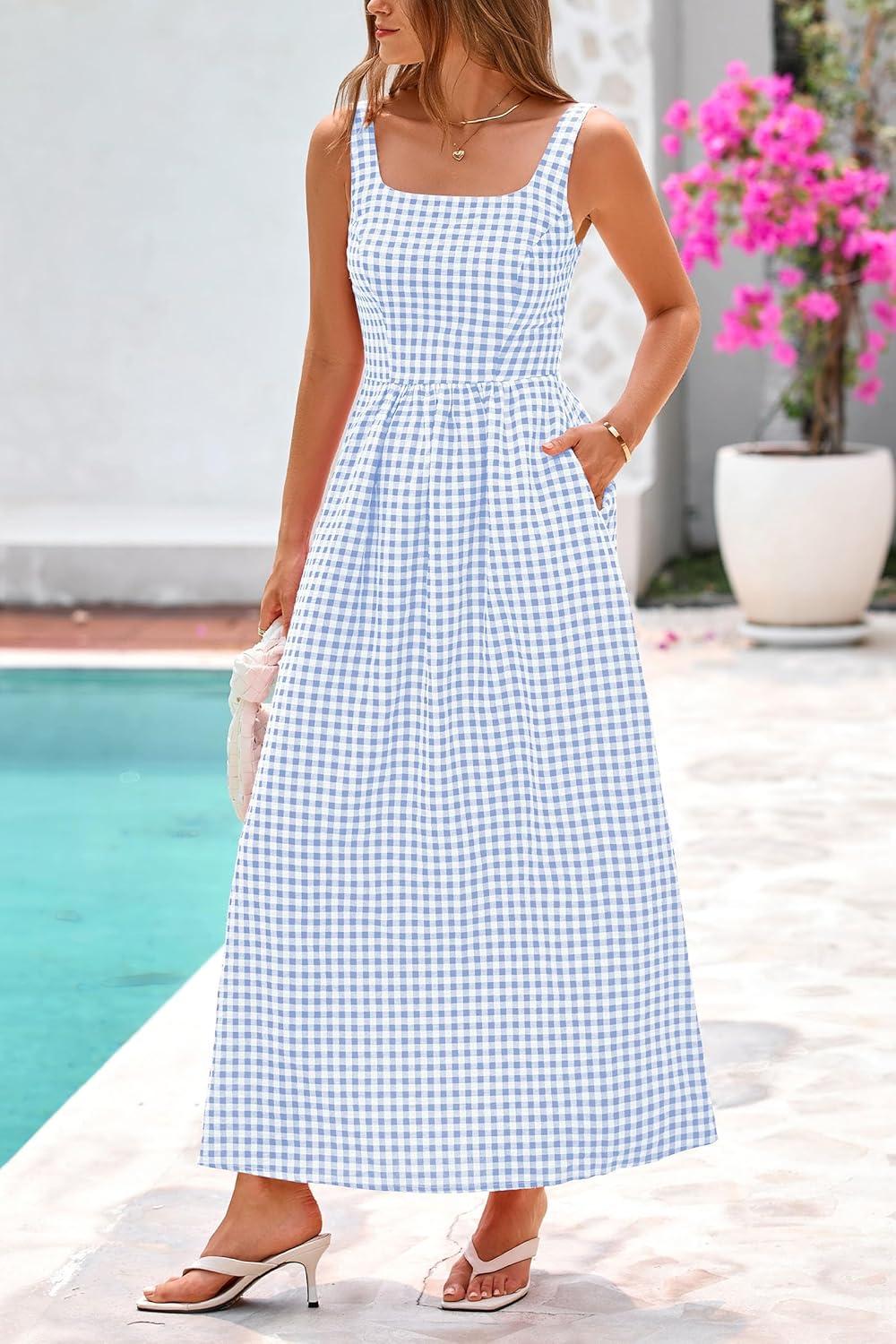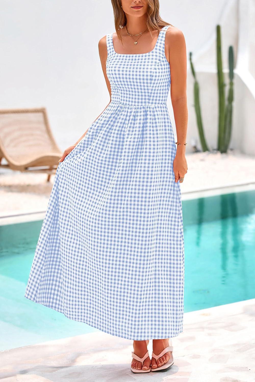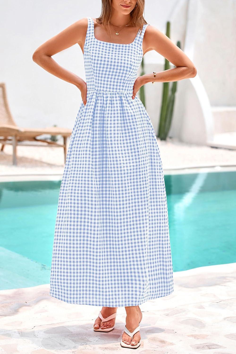 PRETTYGARDEN Women's 2025 Summer Spaghetti Strap Maxi Dresses Plaid Square Neck A Line Casual Beach Vacation Long Sundress(Light Blue)