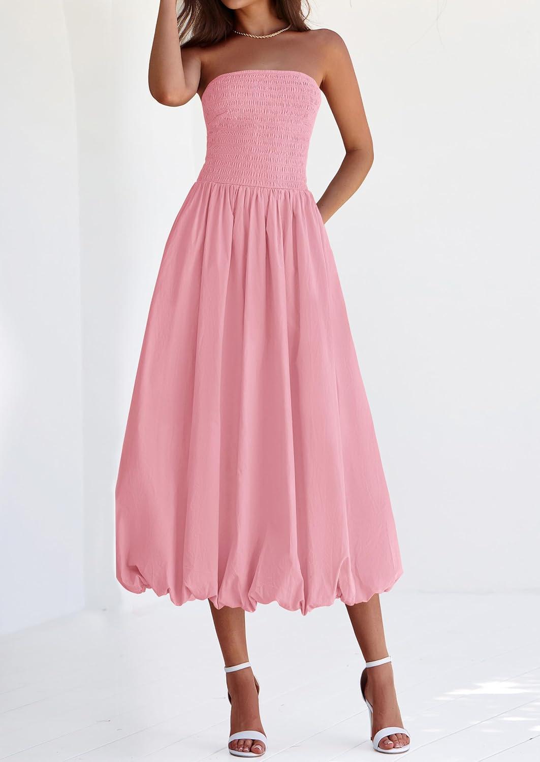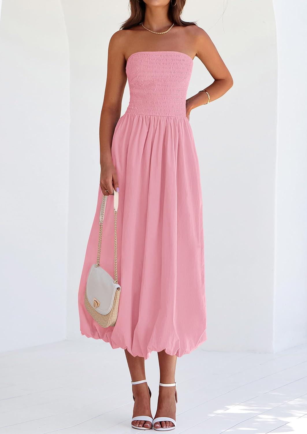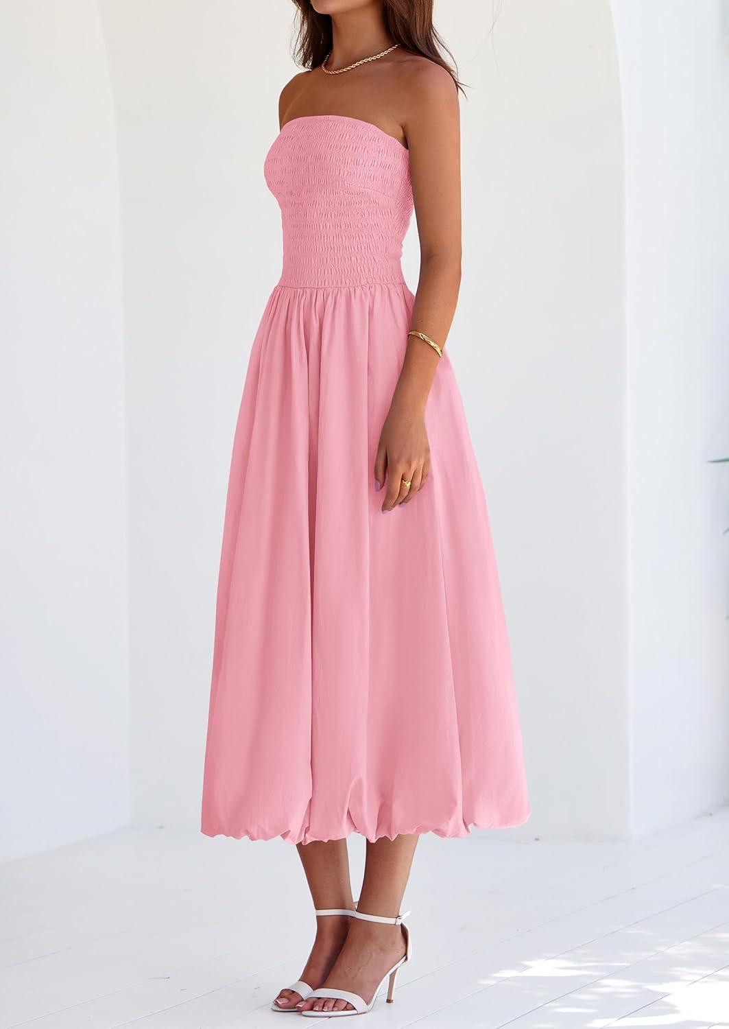PRETTYGARDEN Women's 2025 Summer Strapless Tube Midi Dress Smocked A Line Bubble Long Flowy Casual Elegant Party Dresses(Pink)