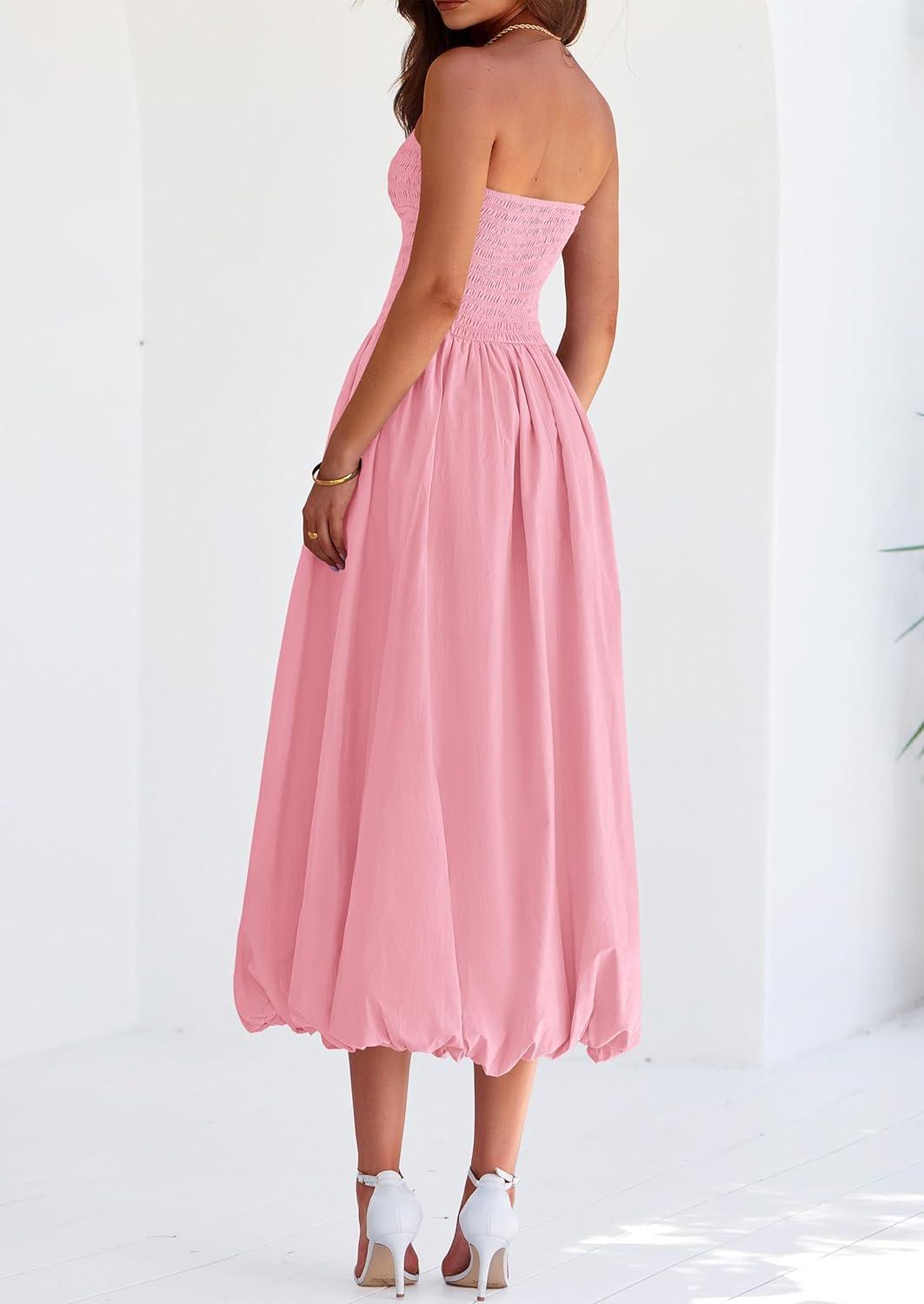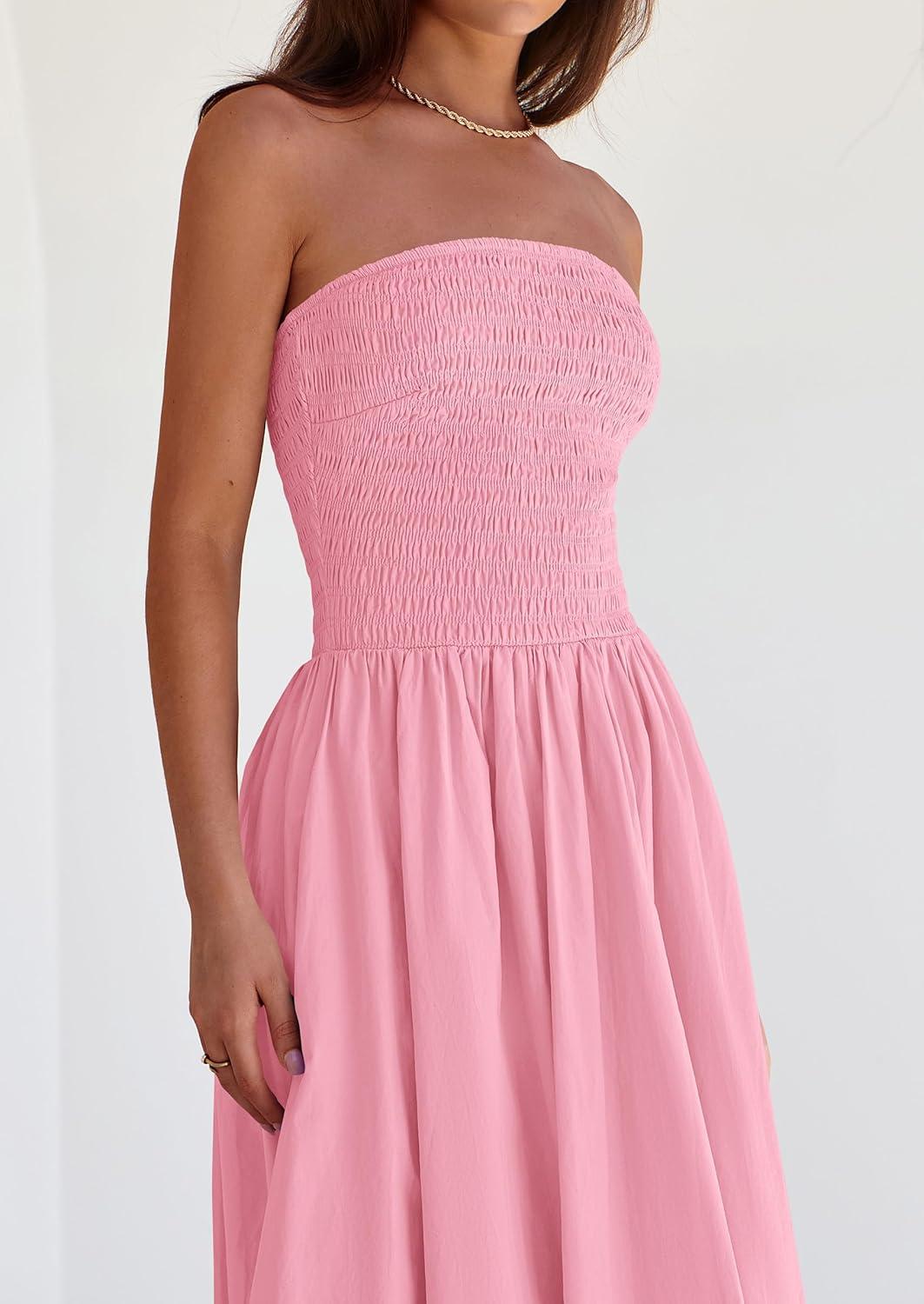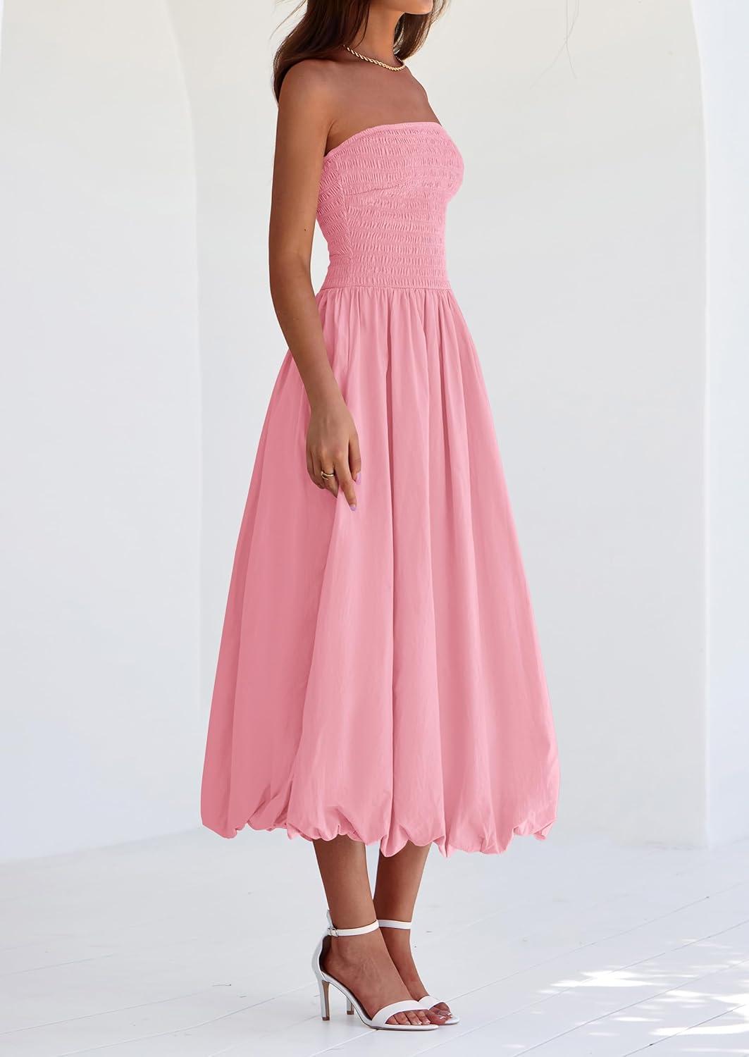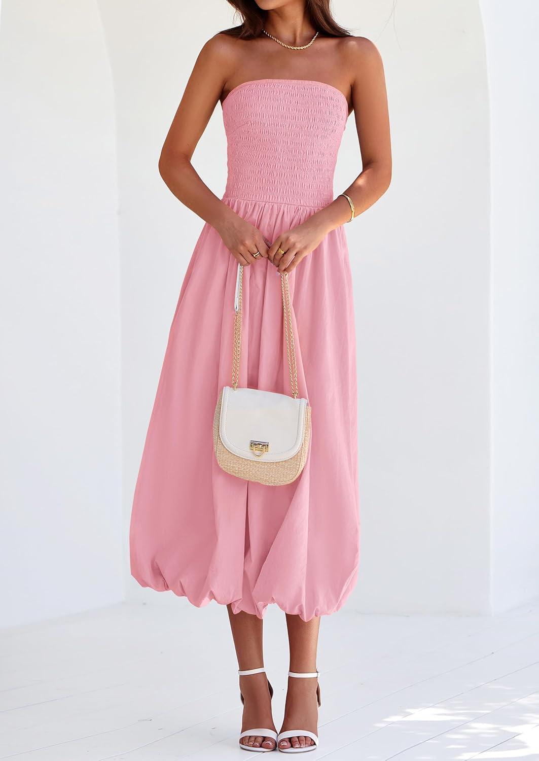 PRETTYGARDEN Women's 2025 Summer Strapless Tube Midi Dress Smocked A Line Bubble Long Flowy Casual Elegant Party Dresses(Pink)