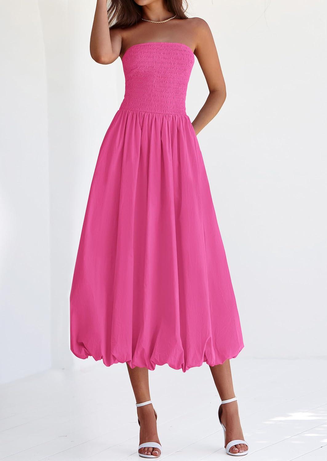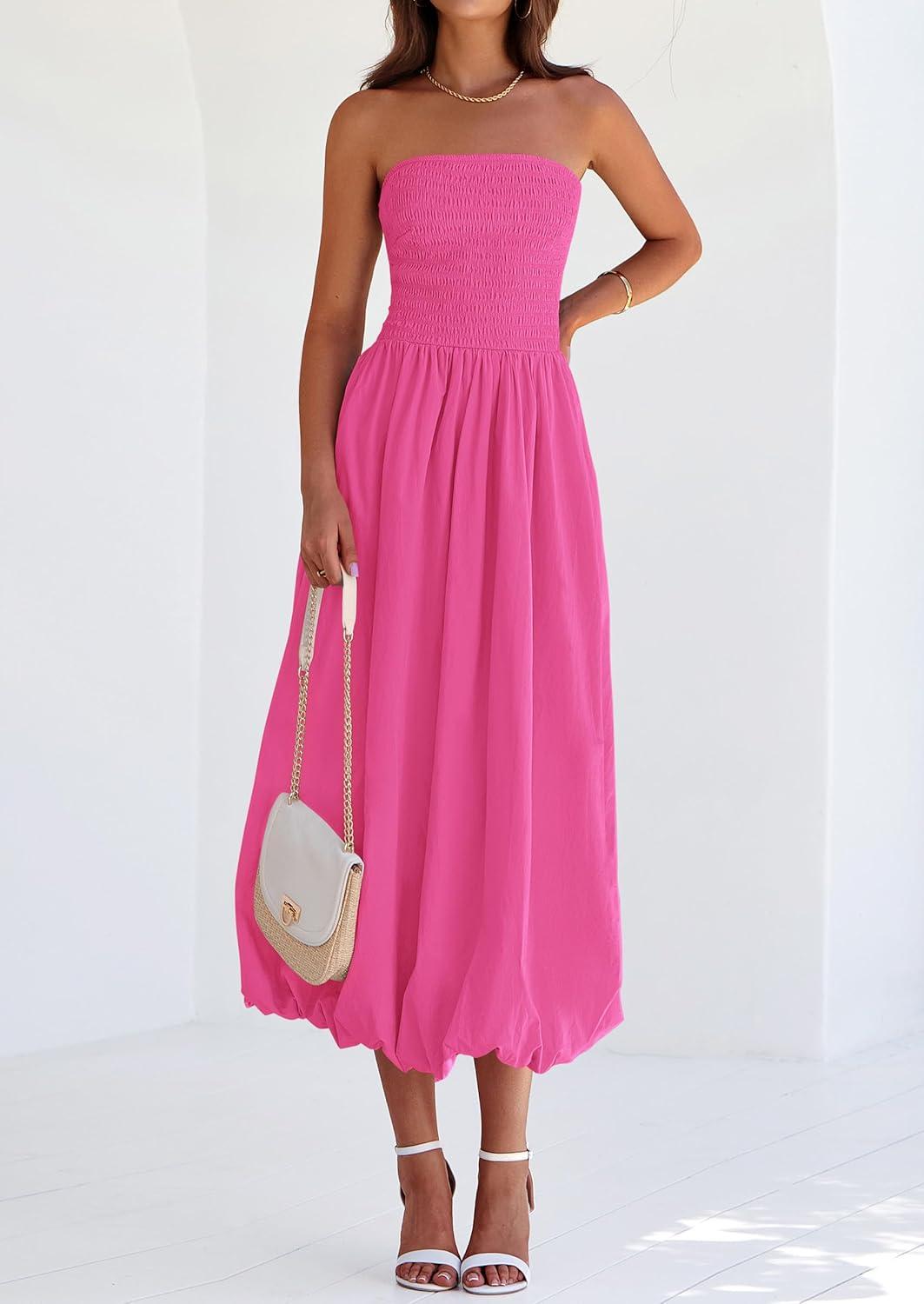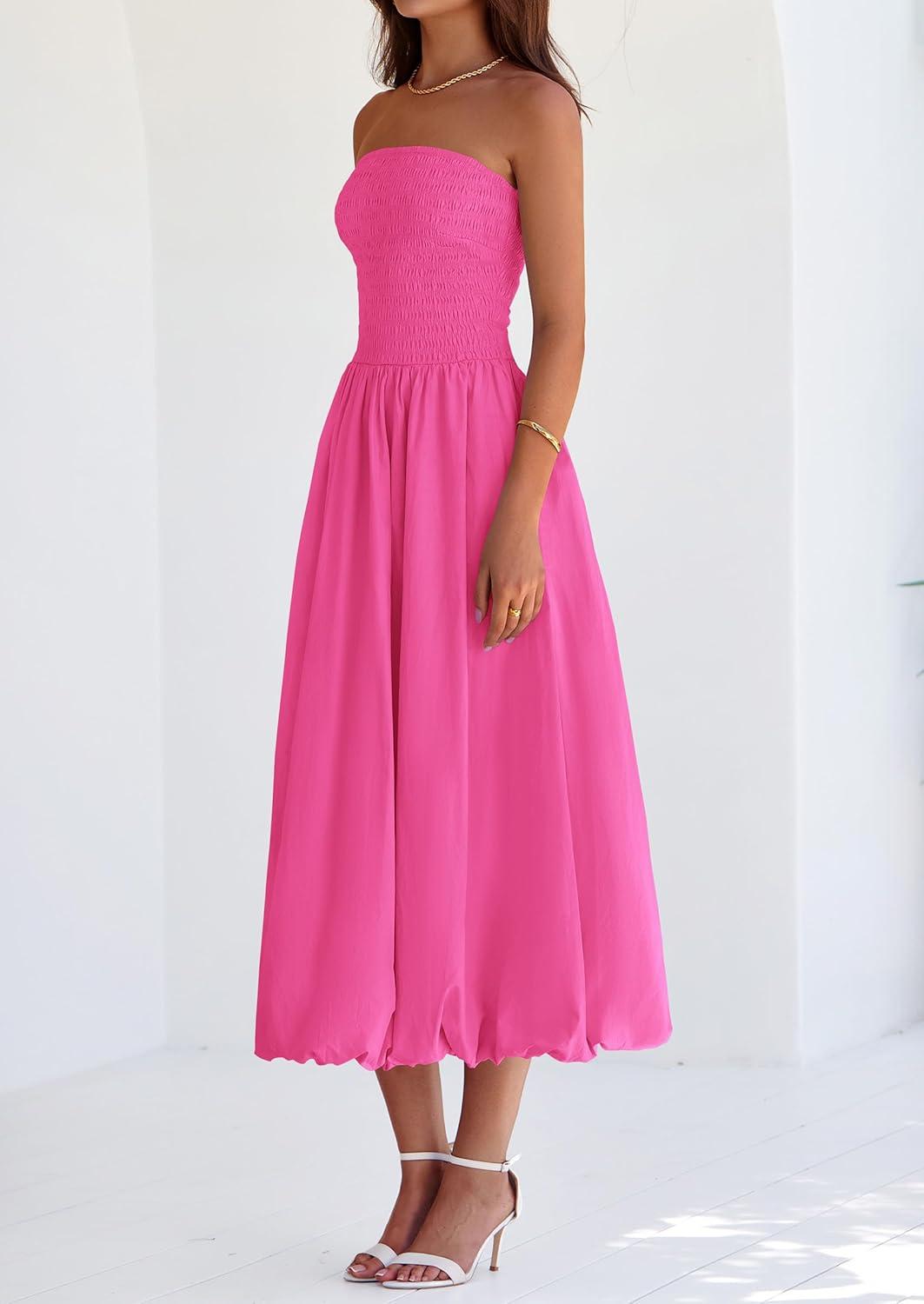 PRETTYGARDEN Women's 2025 Summer Strapless Tube Midi Dress Smocked A Line Bubble Long Flowy Casual Elegant Party Dresses(Rose Red)