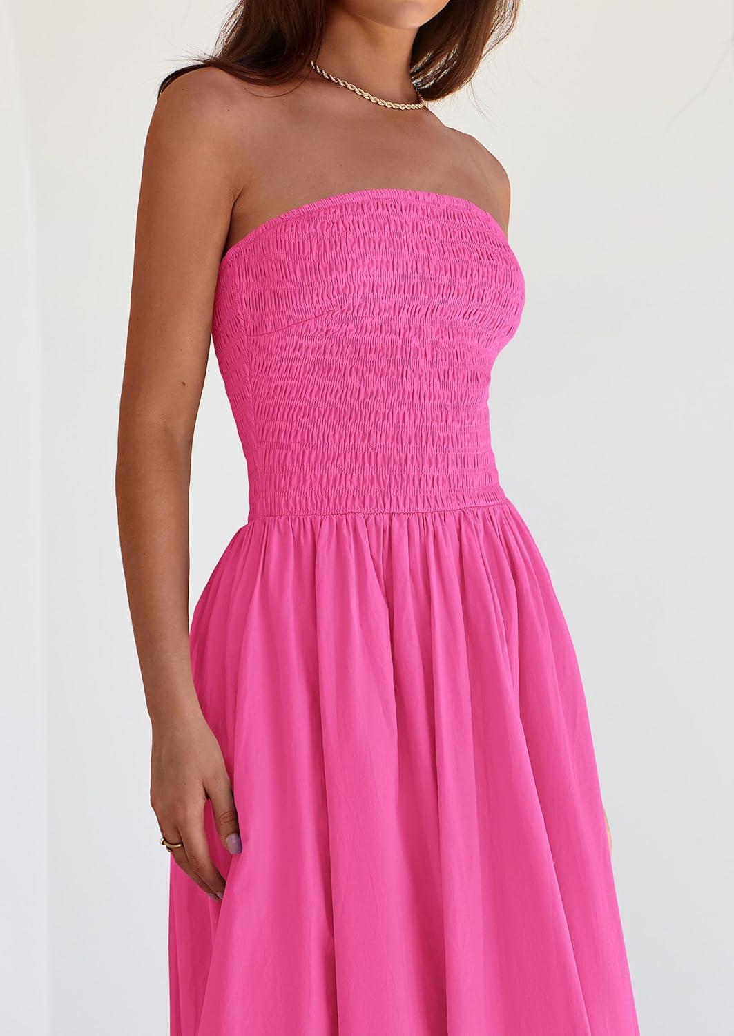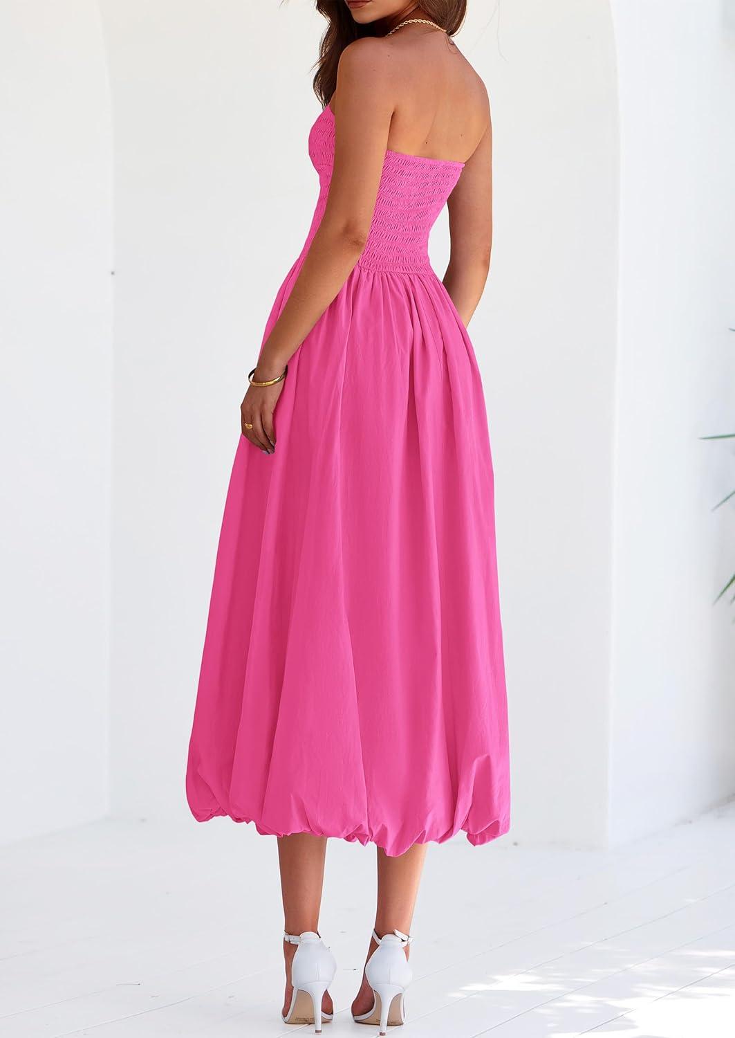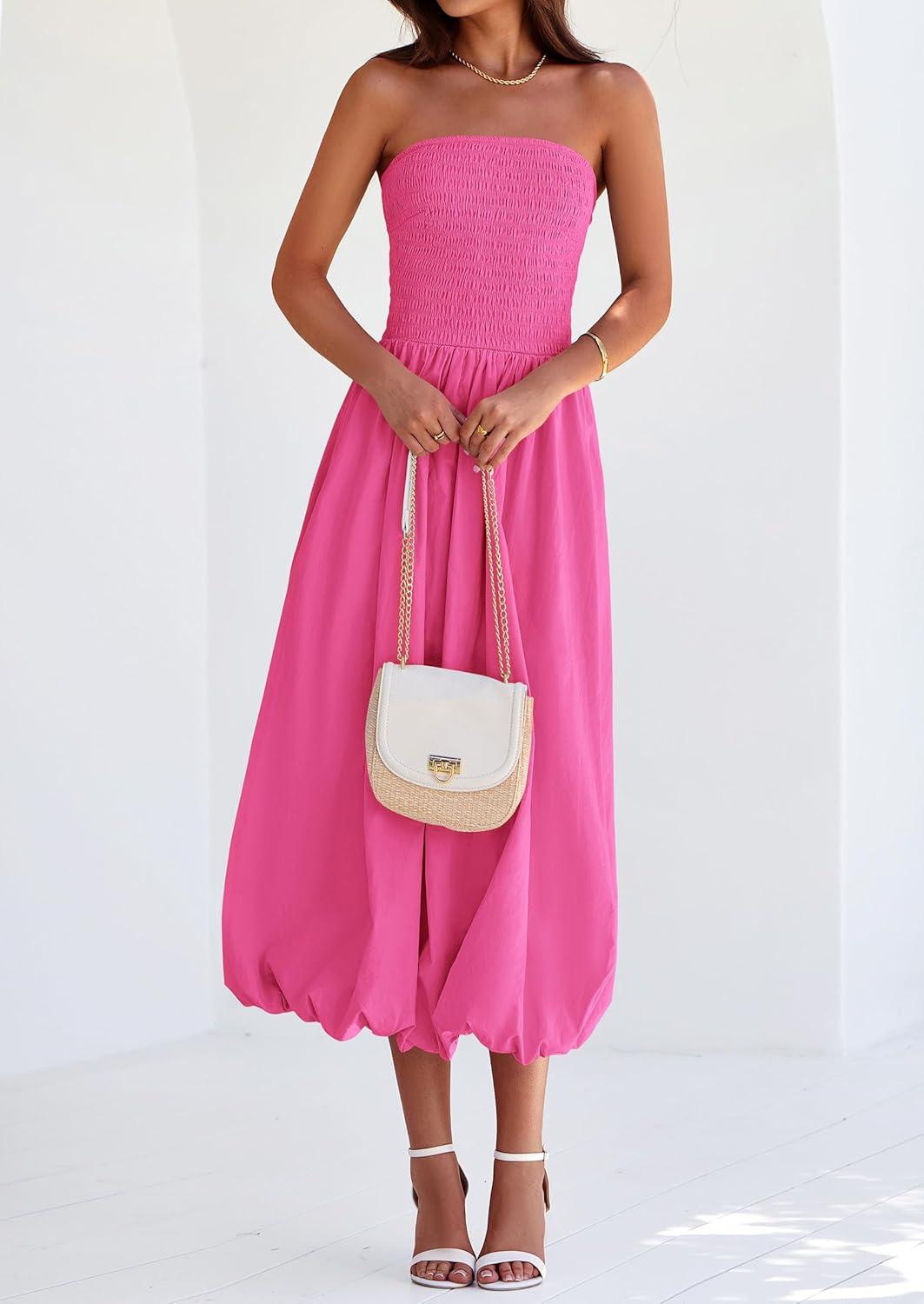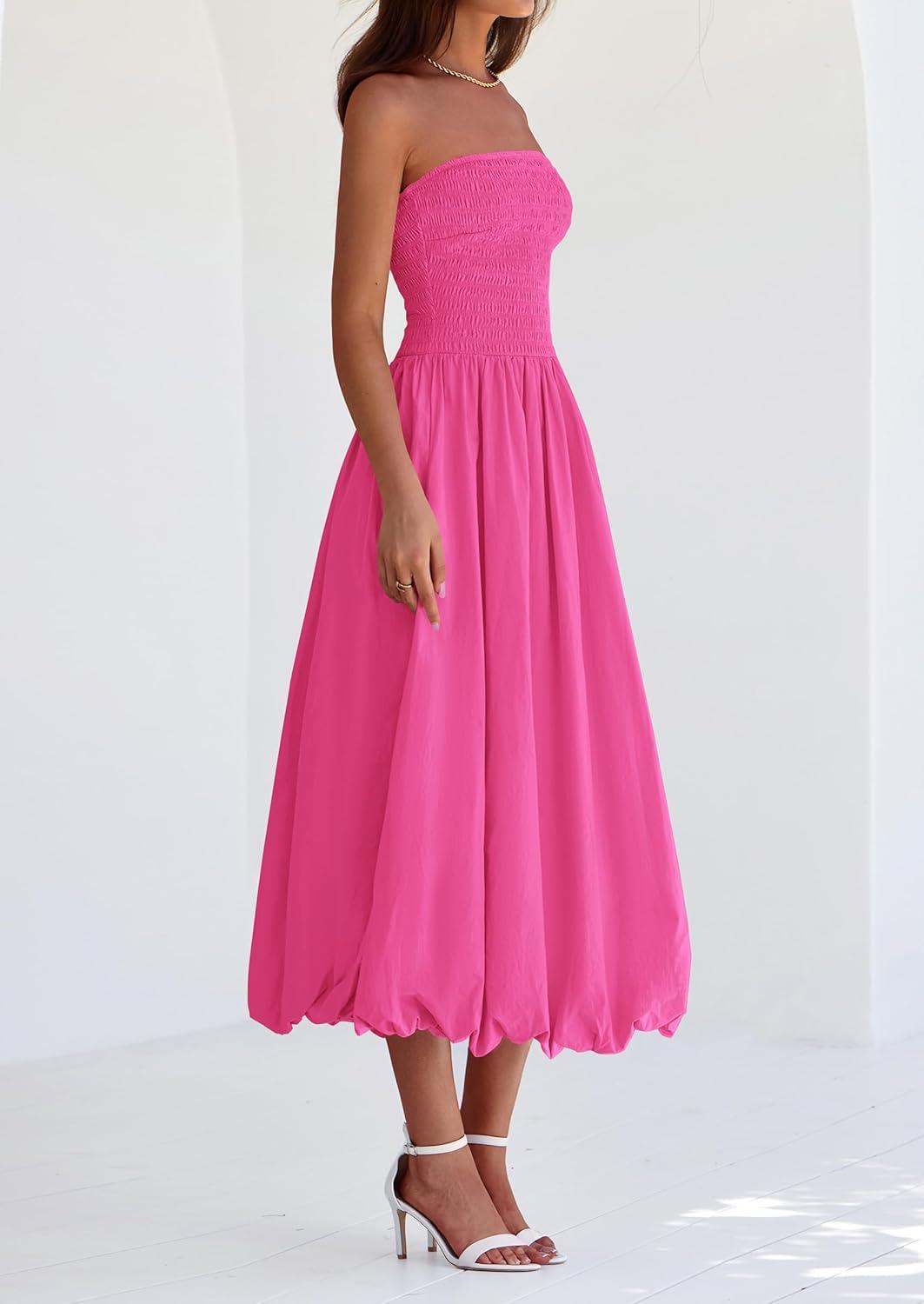 PRETTYGARDEN Women's 2025 Summer Strapless Tube Midi Dress Smocked A Line Bubble Long Flowy Casual Elegant Party Dresses(Rose Red)