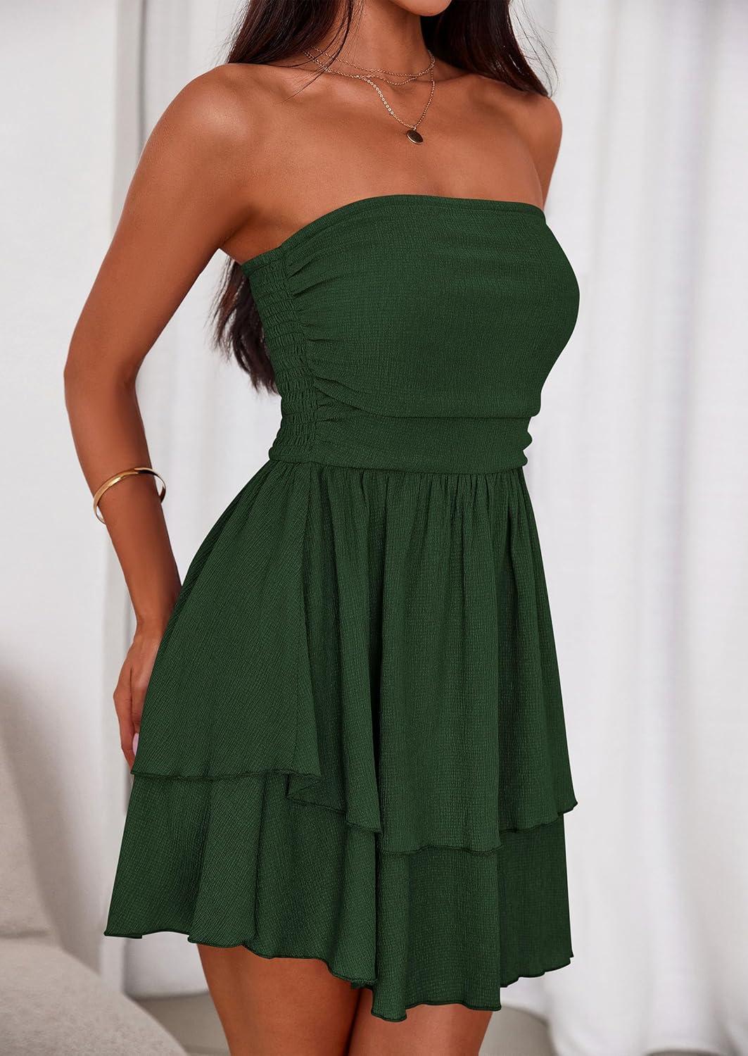 PRETTYGARDEN Women's 2025 Summer Strapless Tube Mini Dress Off Shoulder Smocked Ruffle A Line Flowy Short Party Club Dresses(Dark Green)