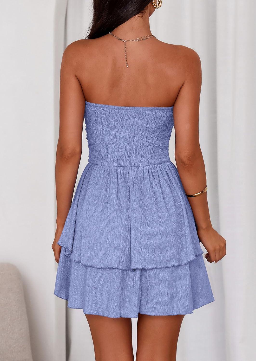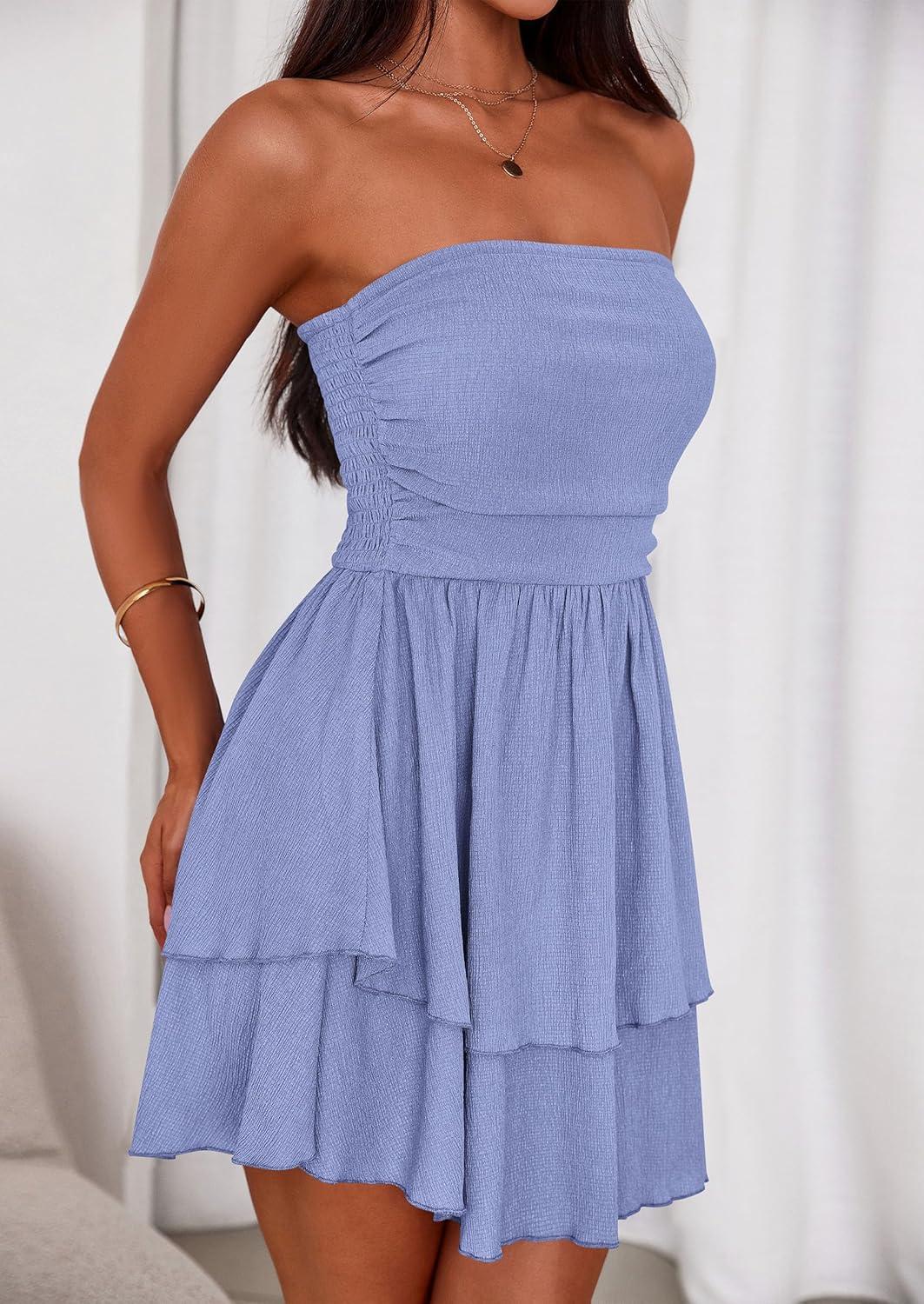 PRETTYGARDEN Women's 2025 Summer Strapless Tube Mini Dress Off Shoulder Smocked Ruffle A Line Flowy Short Party Club Dresses(Light Blue)
