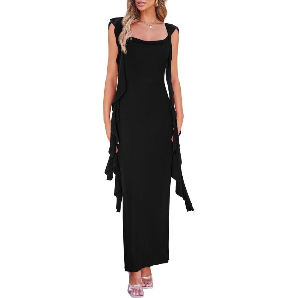 PRETTYGARDEN Women's 2025 Summer Wedding Guest Dress Sleeveless Ruffle Formal Cocktail Party Maxi Bodycon Dresses(Black)
