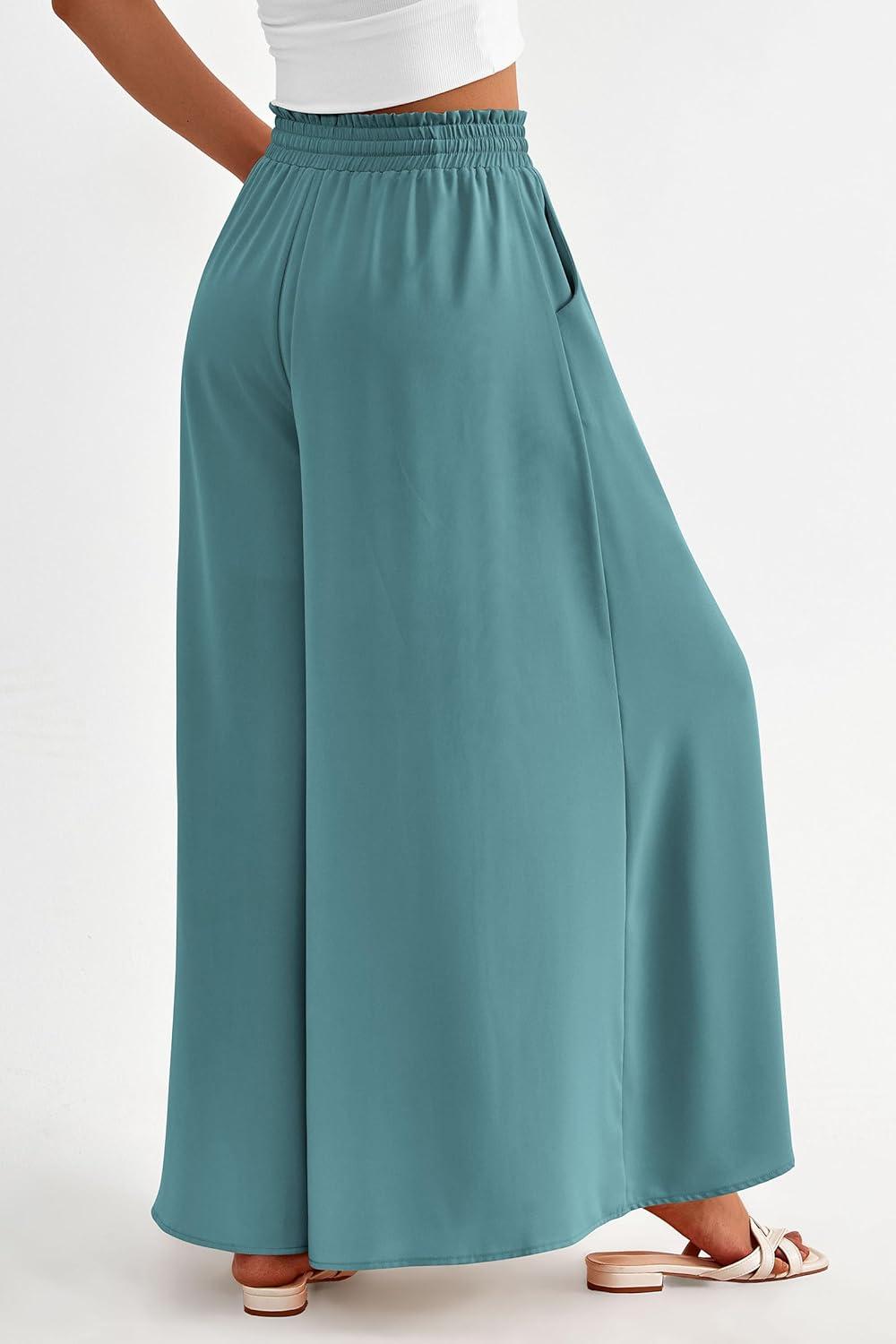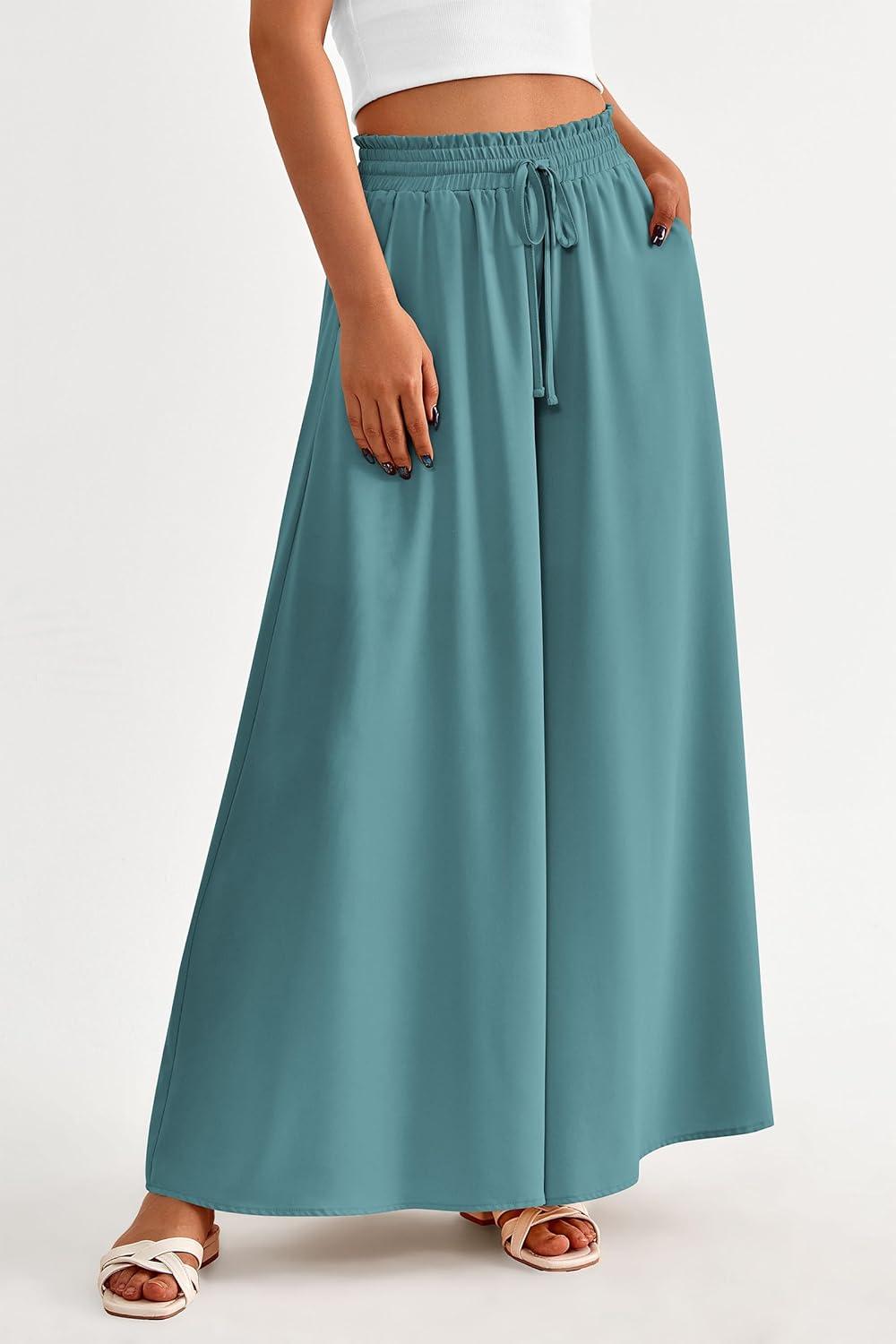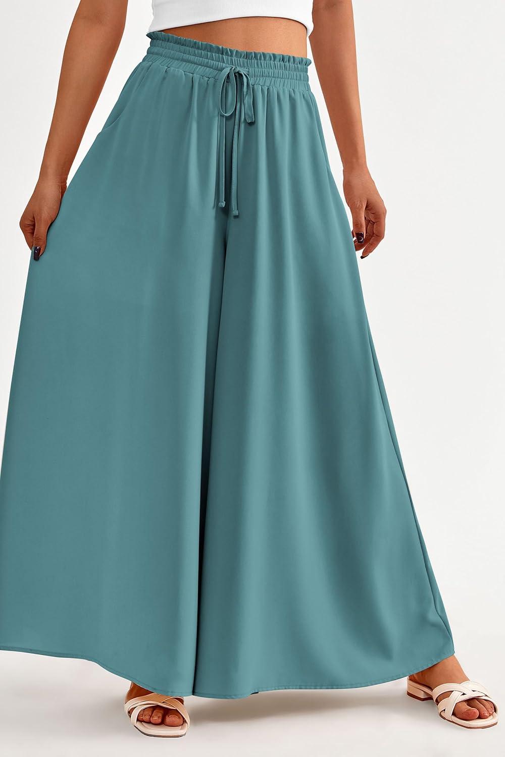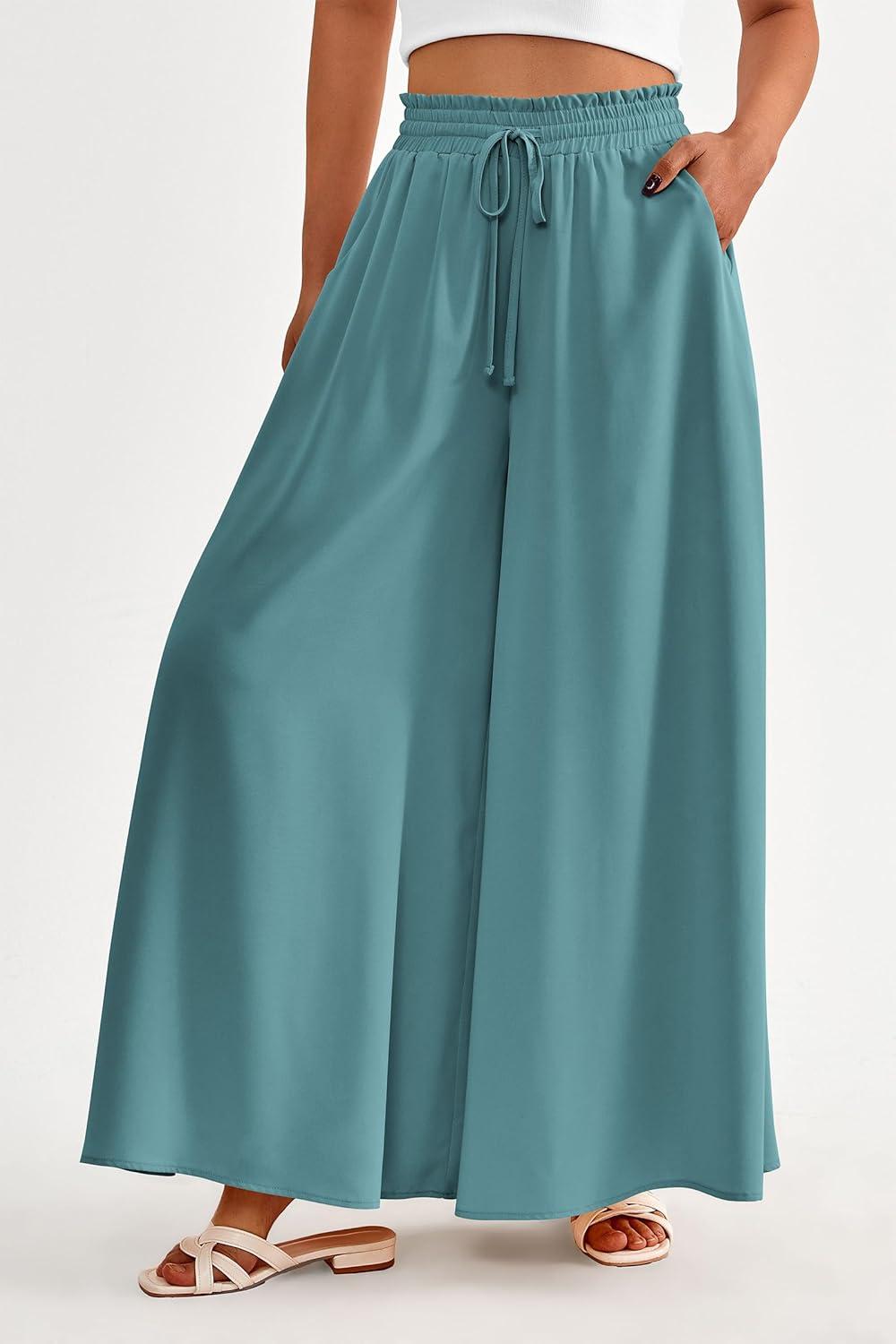 PRETTYGARDEN Women’s 2025 Summer Wide Leg Palazzo Pants High Waisted Flowy Pockets Trendy Casual Lounge Boho Beach Trousers(Blue Green)