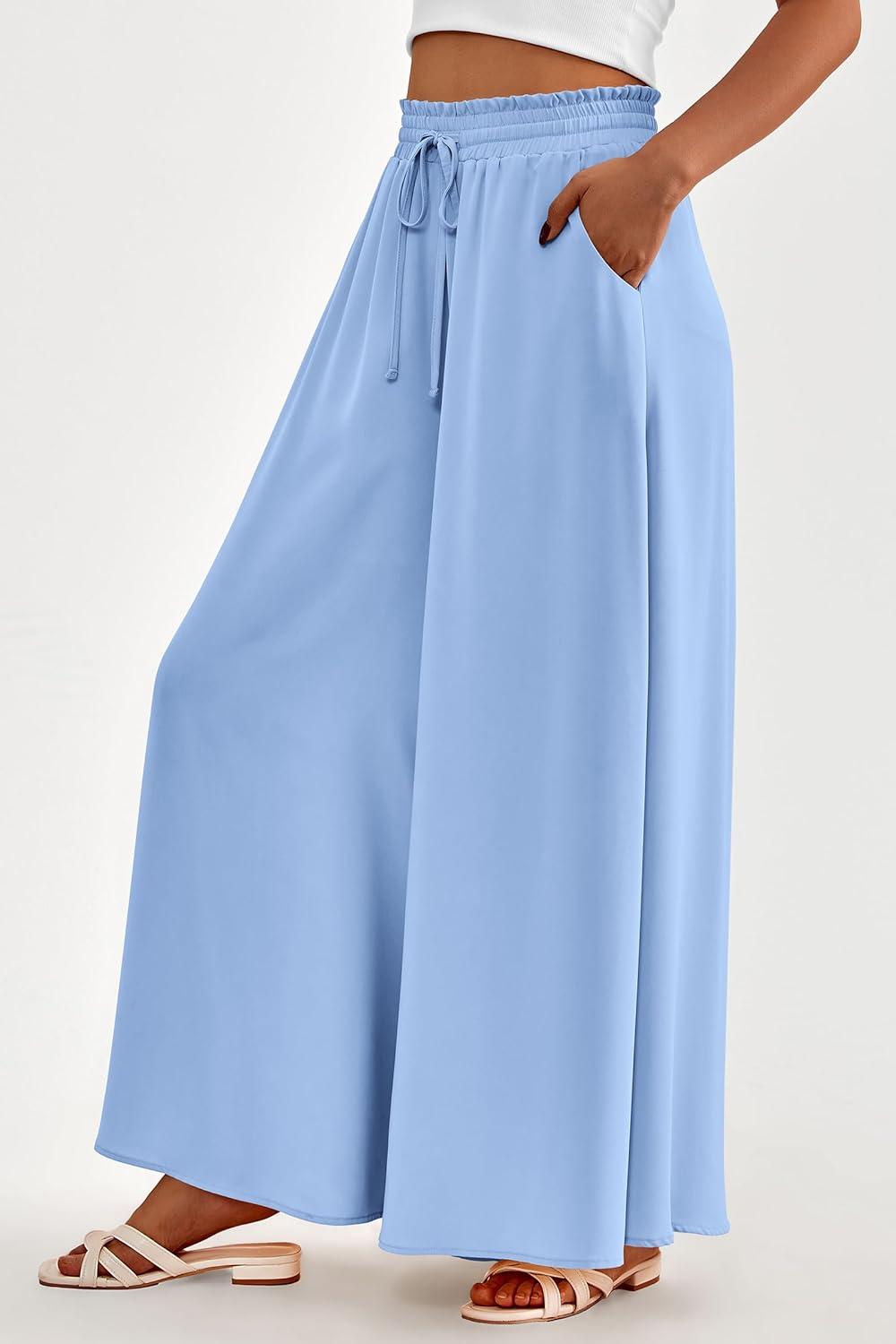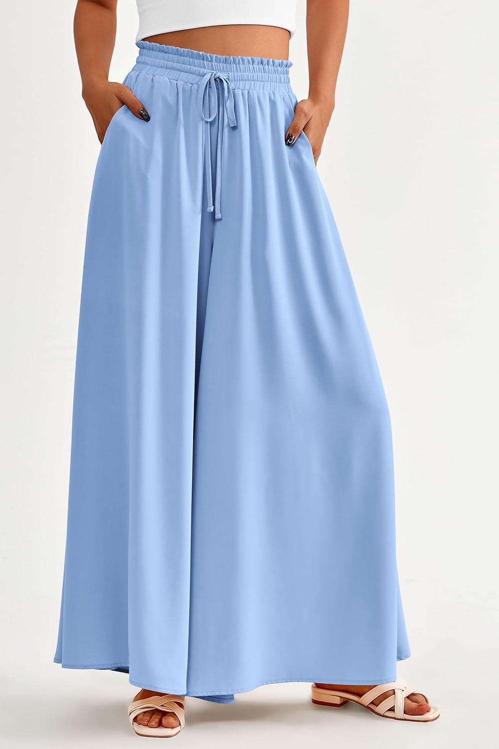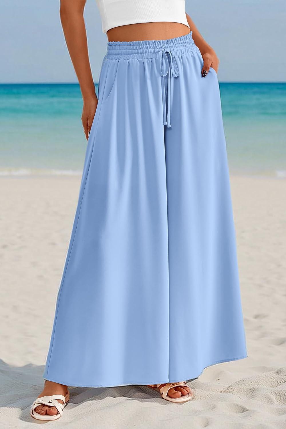 PRETTYGARDEN Women's 2025 Summer Wide Leg Palazzo Pants High Waisted Flowy Pockets Trendy Casual Lounge Boho Beach Trousers(Blue)