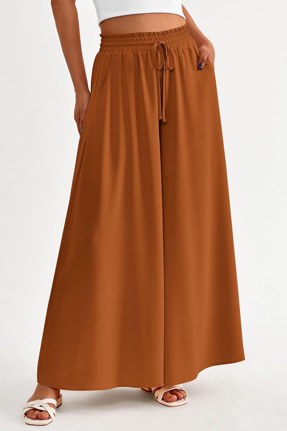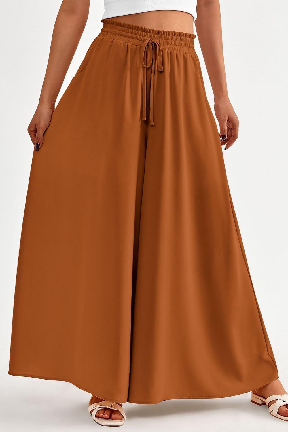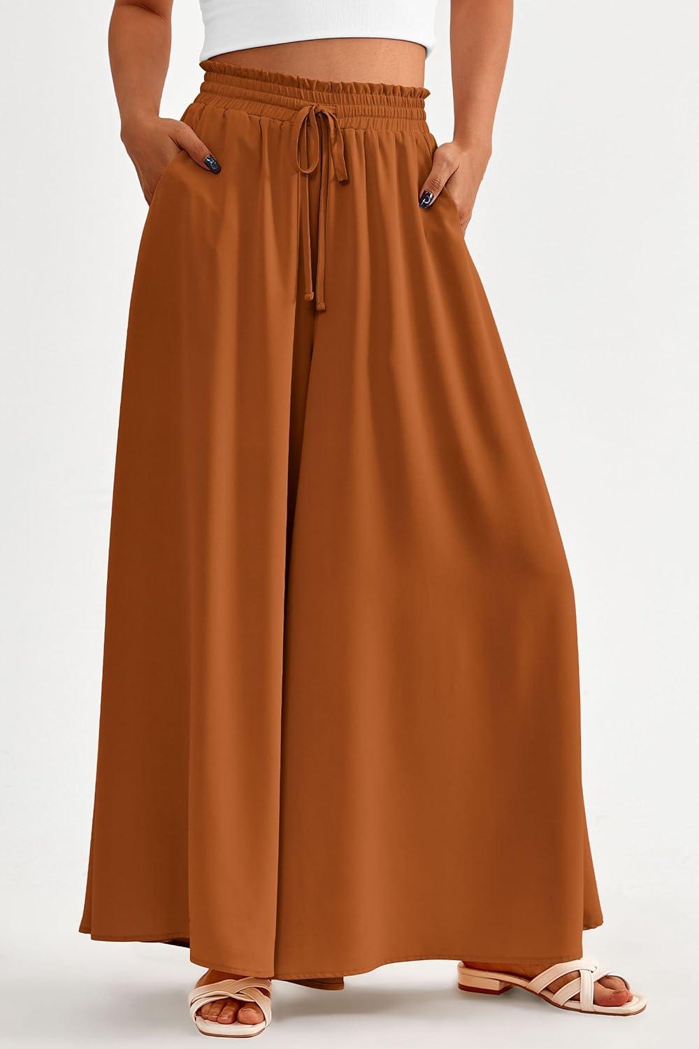 PRETTYGARDEN Women's 2025 Summer Wide Leg Palazzo Pants High Waisted Flowy Pockets Trendy Casual Lounge Boho Beach Trousers(Brown)