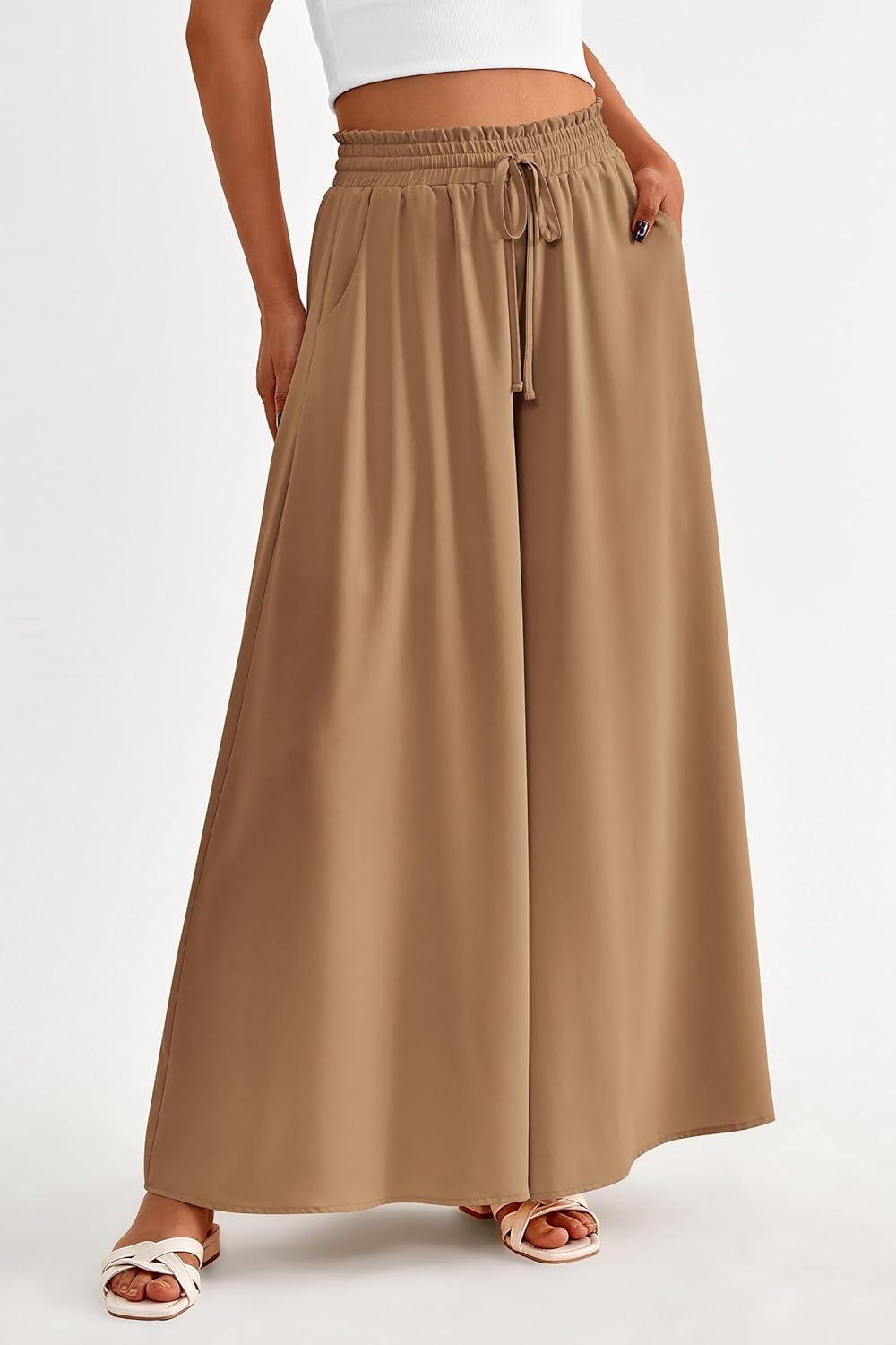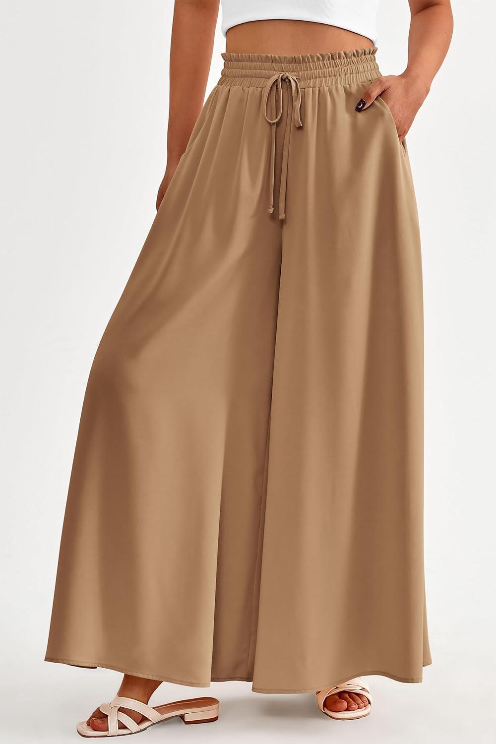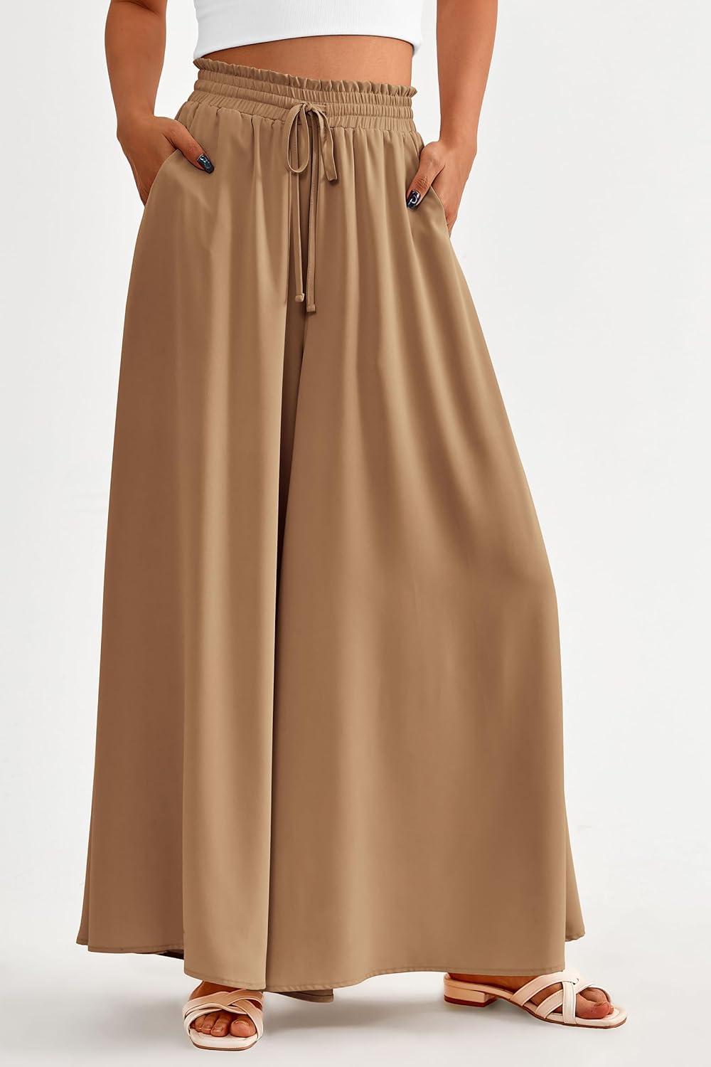 PRETTYGARDEN Women's 2025 Summer Wide Leg Palazzo Pants High Waisted Flowy Pockets Trendy Casual Lounge Boho Beach Trousers(Khaki)