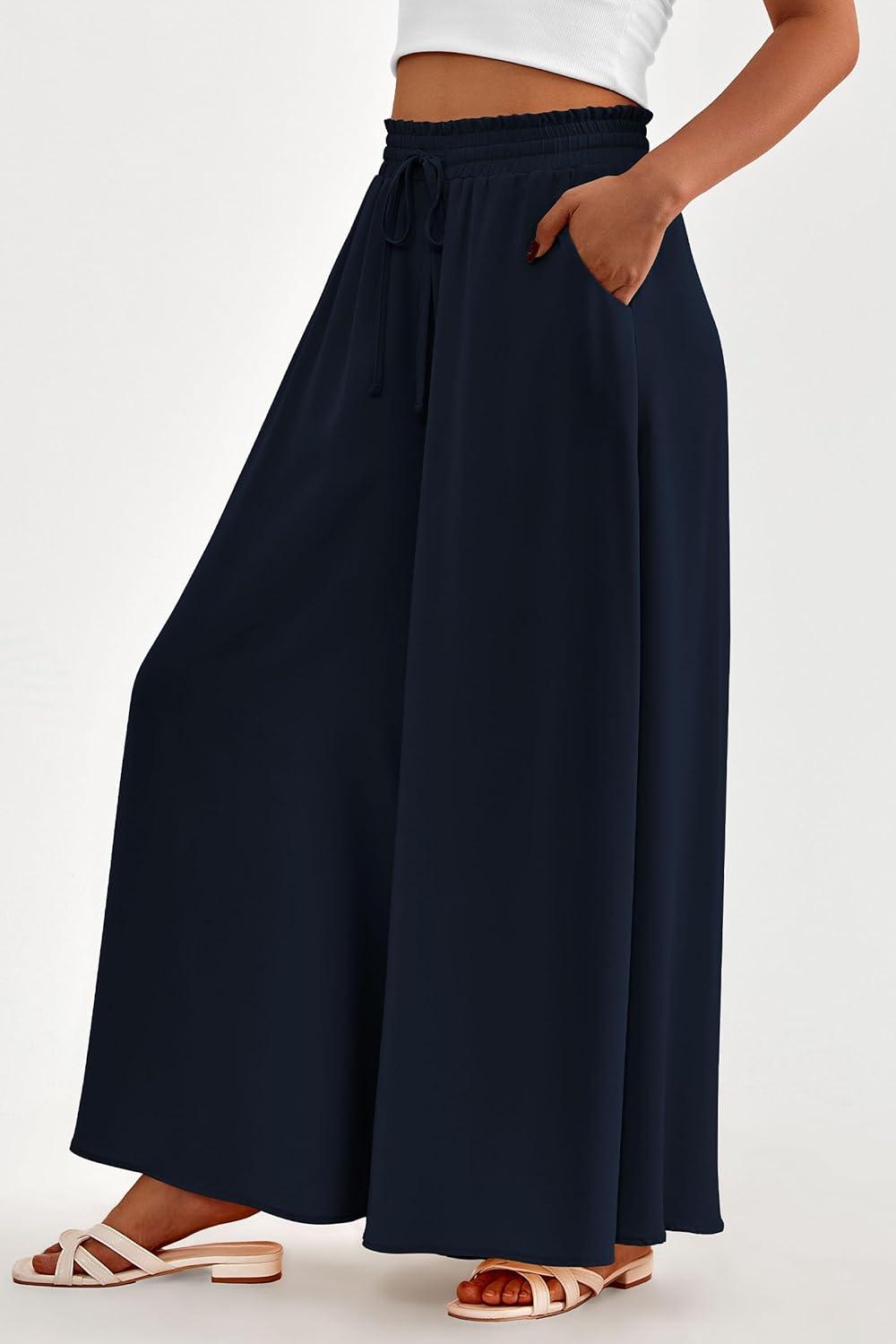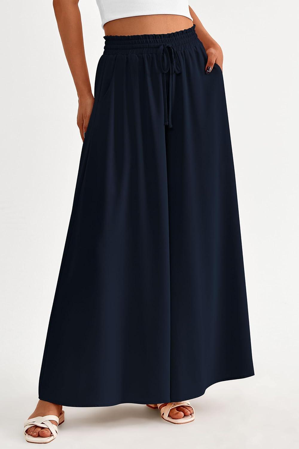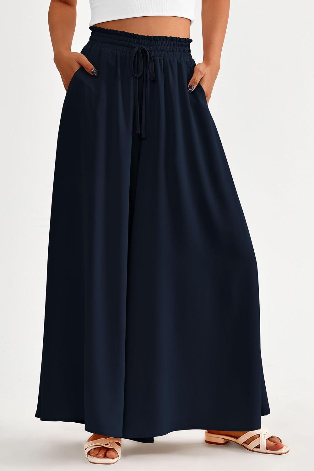 PRETTYGARDEN Women's 2025 Summer Wide Leg Palazzo Pants High Waisted Flowy Pockets Trendy Casual Lounge Boho Beach Trousers(Navy)