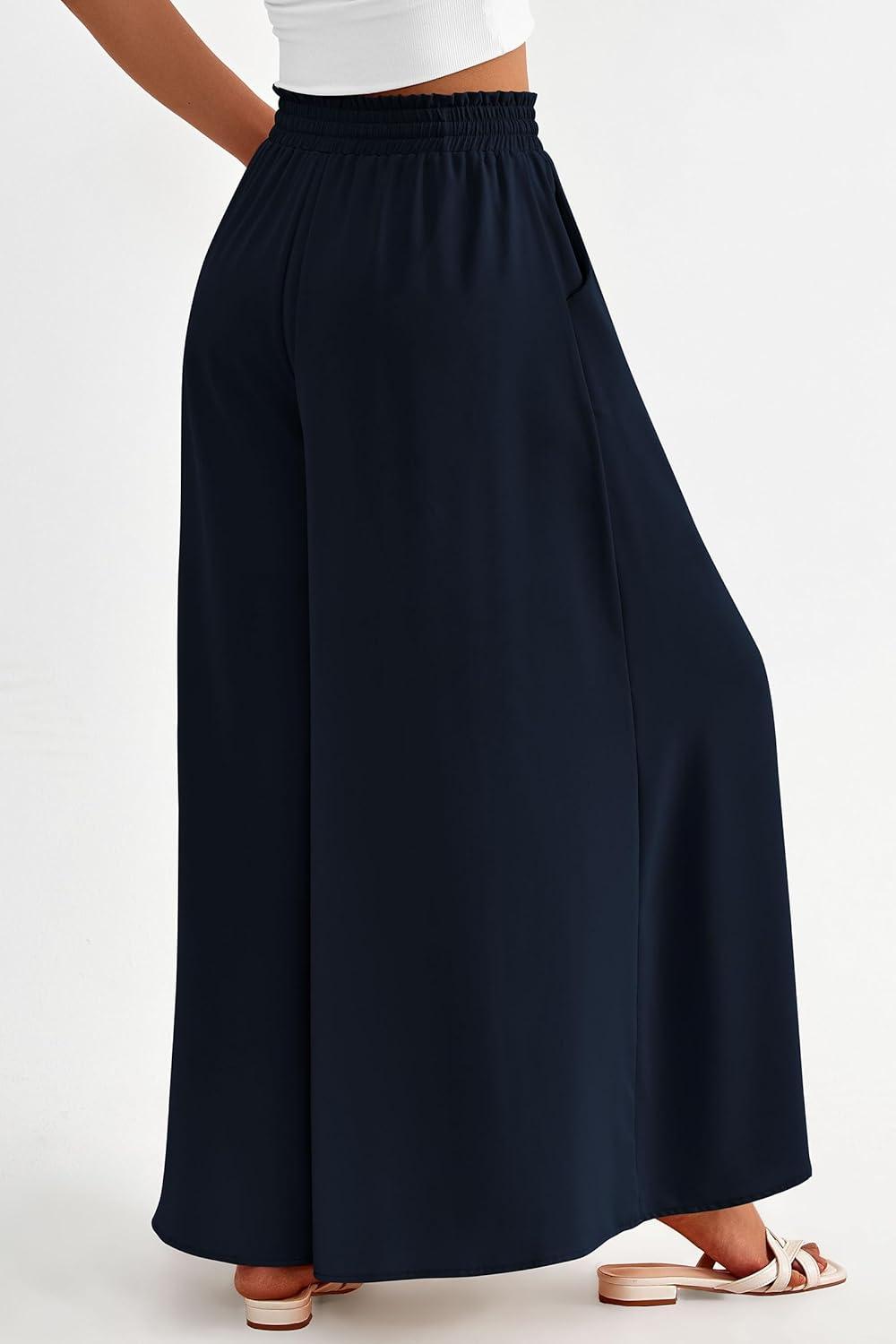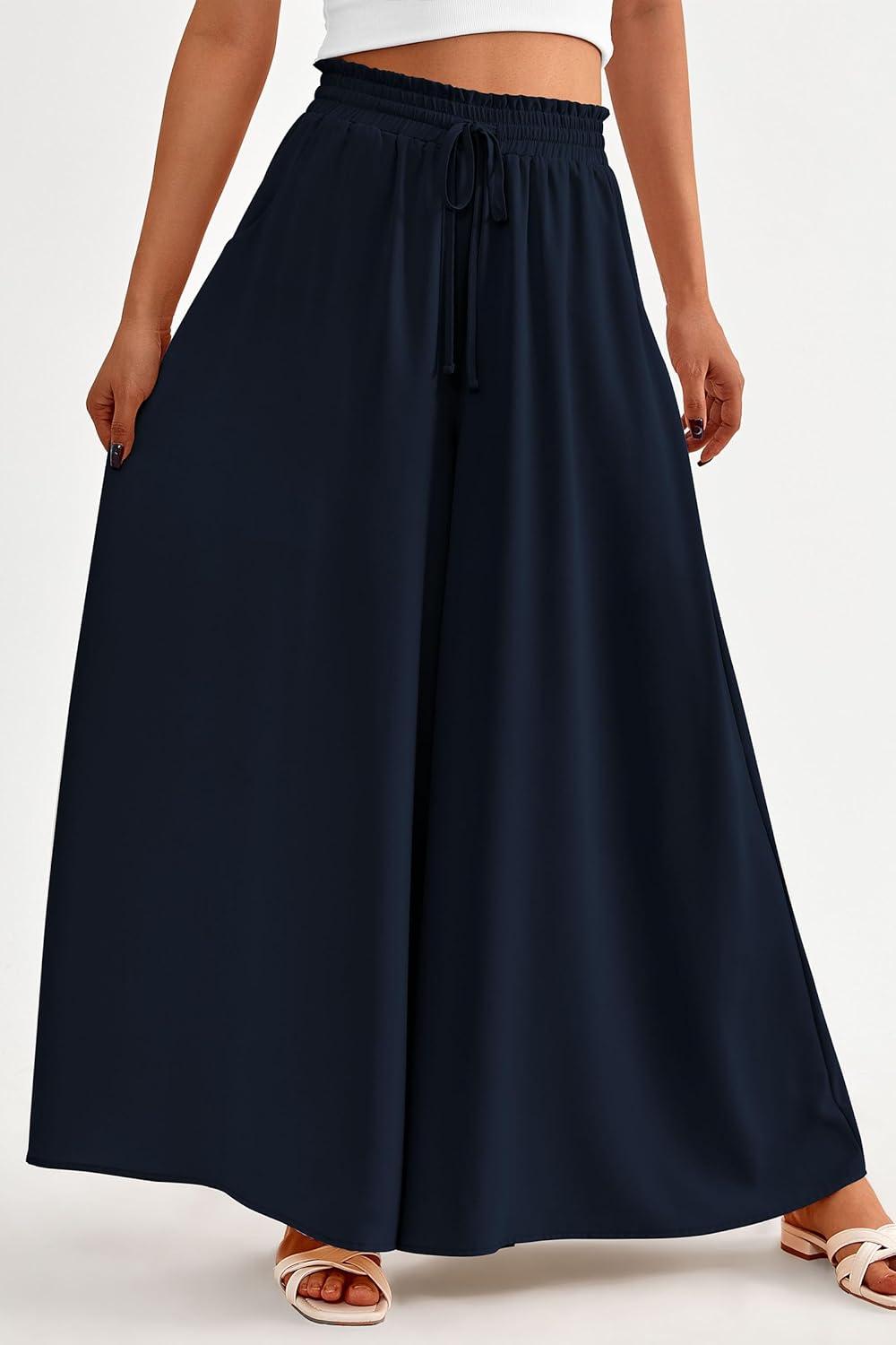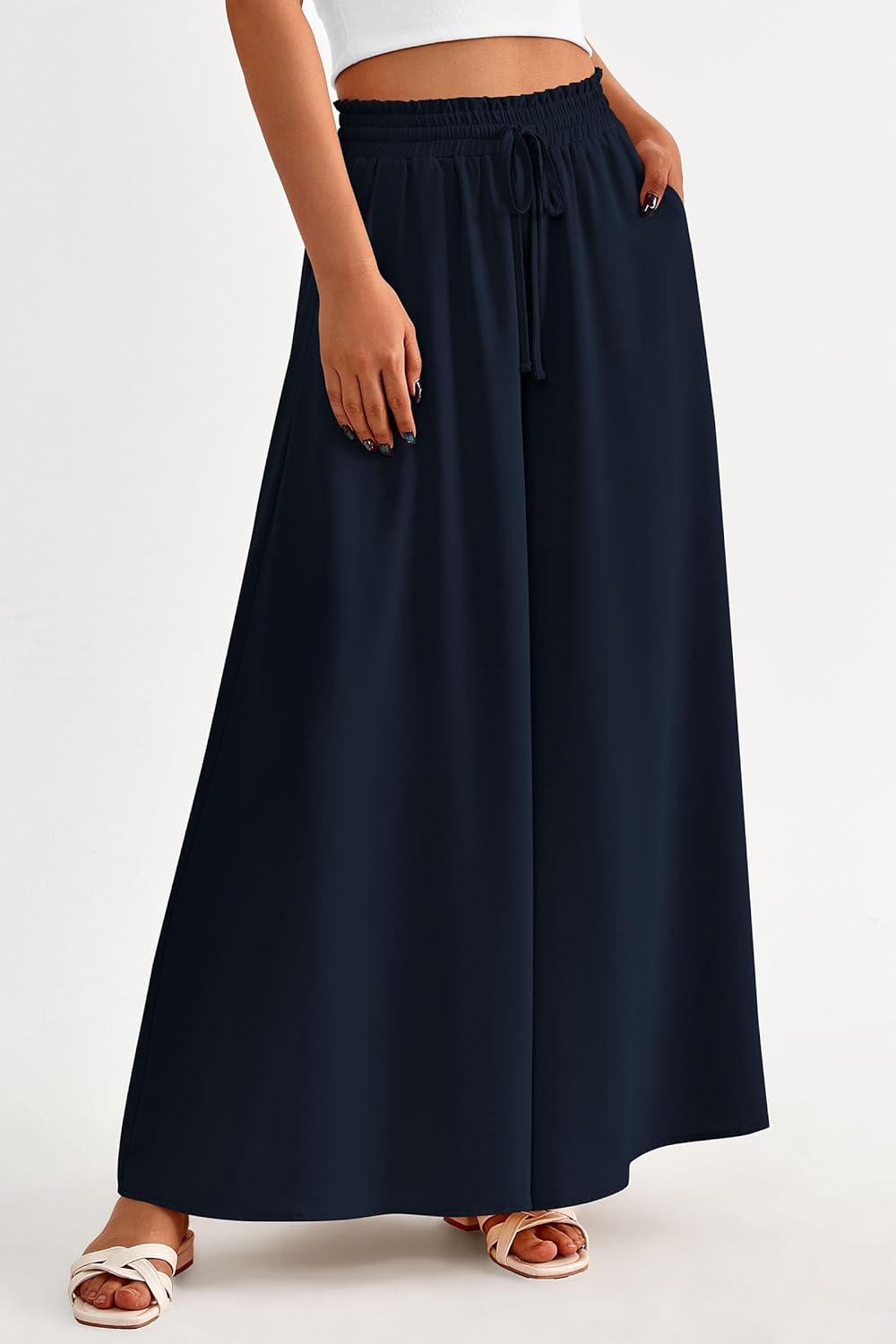 PRETTYGARDEN Women's 2025 Summer Wide Leg Palazzo Pants High Waisted Flowy Pockets Trendy Casual Lounge Boho Beach Trousers(Navy)
