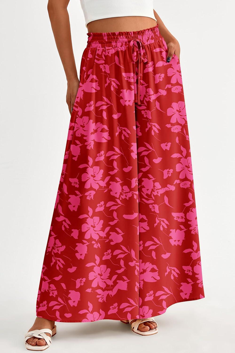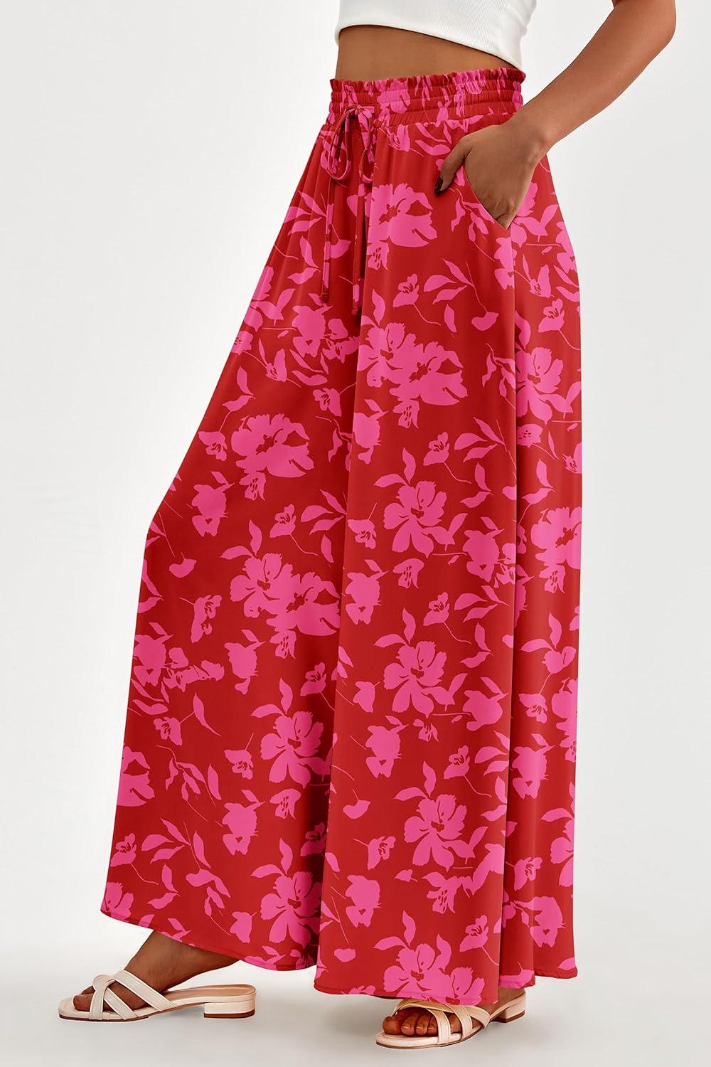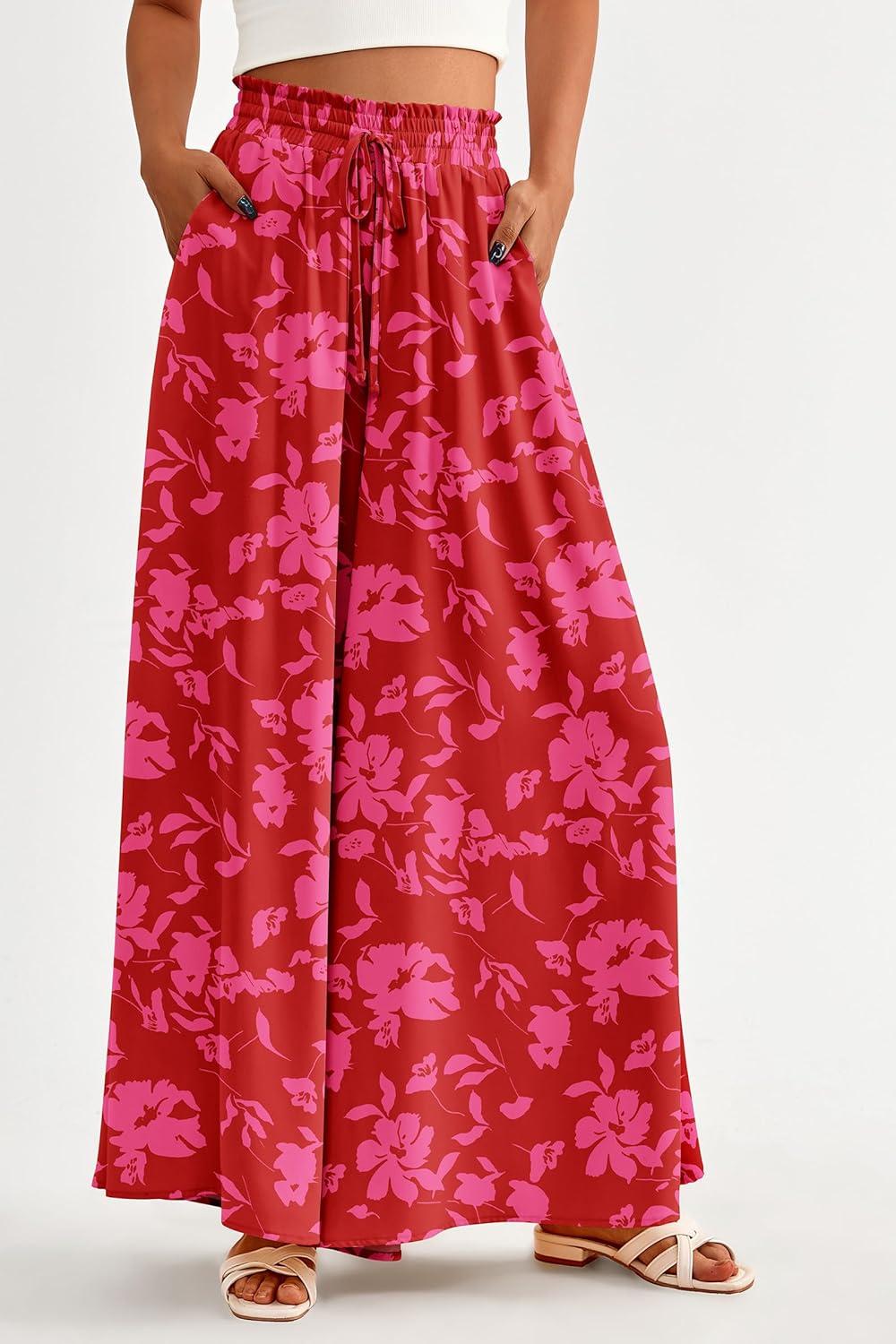 PRETTYGARDEN Women's 2025 Summer Wide Leg Palazzo Pants High Waisted Flowy Pockets Trendy Casual Lounge Boho Beach Trousers(Print Red)