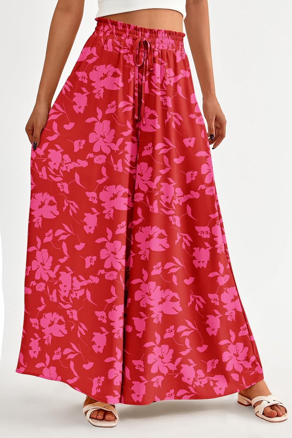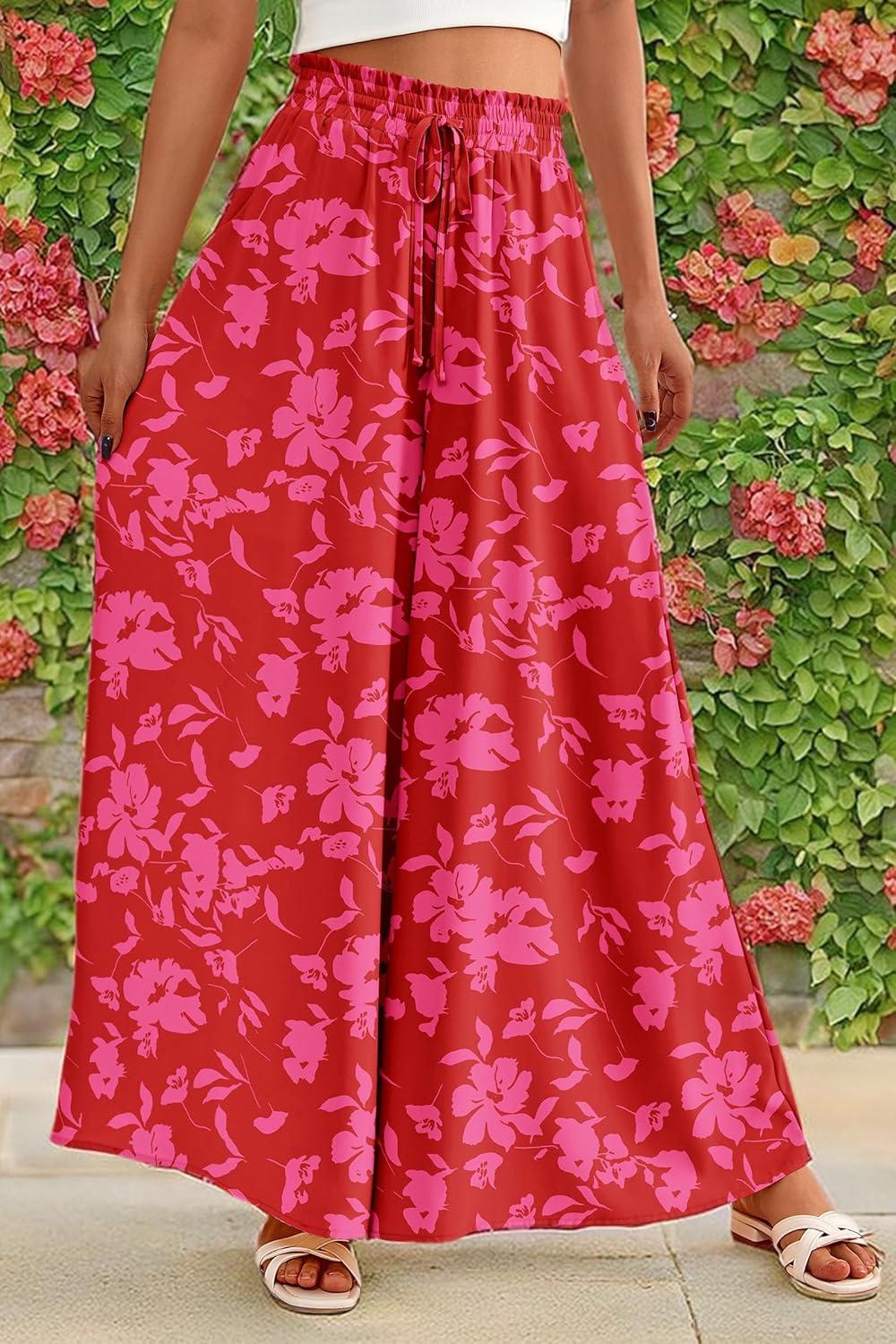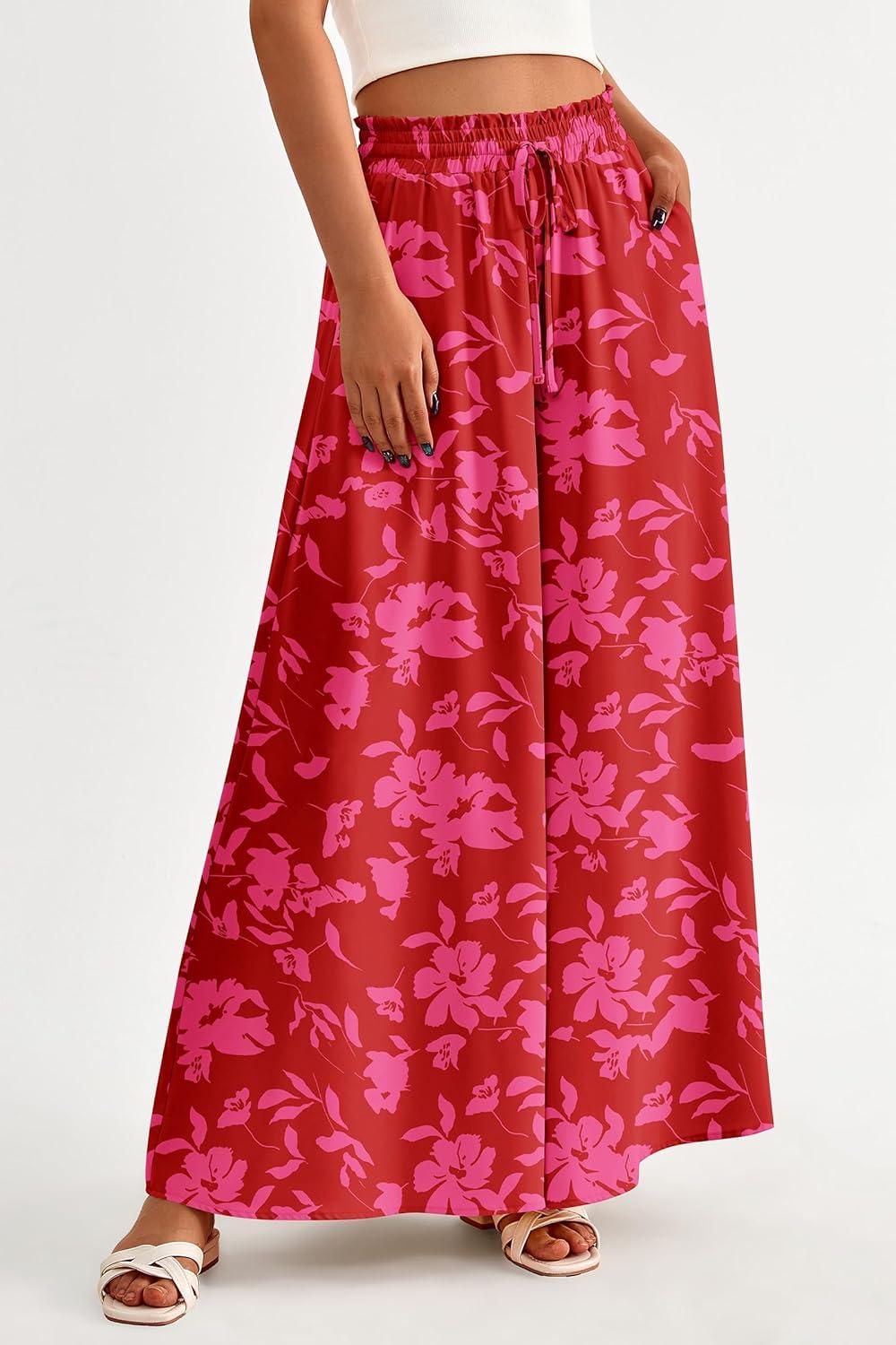 PRETTYGARDEN Women's 2025 Summer Wide Leg Palazzo Pants High Waisted Flowy Pockets Trendy Casual Lounge Boho Beach Trousers(Print Red)