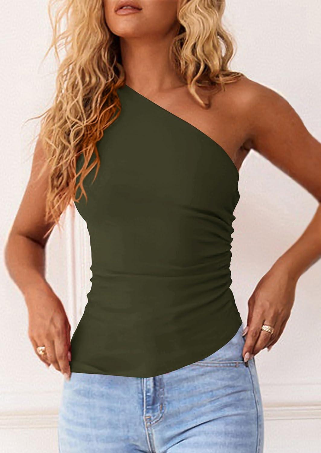 PRETTYGARDEN Womens 2025 Summer Y2K Tops Sleeveless One Shoulder Slim Fit Shirts Ruched Knit Asymmetrical Top Blouse(Army Green)