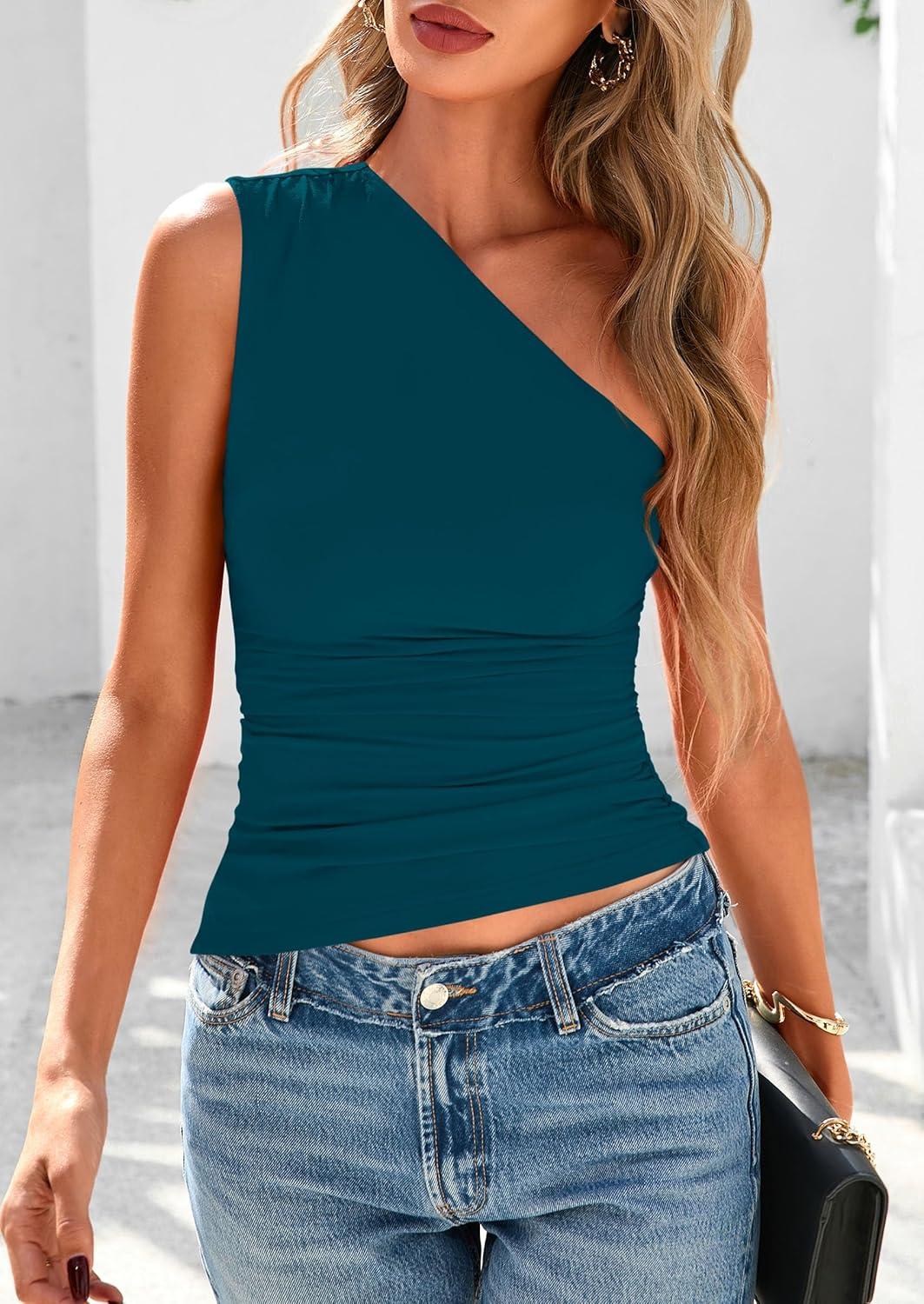 PRETTYGARDEN Womens 2025 Summer Y2K Tops Sleeveless One Shoulder Slim Fit Shirts Ruched Knit Asymmetrical Top Blouse(Dark Blue)