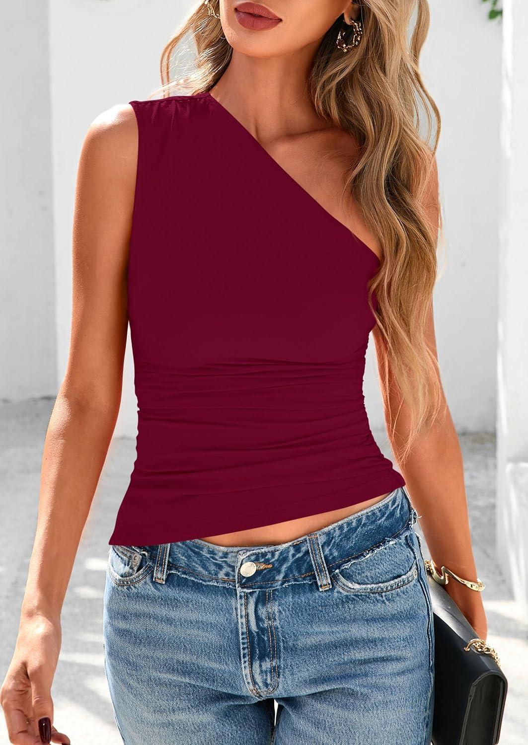 PRETTYGARDEN Womens 2025 Summer Y2K Tops Sleeveless One Shoulder Slim Fit Shirts Ruched Knit Asymmetrical Top Blouse(Wine Red)