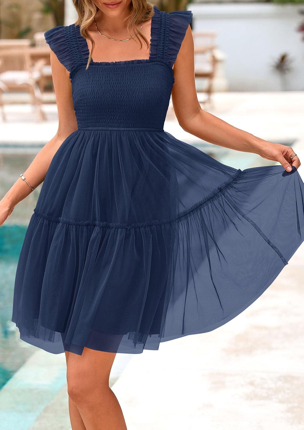 PRETTYGARDEN Womens 2025 Trendy Mini Summer Dresses Sleeveless Tulle Ruffle Square Neck Tiered Smocked Beach Vacation Dress(Navy)