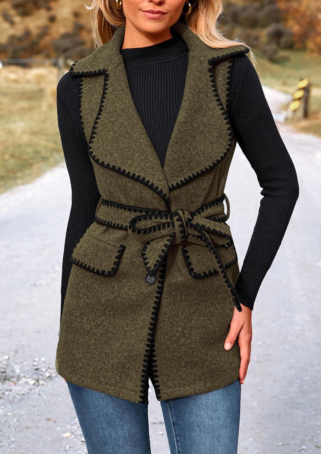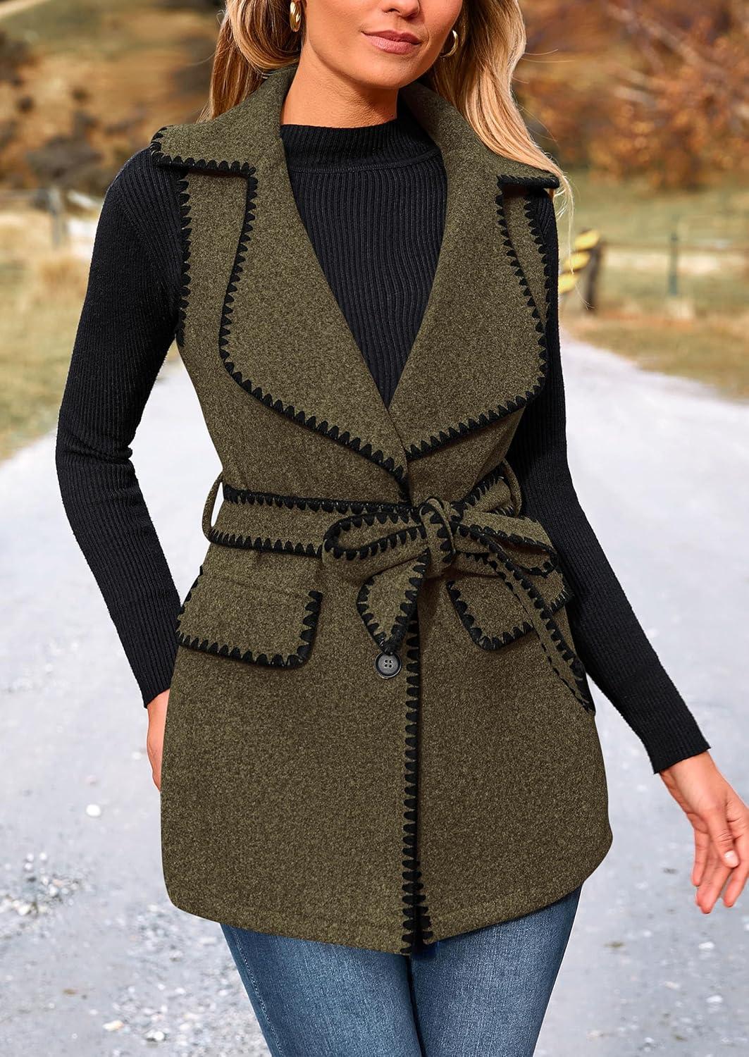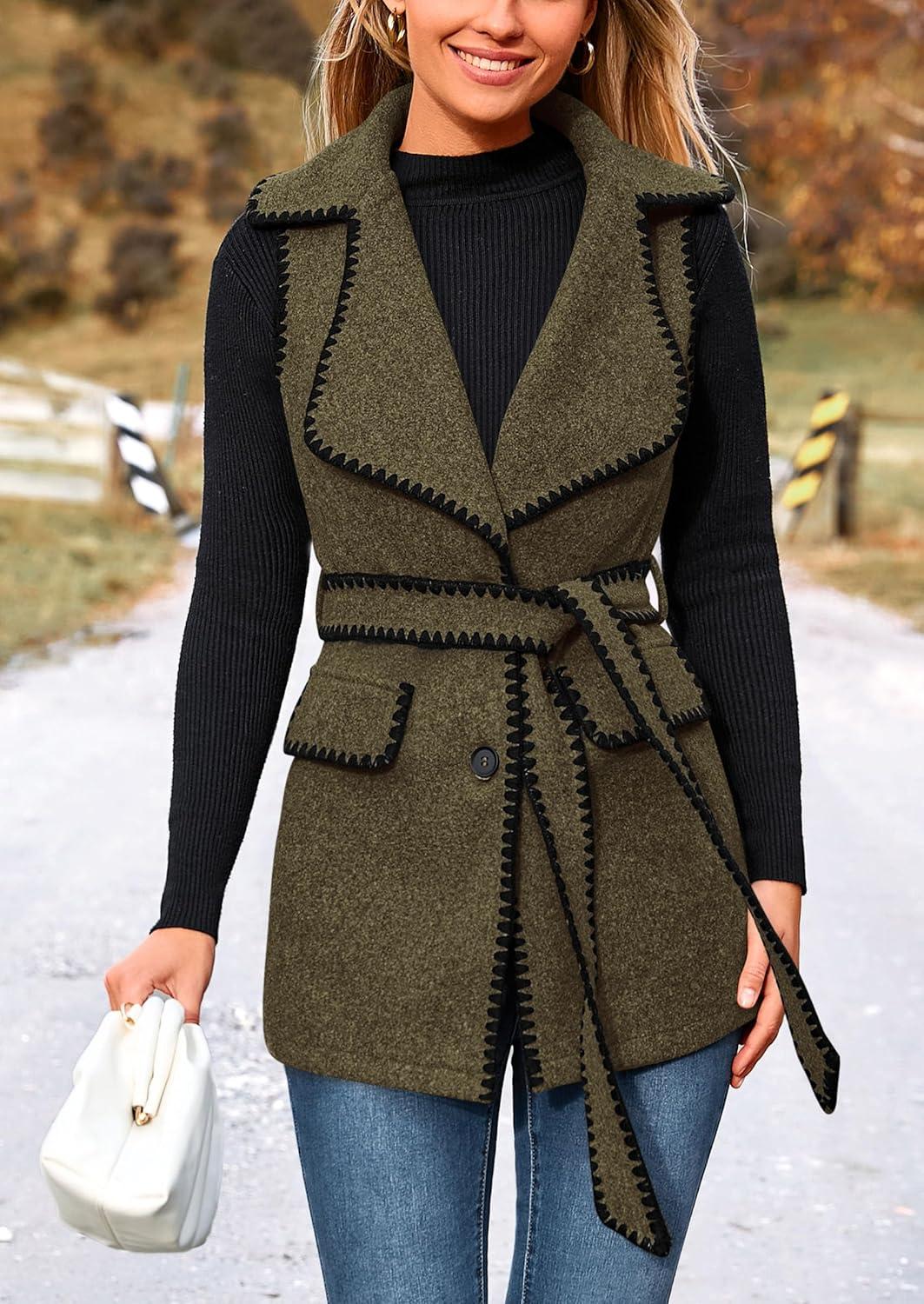 PRETTYGARDEN Women’s 2025 Tweed Vest Jackets Sleeveless Lapel Button Front Belt Color Block Winter Cardigan Outerwear(Army Green)