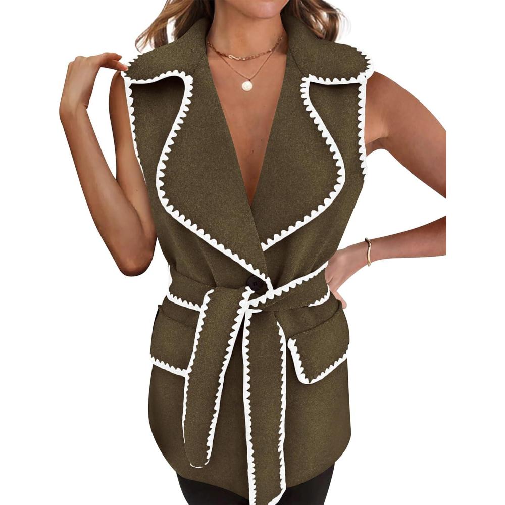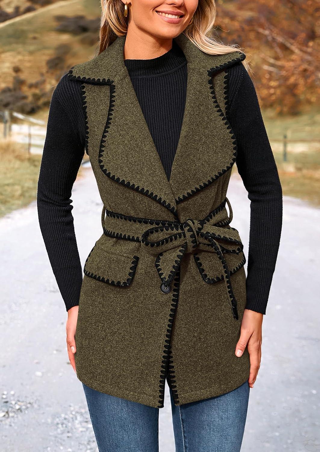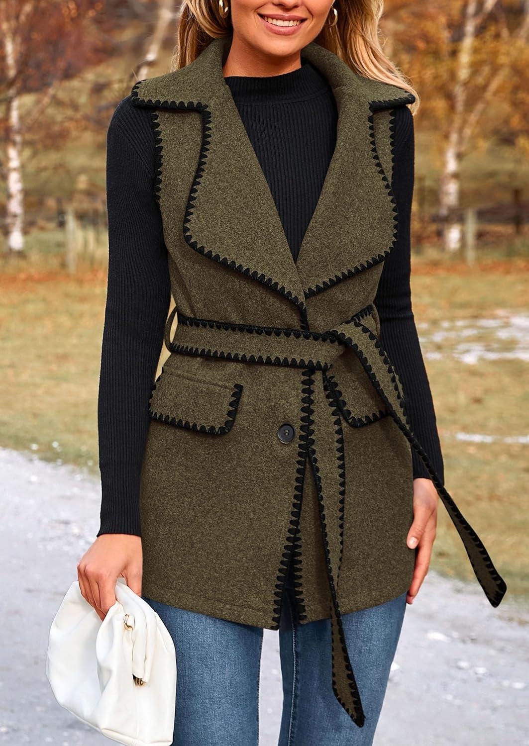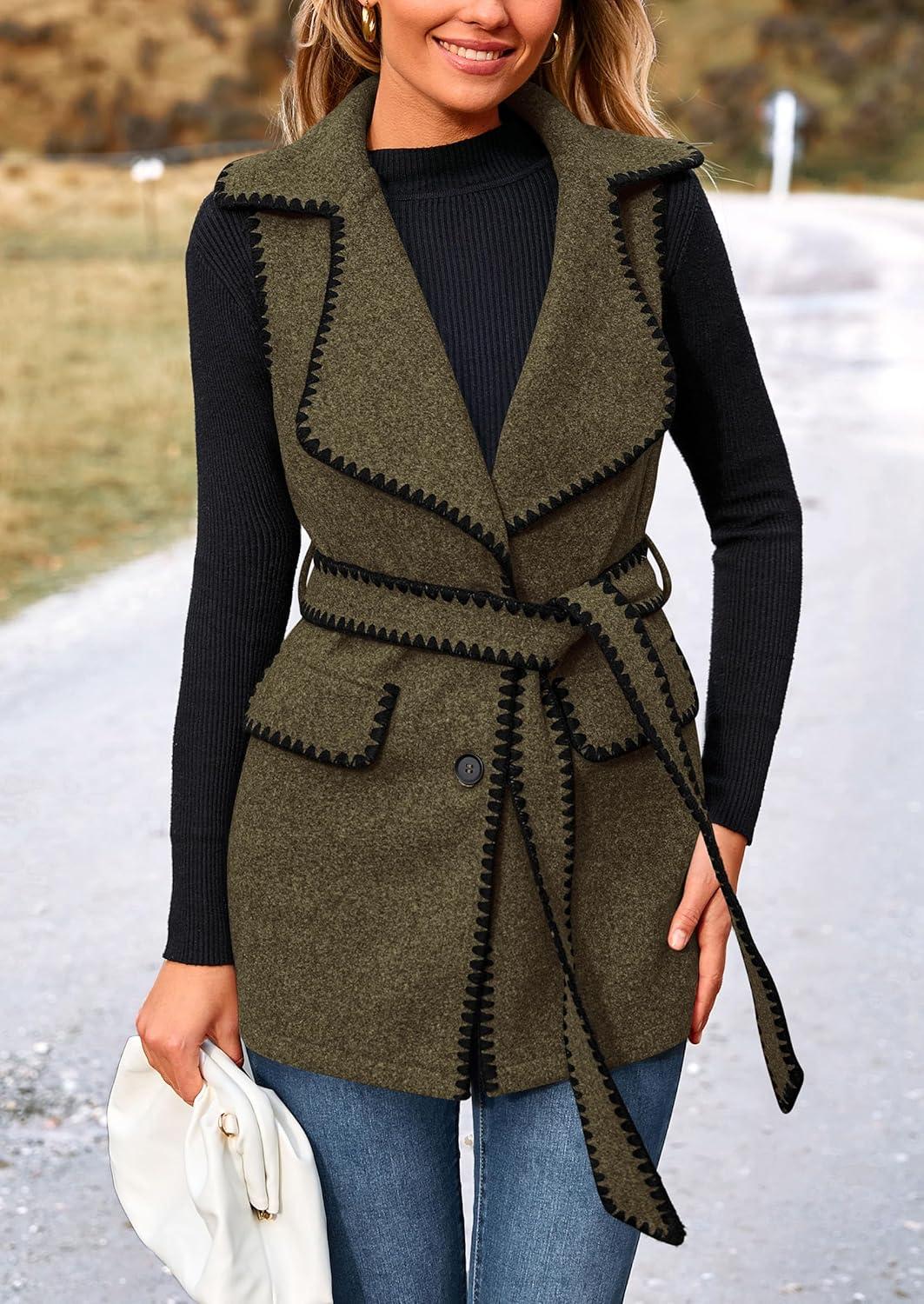 PRETTYGARDEN Women’s 2025 Tweed Vest Jackets Sleeveless Lapel Button Front Belt Color Block Winter Cardigan Outerwear(Army Green)