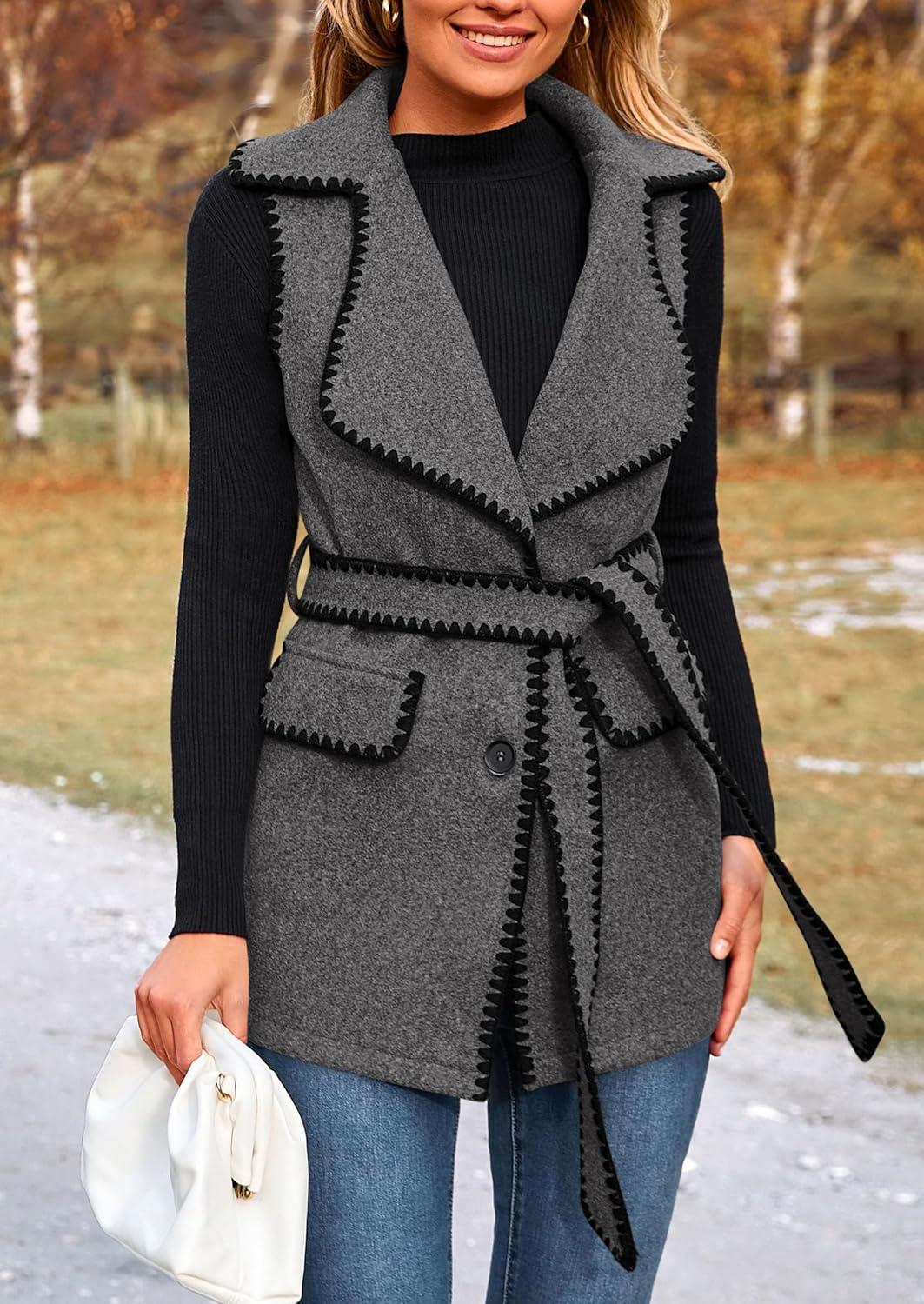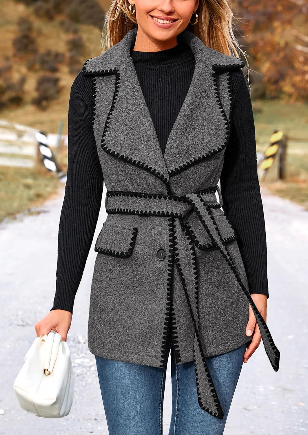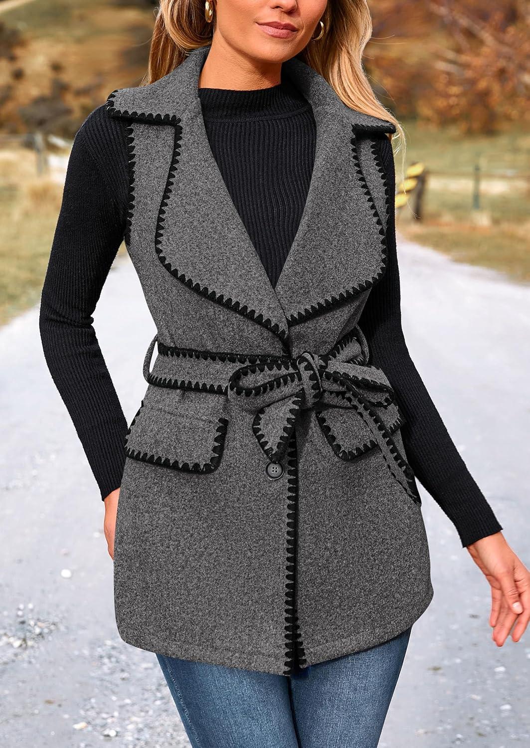 PRETTYGARDEN Women's 2025 Tweed Vest Jackets Sleeveless Lapel Button Front Belt Color Block Winter Cardigan Outerwear(Dark Grey)