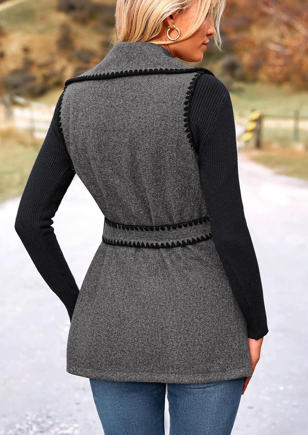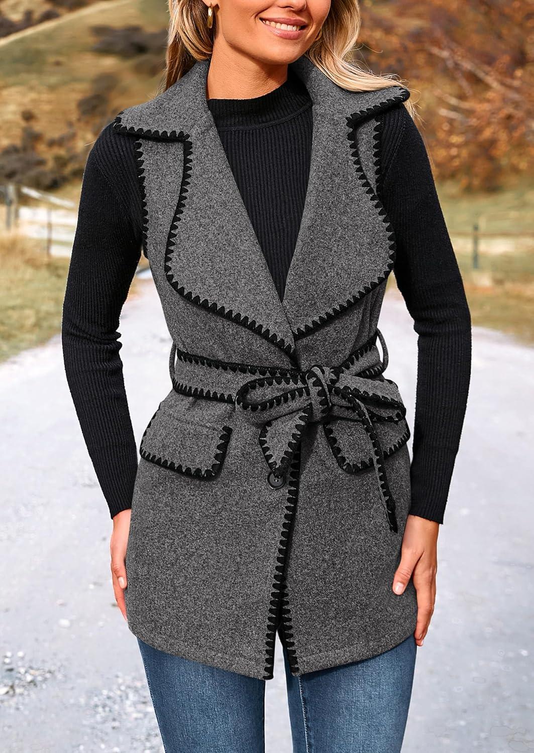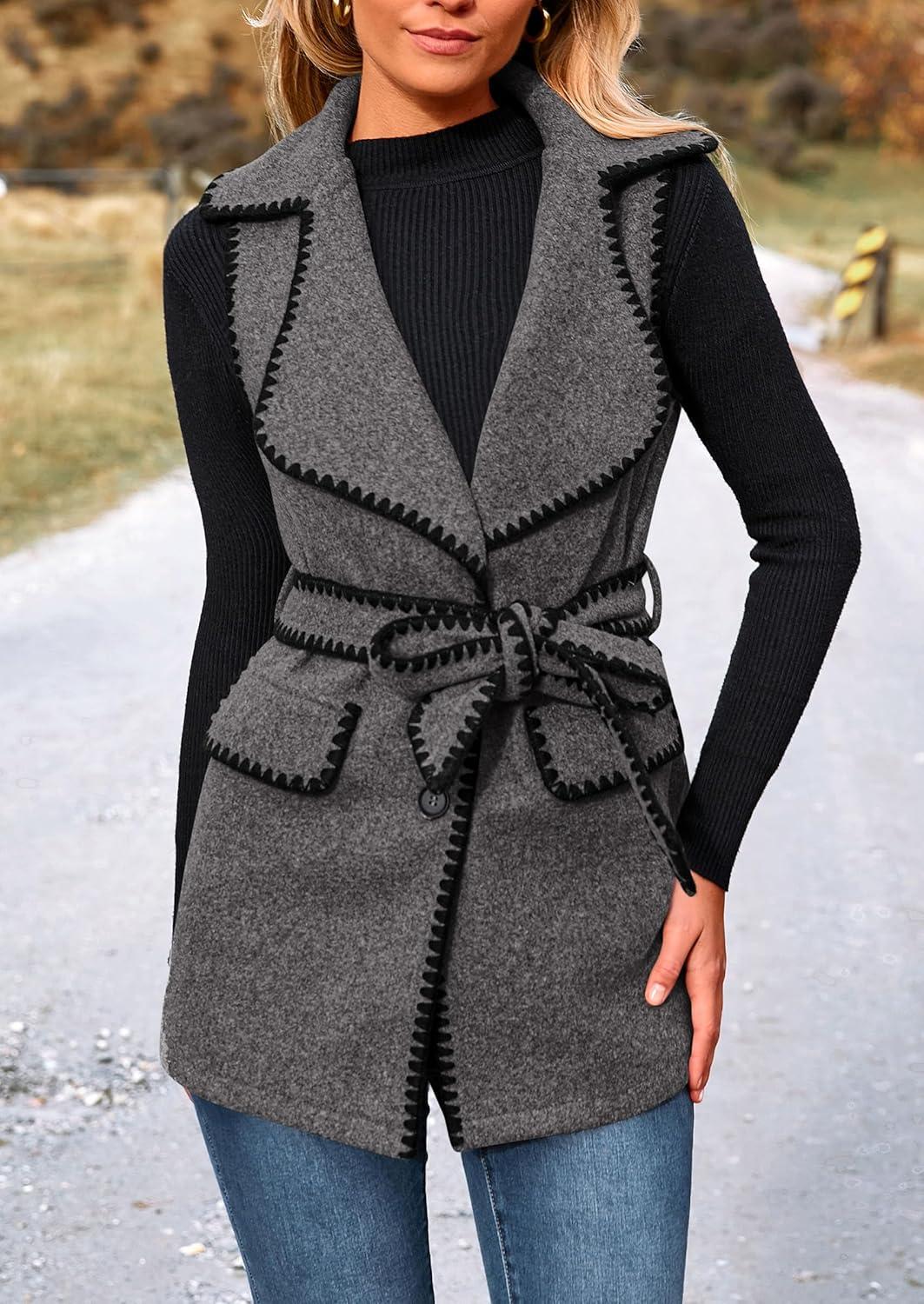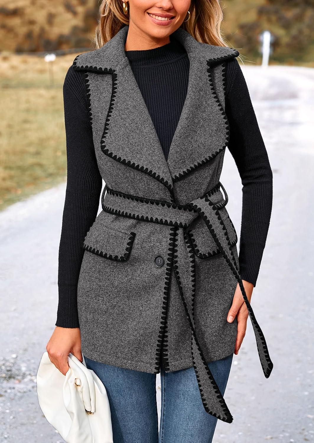 PRETTYGARDEN Women's 2025 Tweed Vest Jackets Sleeveless Lapel Button Front Belt Color Block Winter Cardigan Outerwear(Dark Grey)