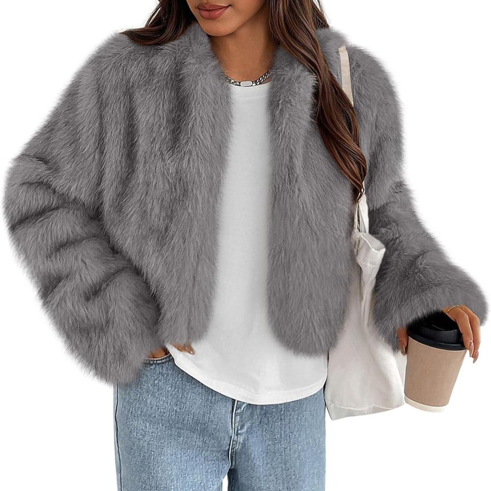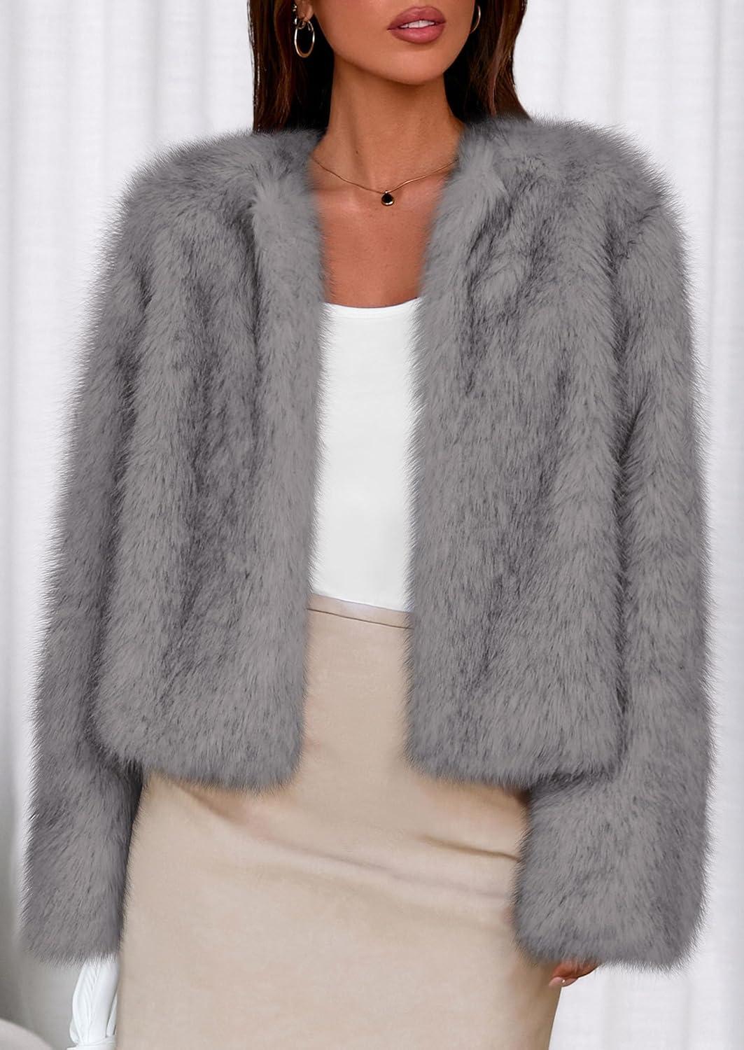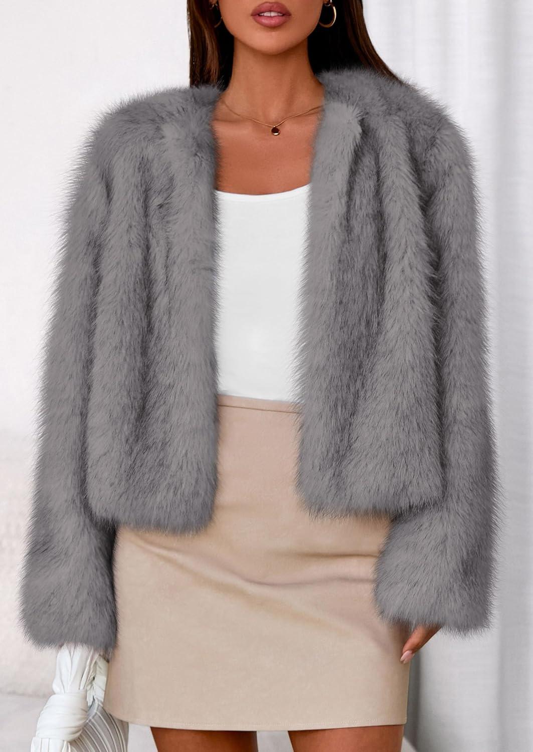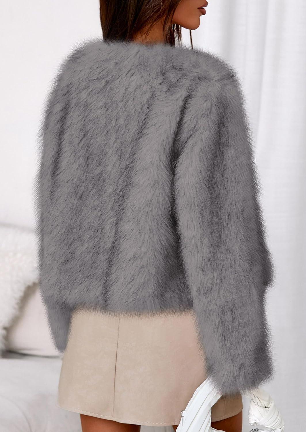 PRETTYGARDEN Womens 2025 Winter Coats Fluffy Cropped Faux Fur Jacket Long Sleeve Open Front Shaggy Outerwear Trendy Clothes(Grey)