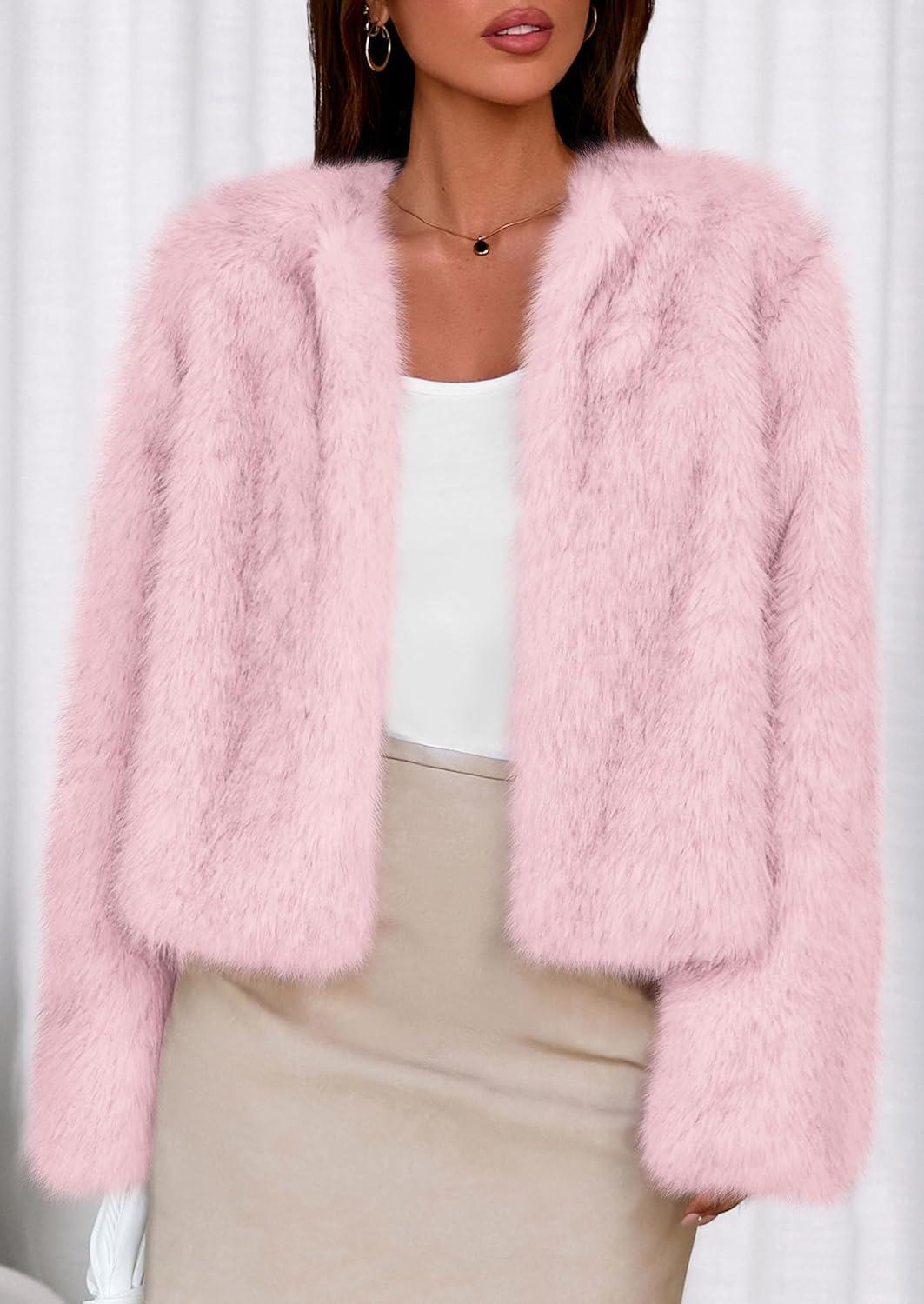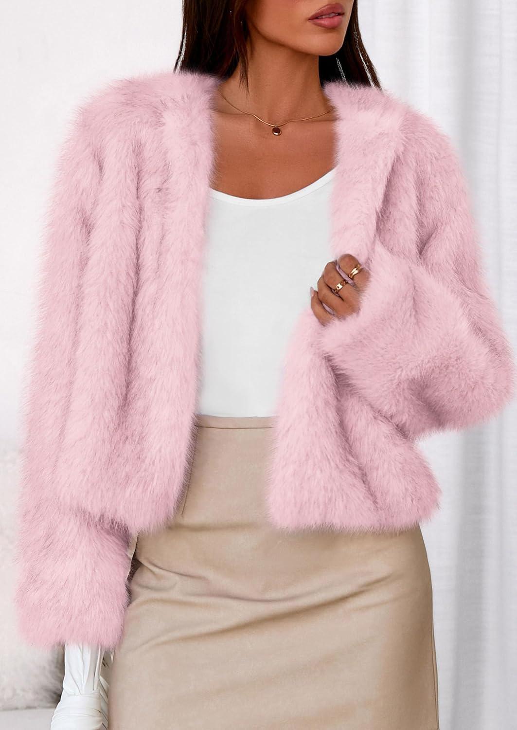 PRETTYGARDEN Womens 2025 Winter Coats Fluffy Cropped Faux Fur Jacket Long Sleeve Open Front Shaggy Outerwear Trendy Clothes(Pink)