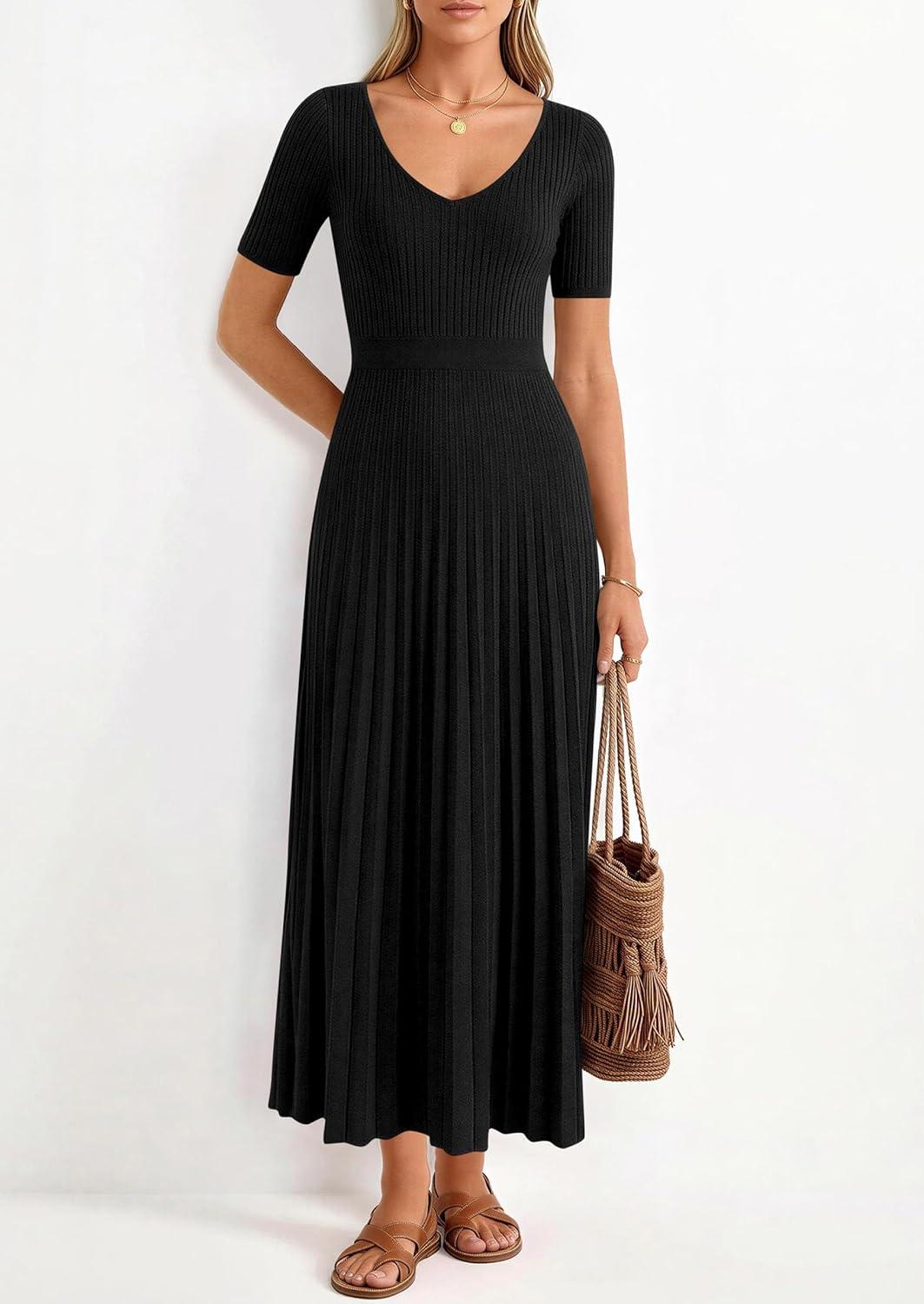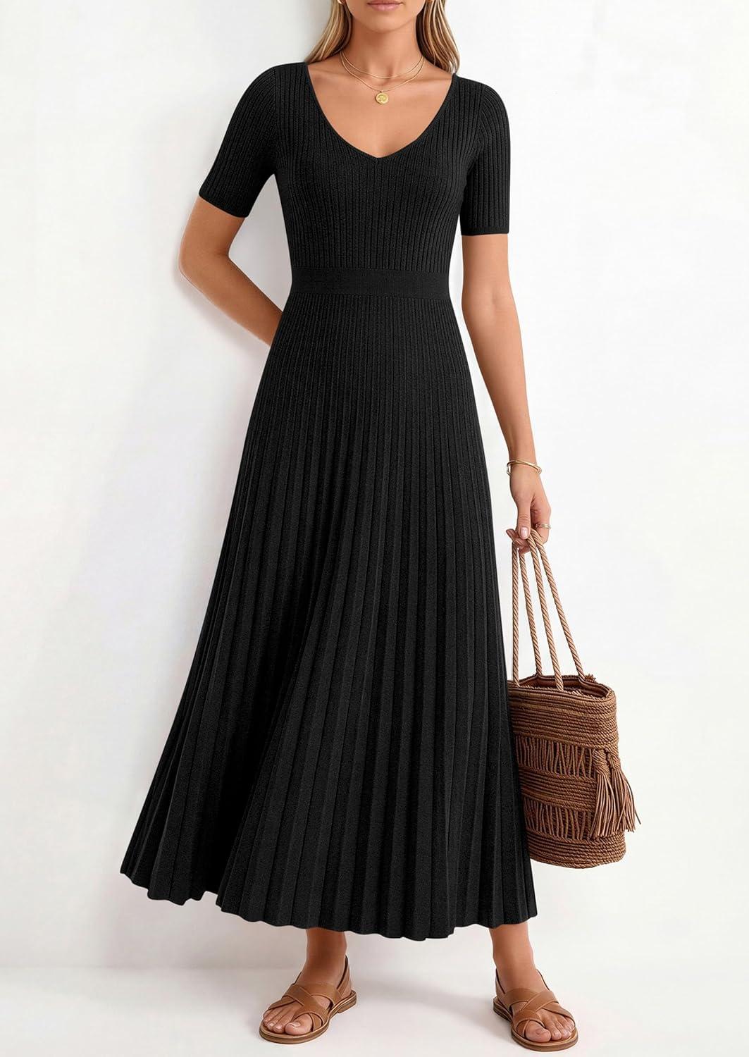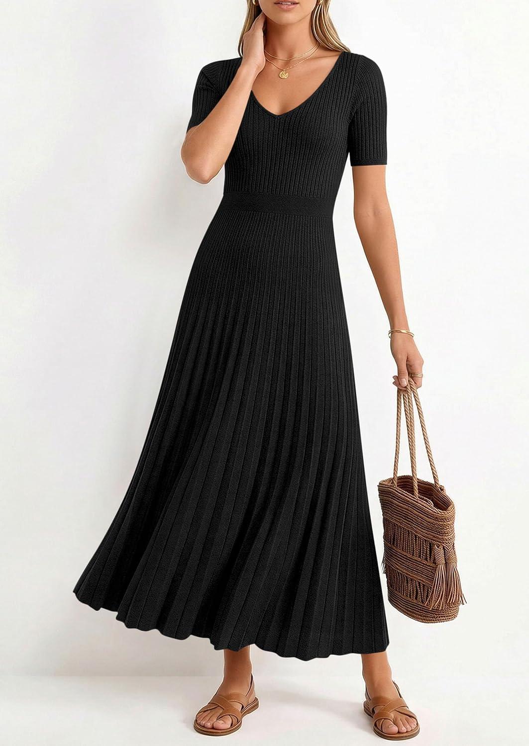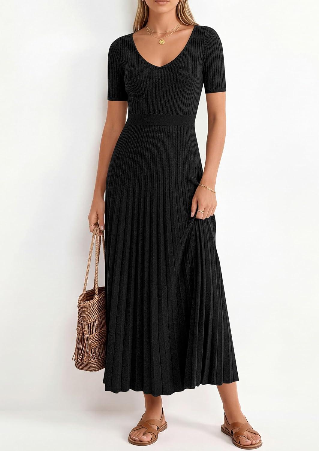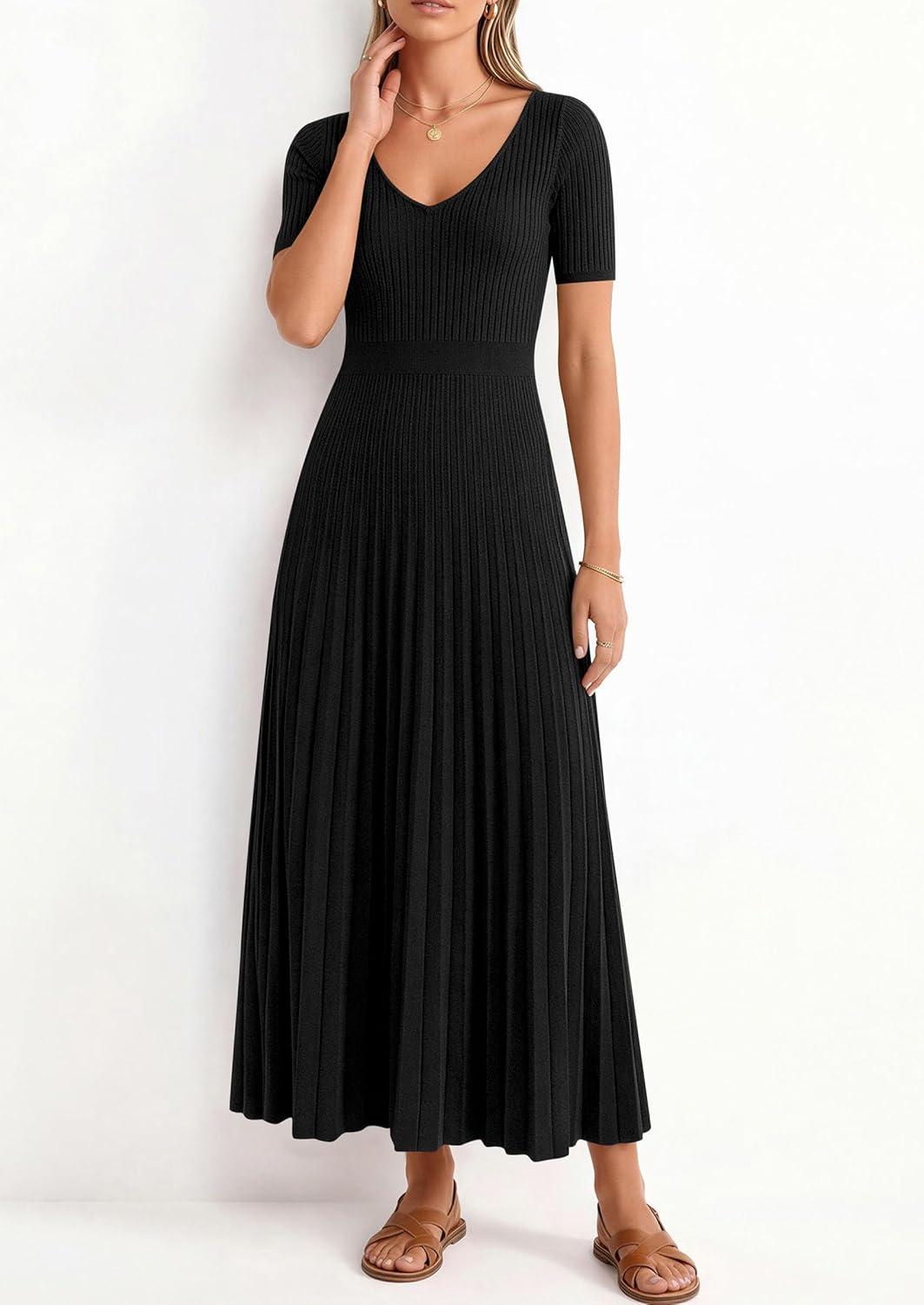 PRETTYGARDEN Women’s 2026 Spring Midi Sweater Dresses Elegant Pleated Ribbed Knit Short Sleeve V Neck A Line Summer Outfits(Black)