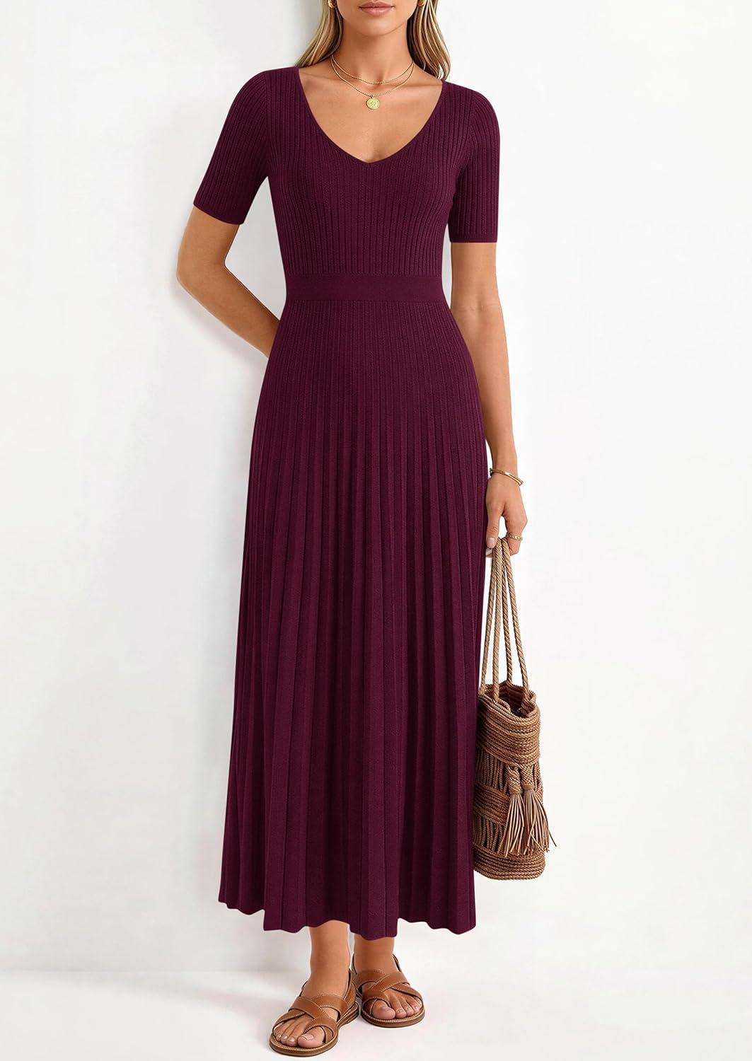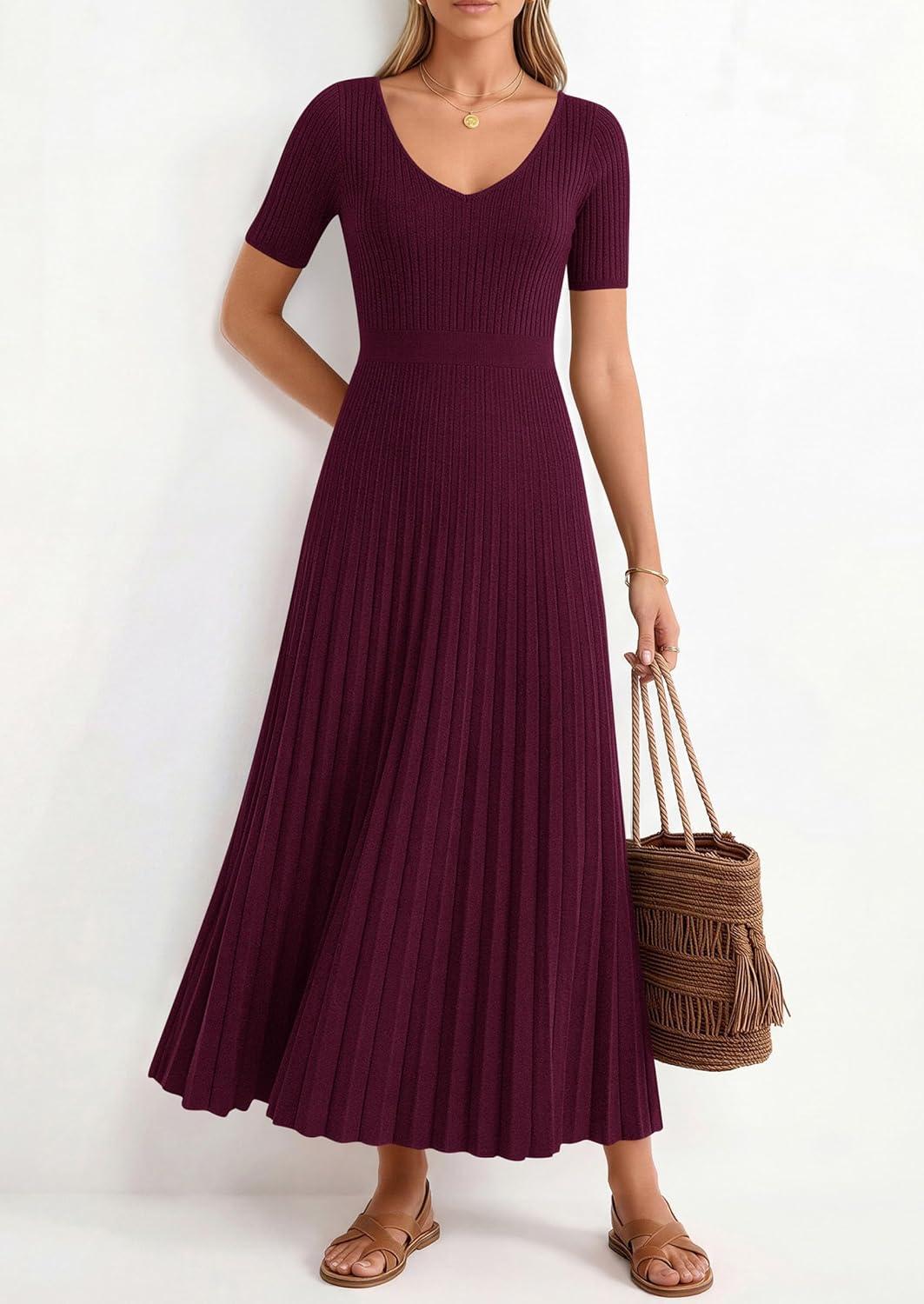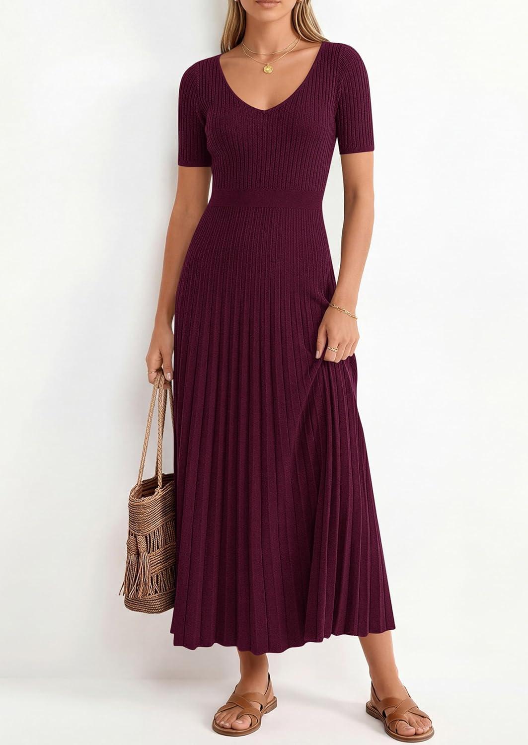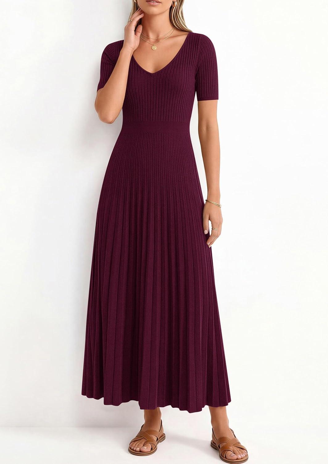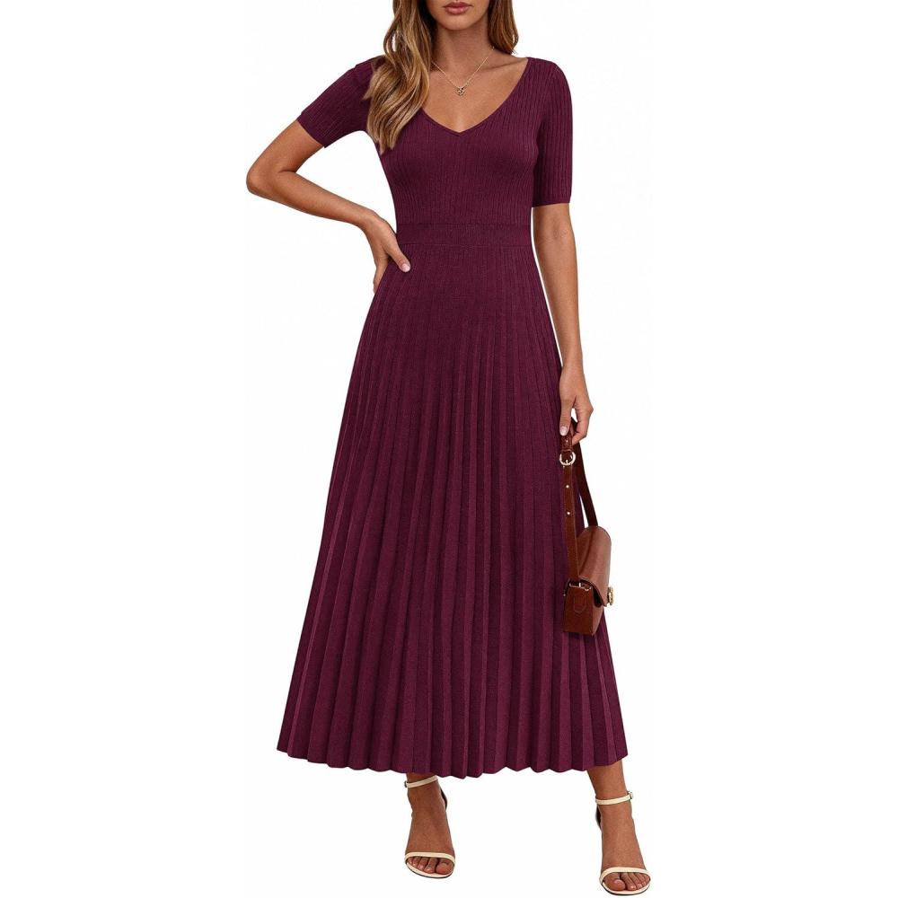 PRETTYGARDEN Women’s 2026 Spring Midi Sweater Dresses Elegant Pleated Ribbed Knit Short Sleeve V Neck A Line Summer Outfits(Burgundy)