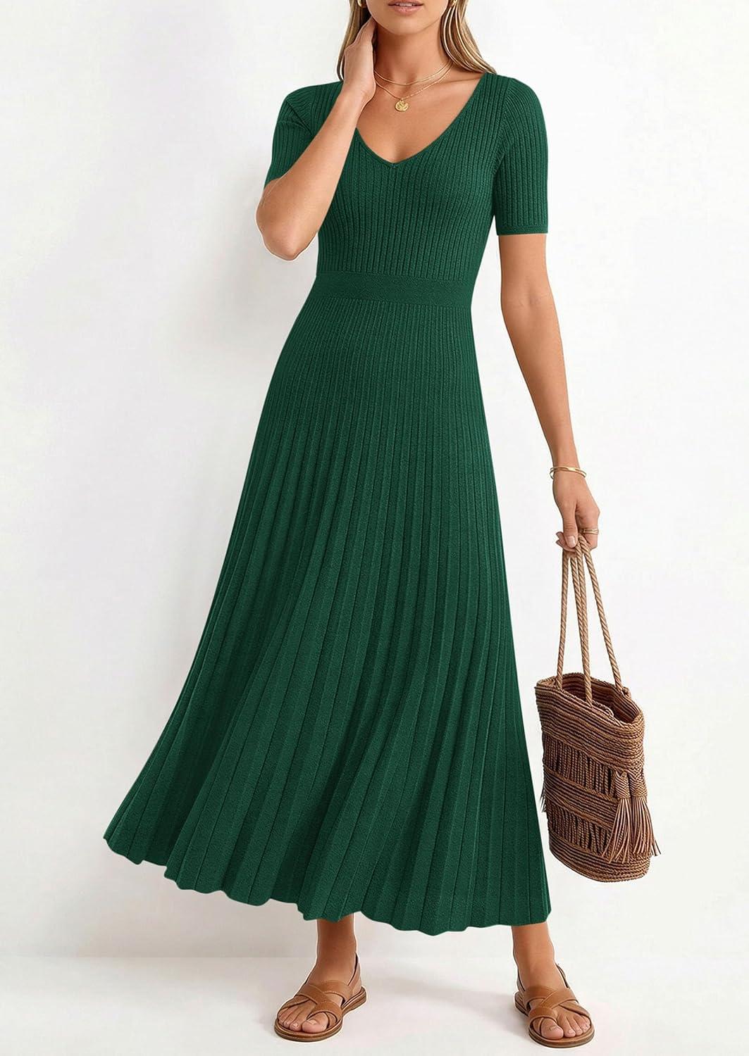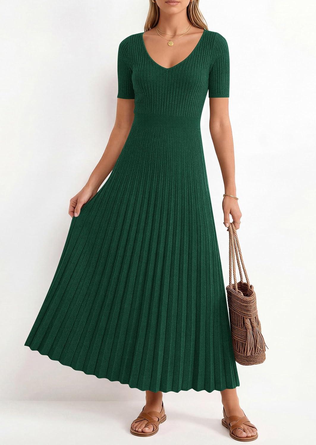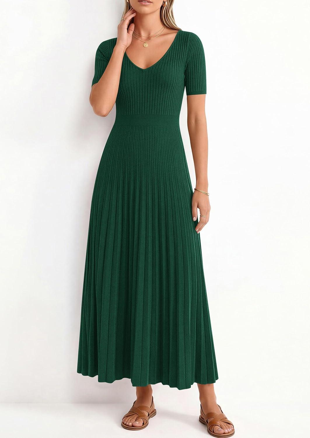 PRETTYGARDEN Summer Short Sleeve Ribbed Knitted Sweater Dress for Women