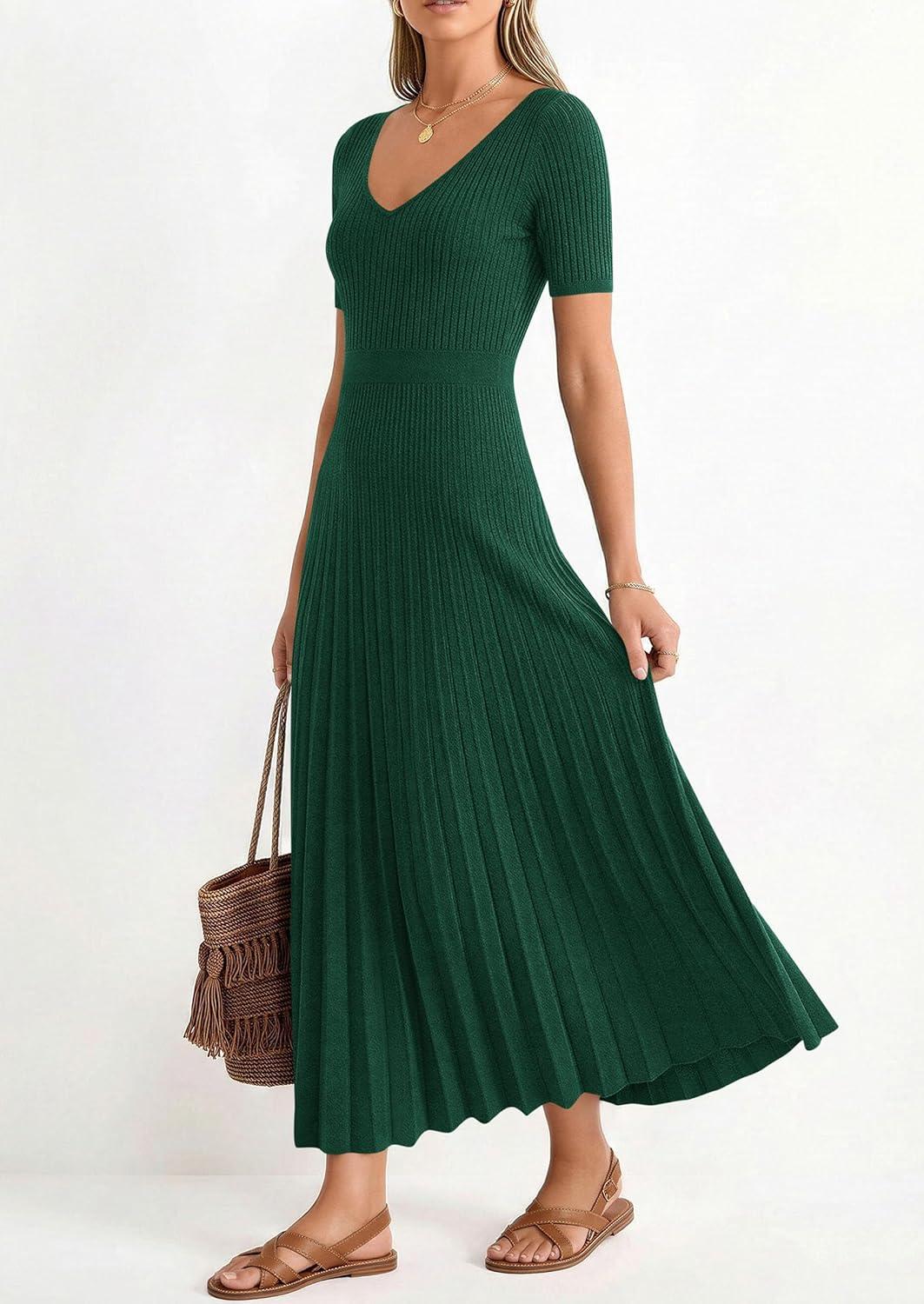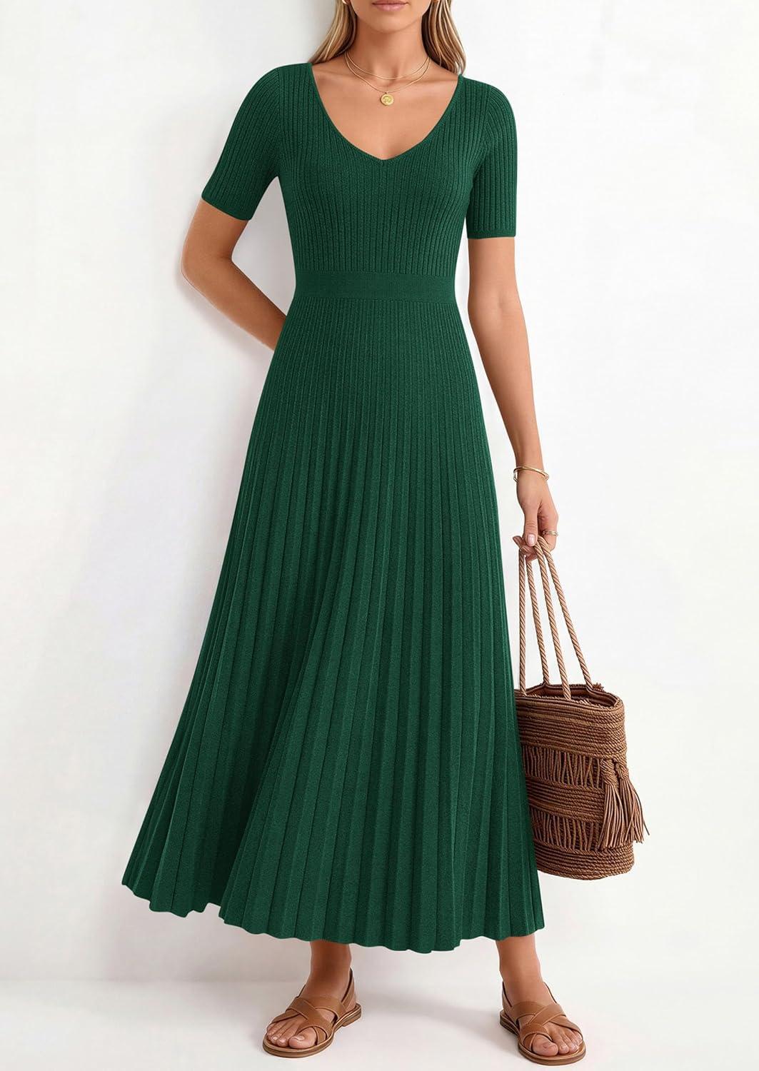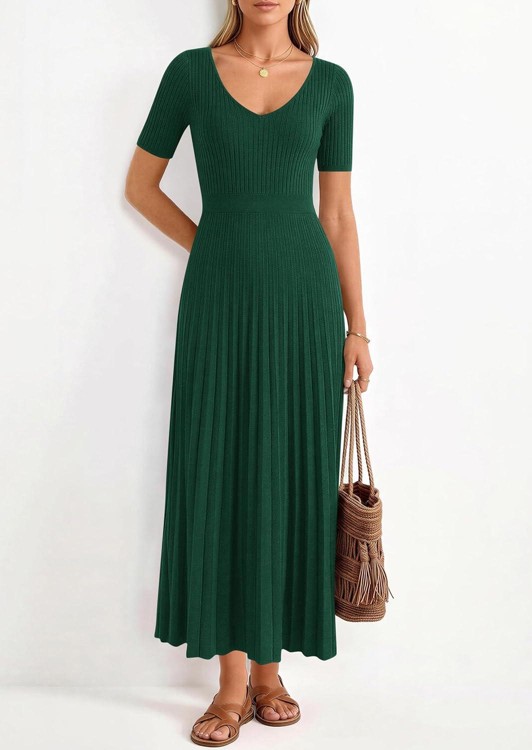 PRETTYGARDEN Summer Short Sleeve Ribbed Knitted Sweater Dress for Women