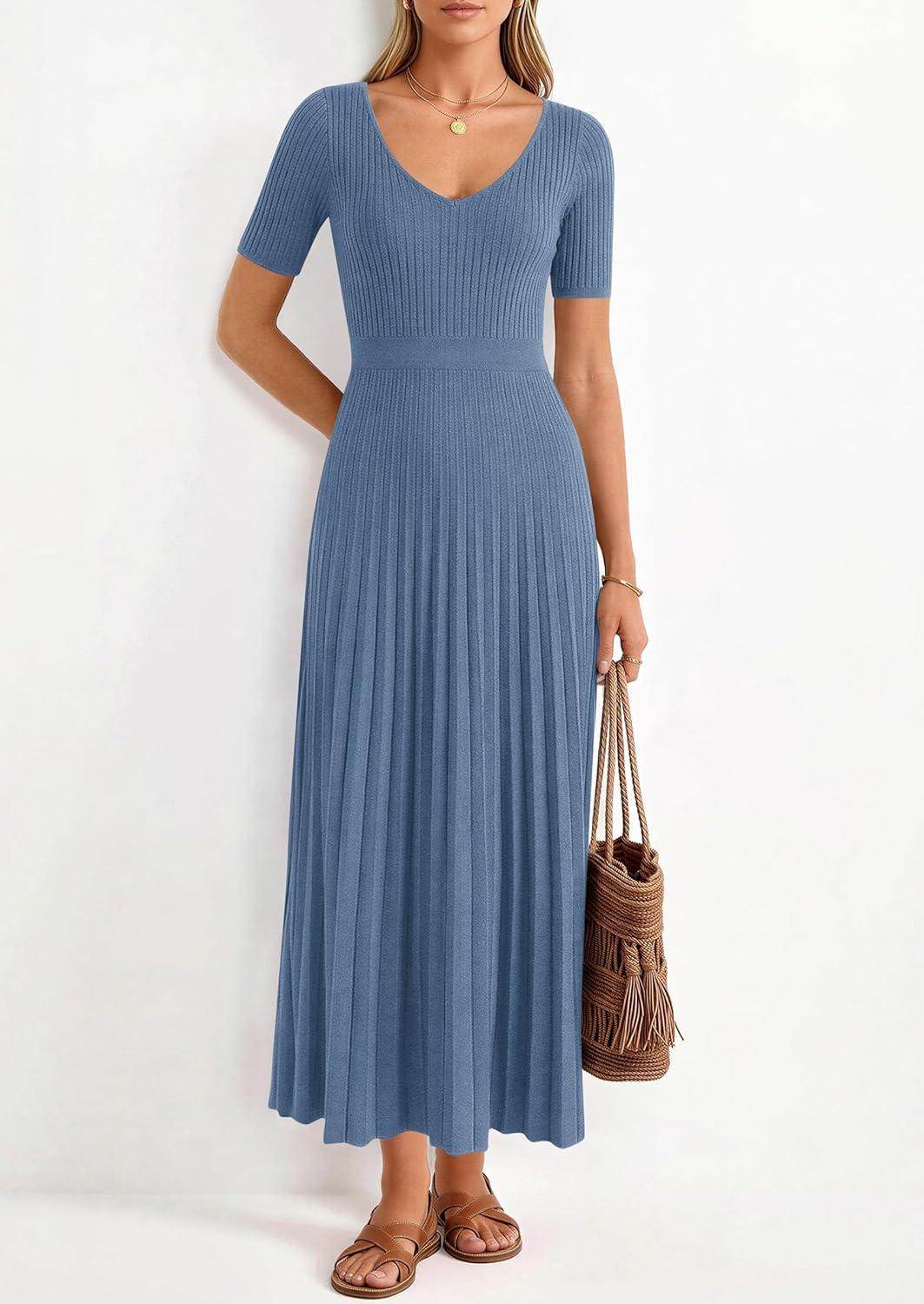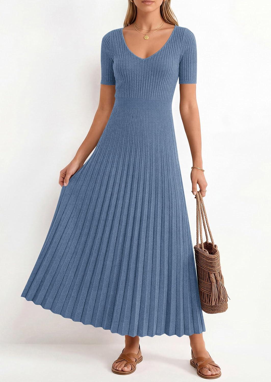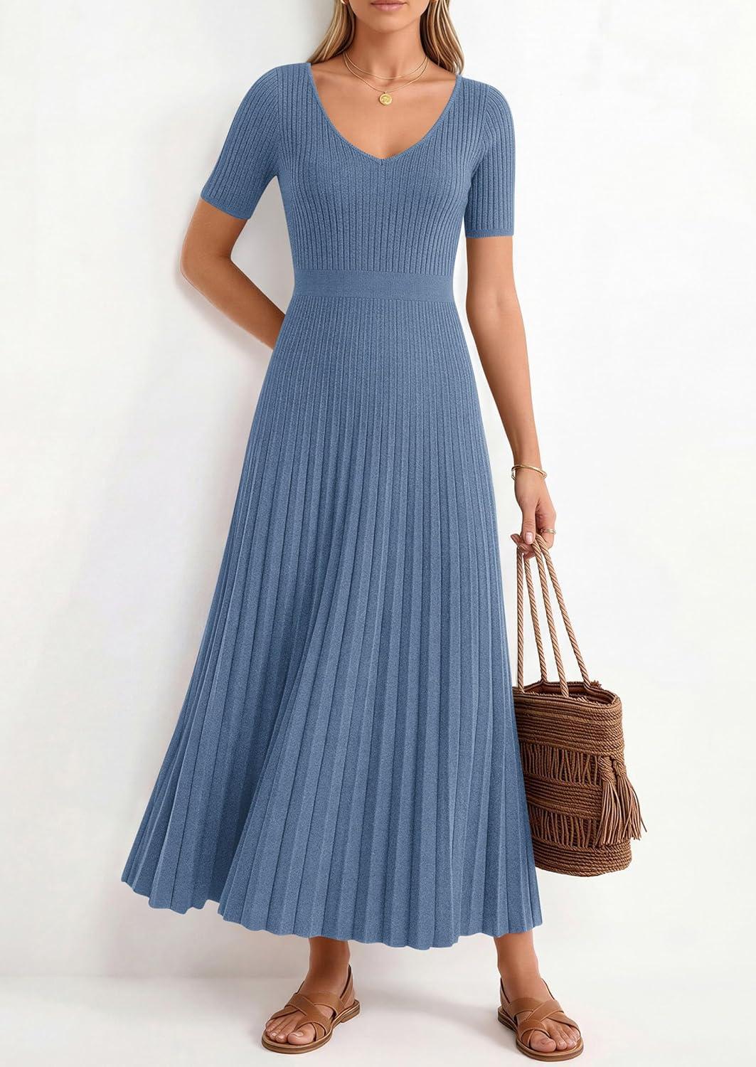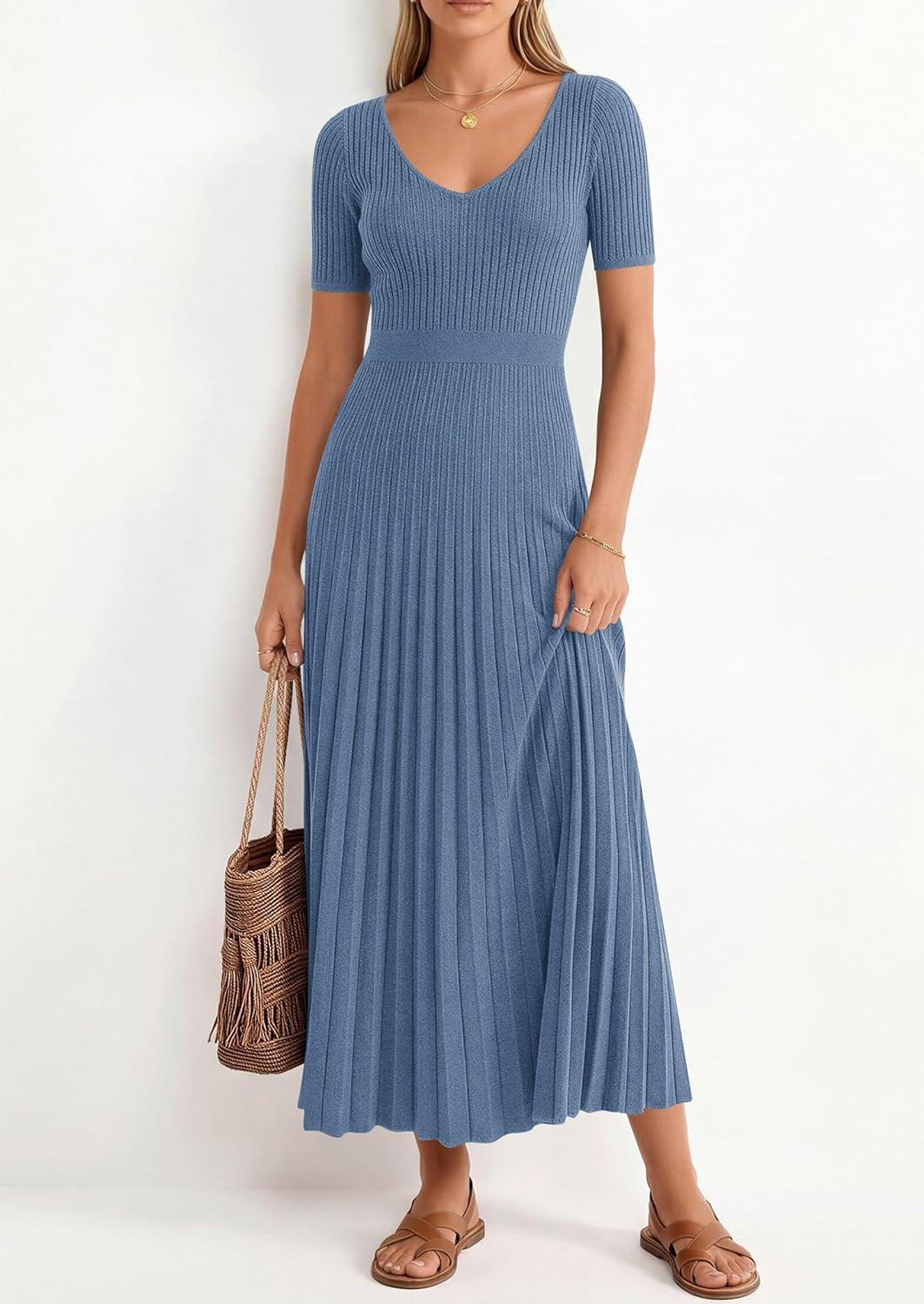 PRETTYGARDEN Women's 2026 Spring Midi Sweater Dresses Elegant Pleated Ribbed Knit Short Sleeve V Neck A Line Summer Outfits(Dusty Blue)
