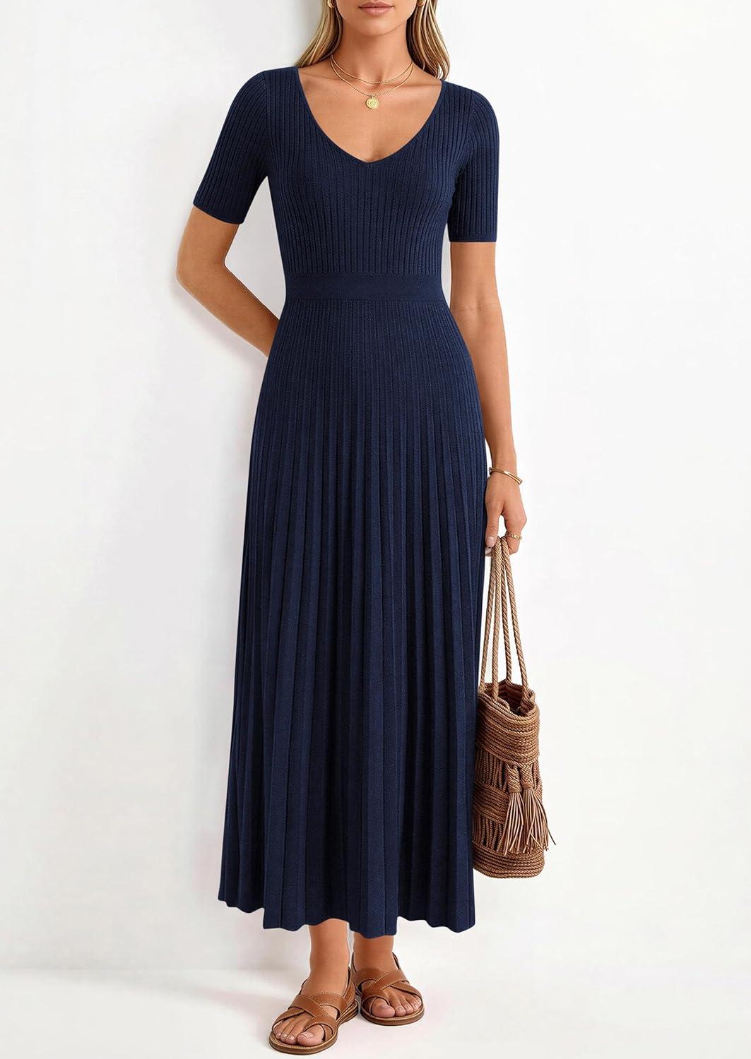 PRETTYGARDEN Women’s 2026 Spring Midi Sweater Dresses Elegant Pleated Ribbed Knit Short Sleeve V Neck A Line Summer Outfits(Navy Blue)