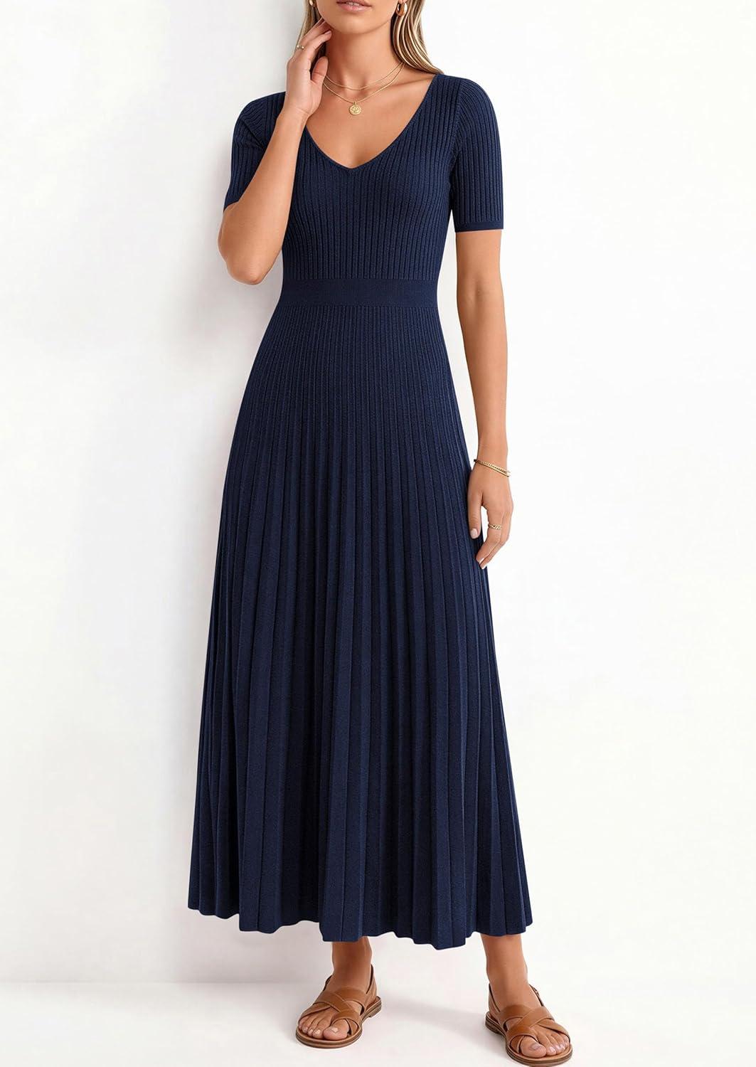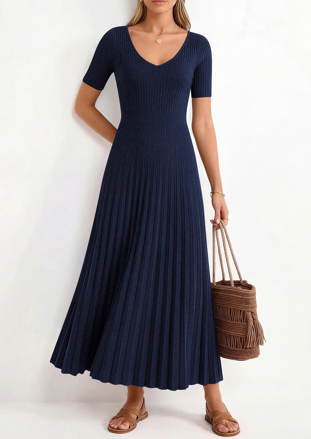 PRETTYGARDEN Women's 2026 Spring Midi Sweater Dresses Elegant Pleated Ribbed Knit Short Sleeve V Neck A Line Summer Outfits(Navy Blue)