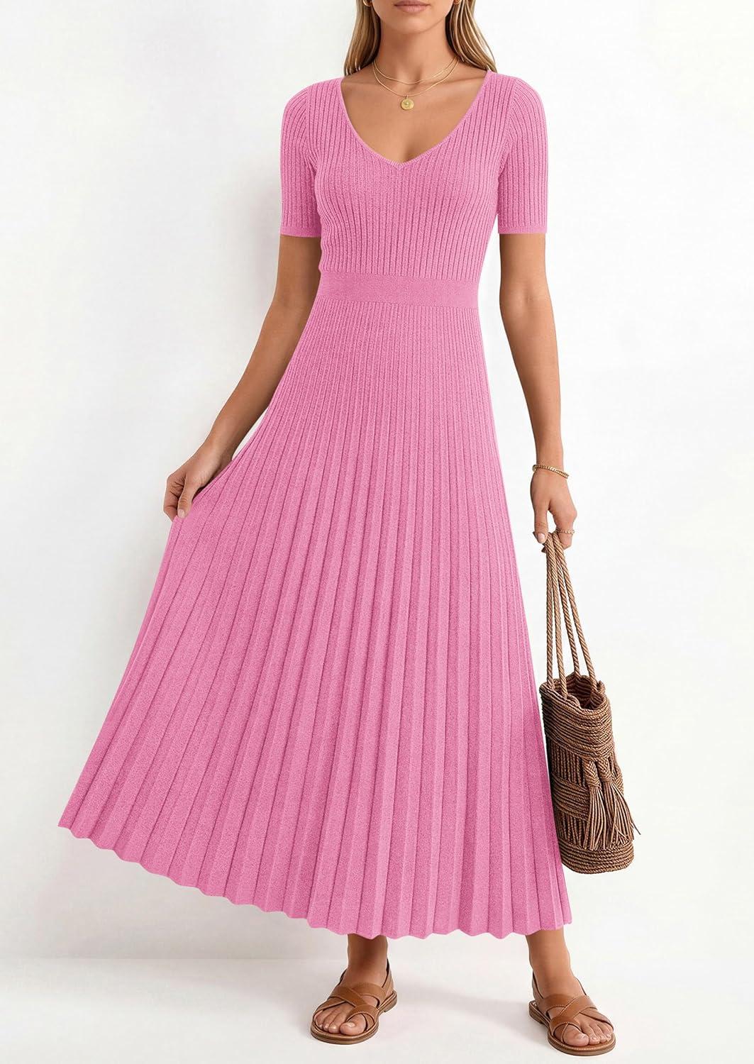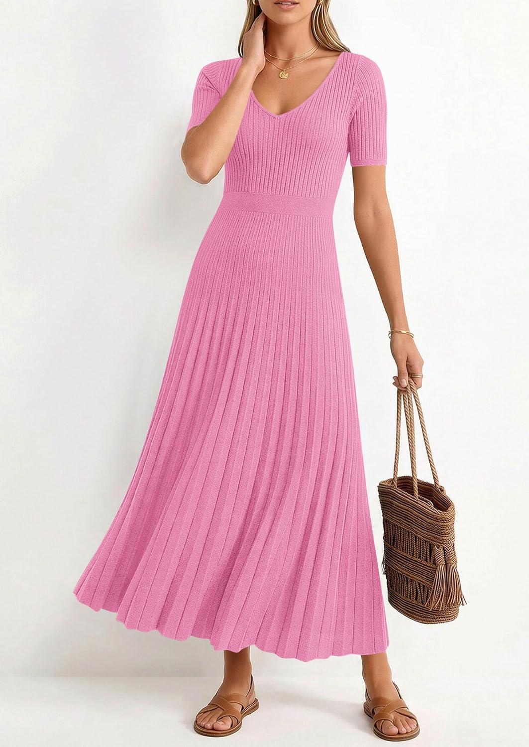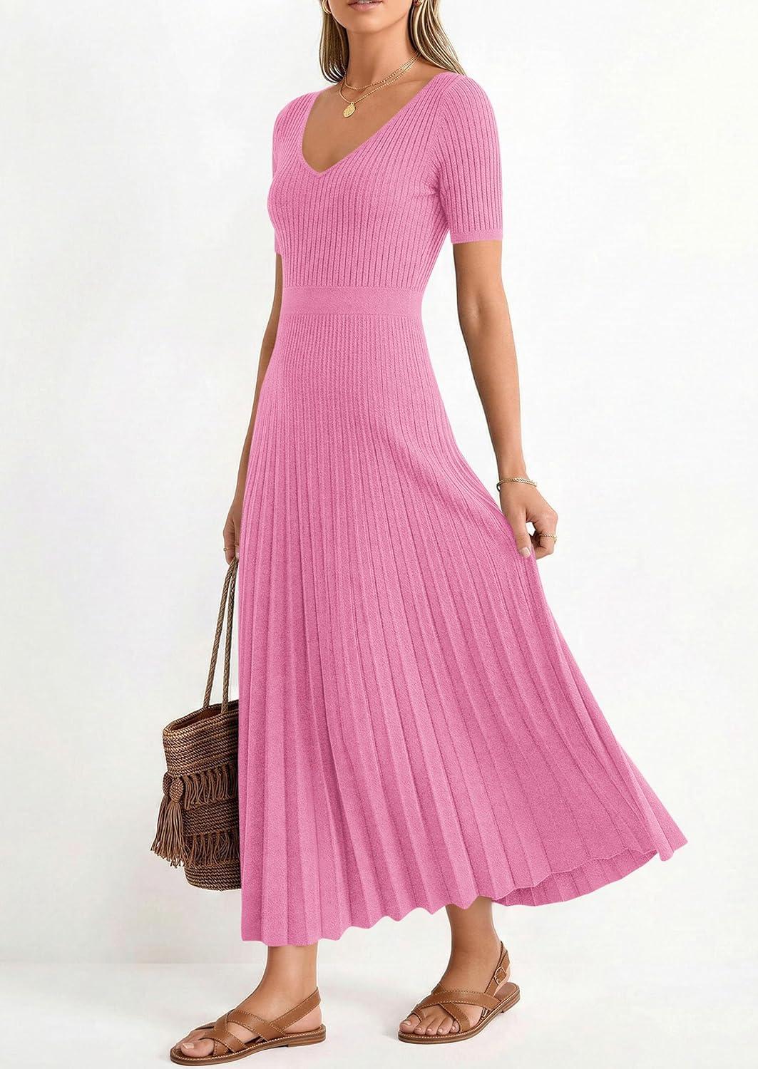 PRETTYGARDEN Women’s 2026 Spring Midi Sweater Dresses Elegant Pleated Ribbed Knit Short Sleeve V Neck A Line Summer Outfits(Pink)