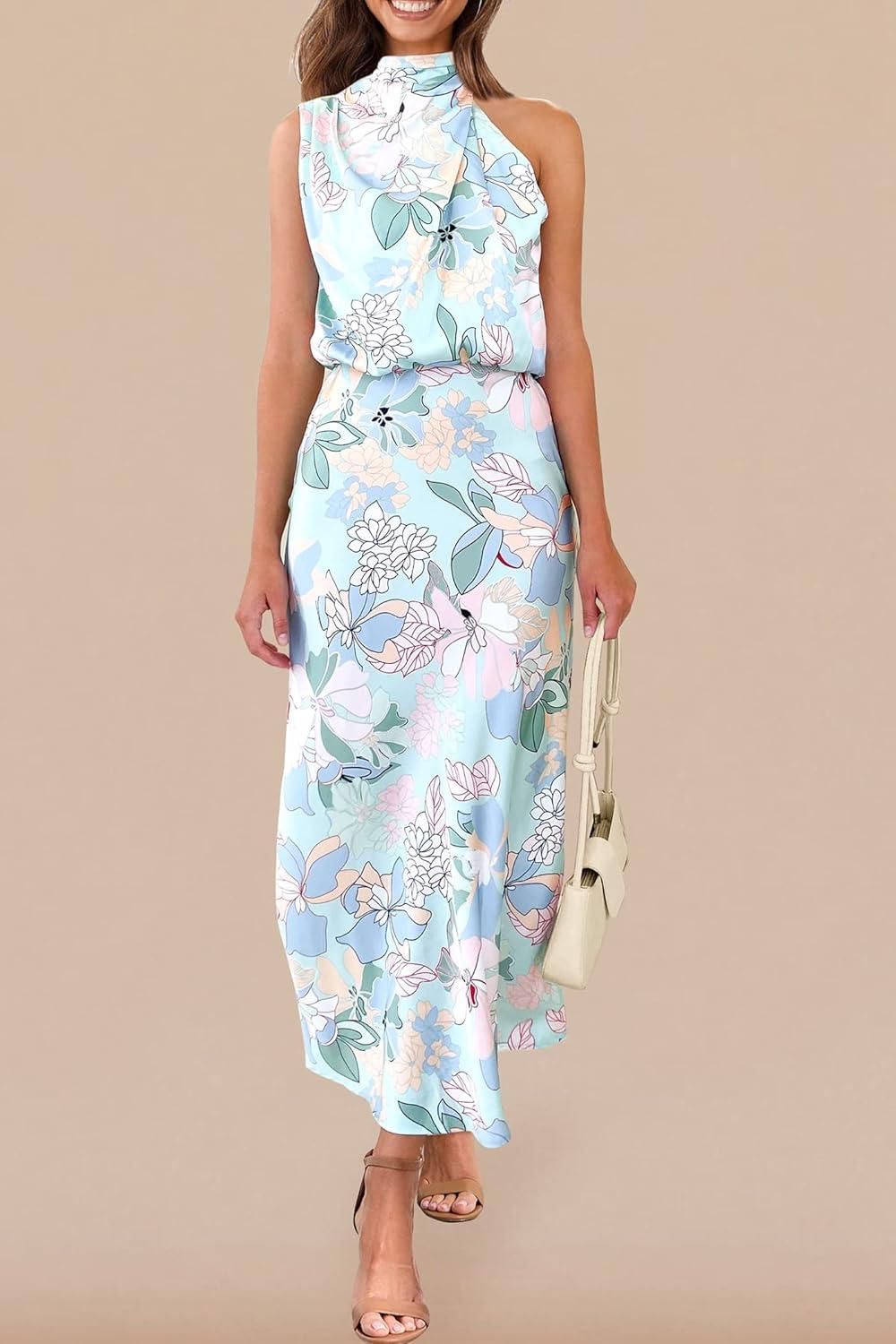 PRETTYGARDEN Women’s 2026 Summer Satin Dress Elegant Sleeveless Mock Neck Cocktail Party Maxi Dresses(Print Multicolored)