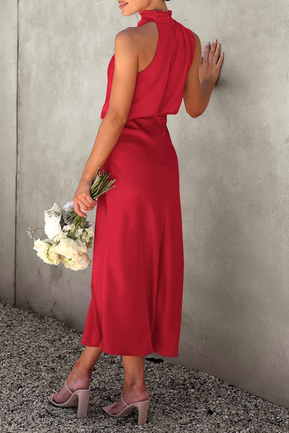 PRETTYGARDEN Women's 2026 Summer Satin Dress Elegant Sleeveless Mock Neck Cocktail Party Maxi Dresses(Red)