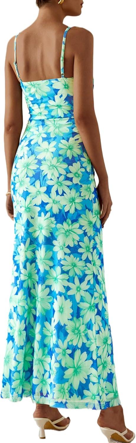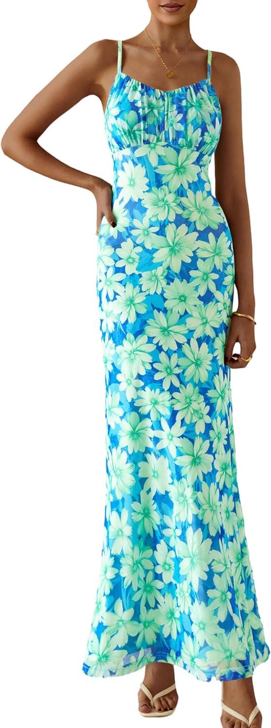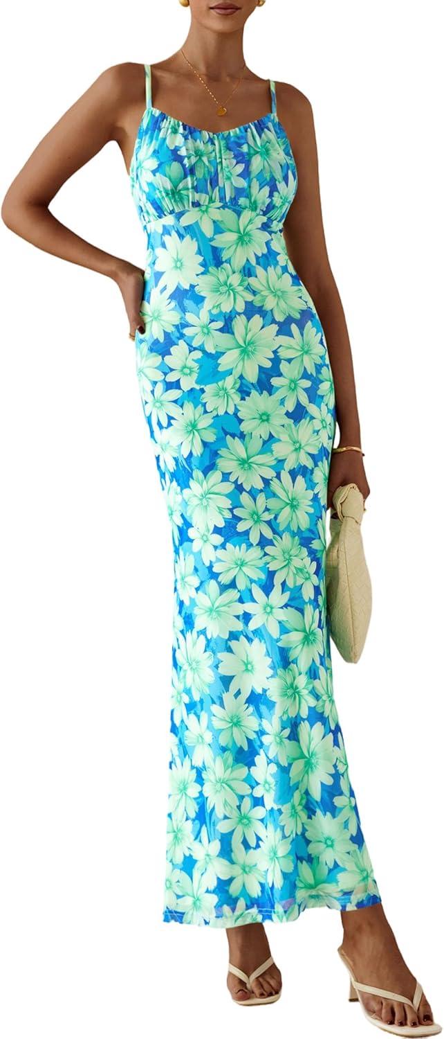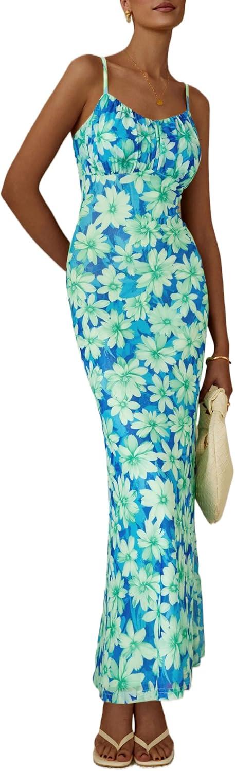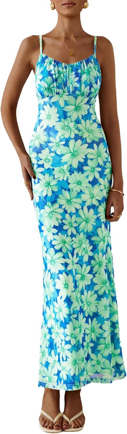 PRETTYGARDEN Women's Bodycon Maxi Dress 2025 Summer Floral Sundress Sleeveless Spaghetti Strap Cocktail Party Dress(Light Green Daisy)