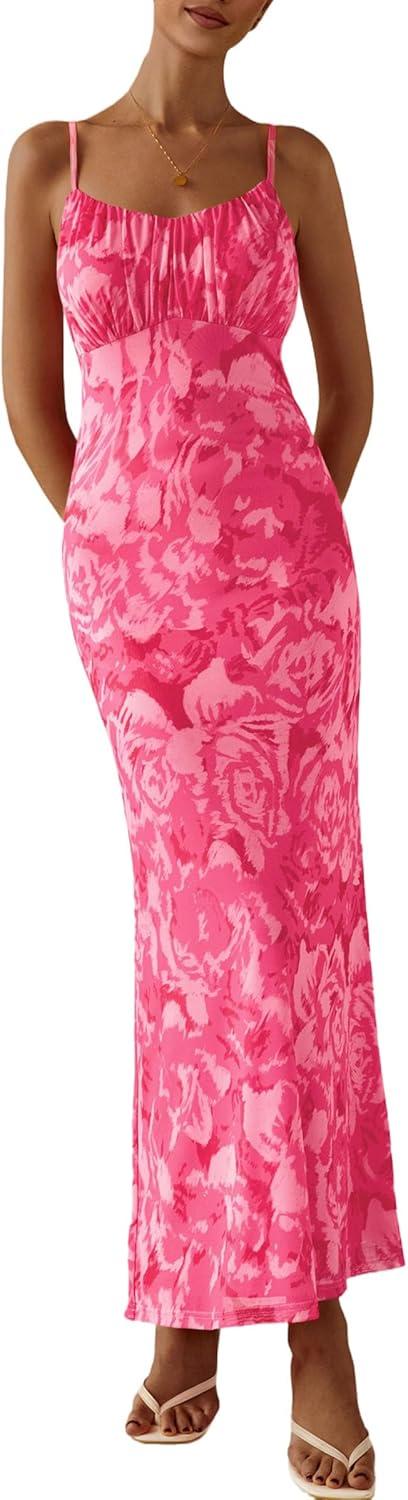 PRETTYGARDEN Women's Bodycon Maxi Dress 2025 Summer Floral Sundress Sleeveless Spaghetti Strap Cocktail Party Dress(Pink Floral)