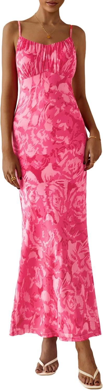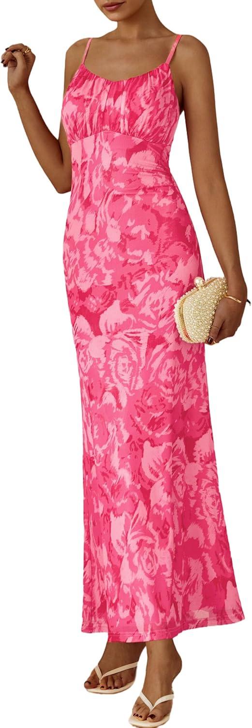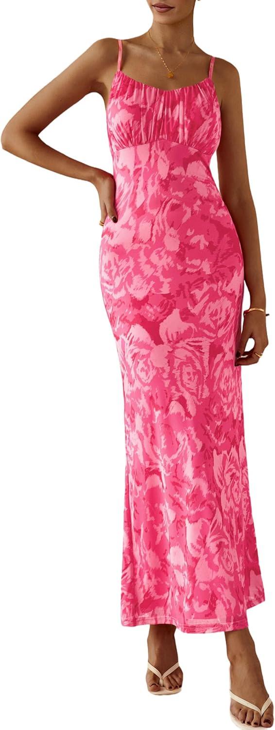 PRETTYGARDEN Women’s Bodycon Maxi Dress 2025 Summer Floral Sundress Sleeveless Spaghetti Strap Cocktail Party Dress(Pink Floral)