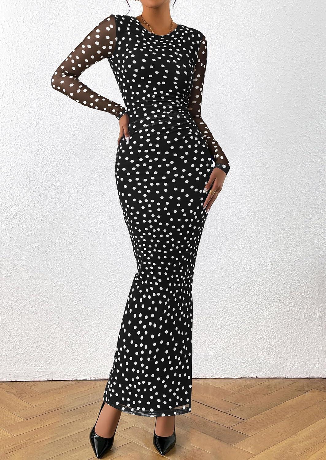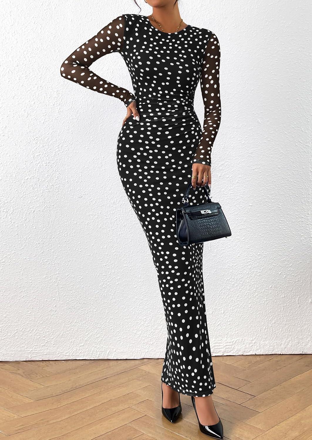 PRETTYGARDEN Women's Bodycon Maxi Dress Fall Spring Fashion Long Sleeve Floral Print Tight Fitted Party Club Ruched Dresses(01 Polka Dot Black White)