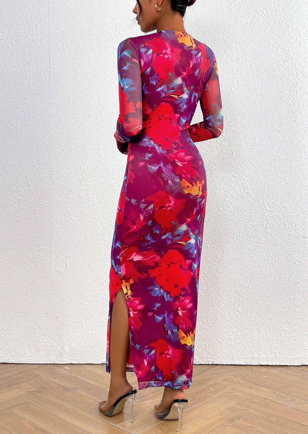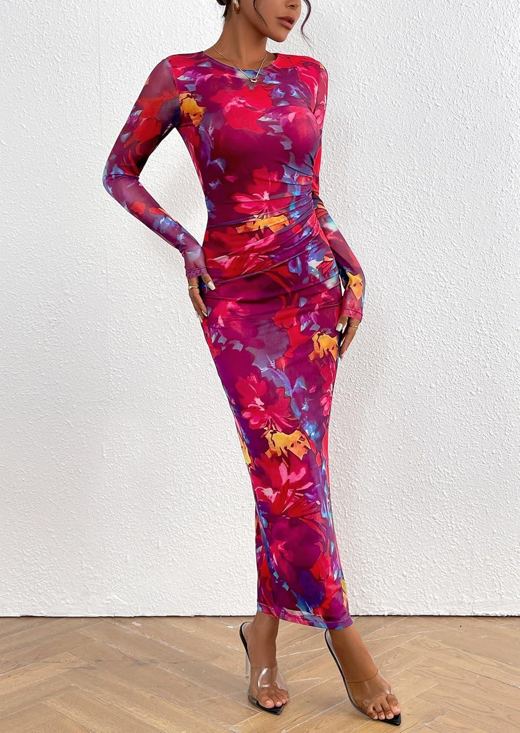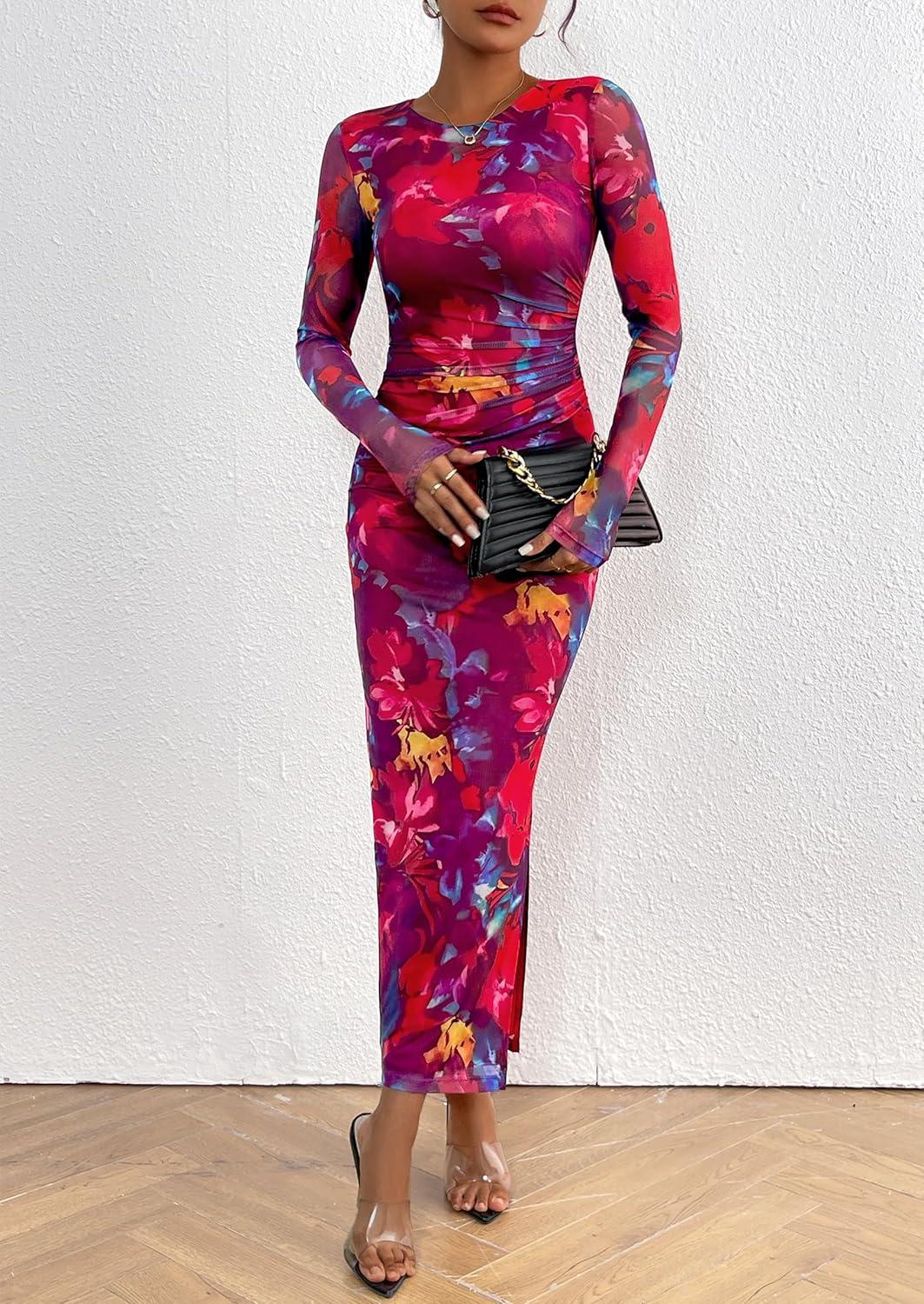 PRETTYGARDEN Women's Bodycon Maxi Dress Fall Spring Fashion Long Sleeve Floral Print Tight Fitted Party Club Ruched Dresses(Navy Red Big Floral)
