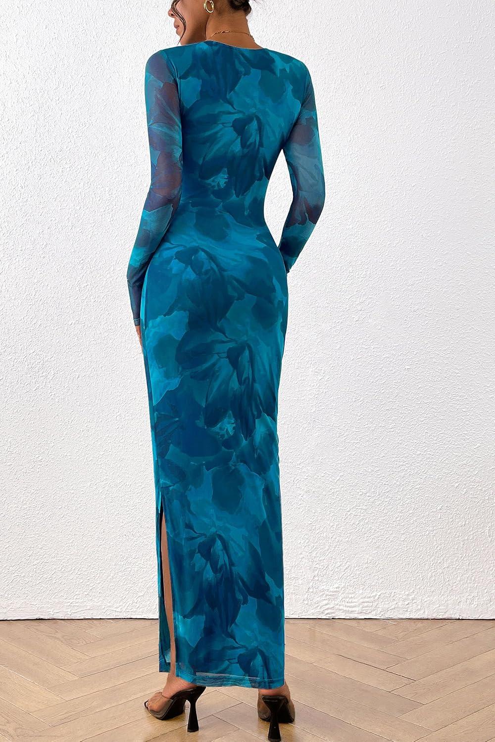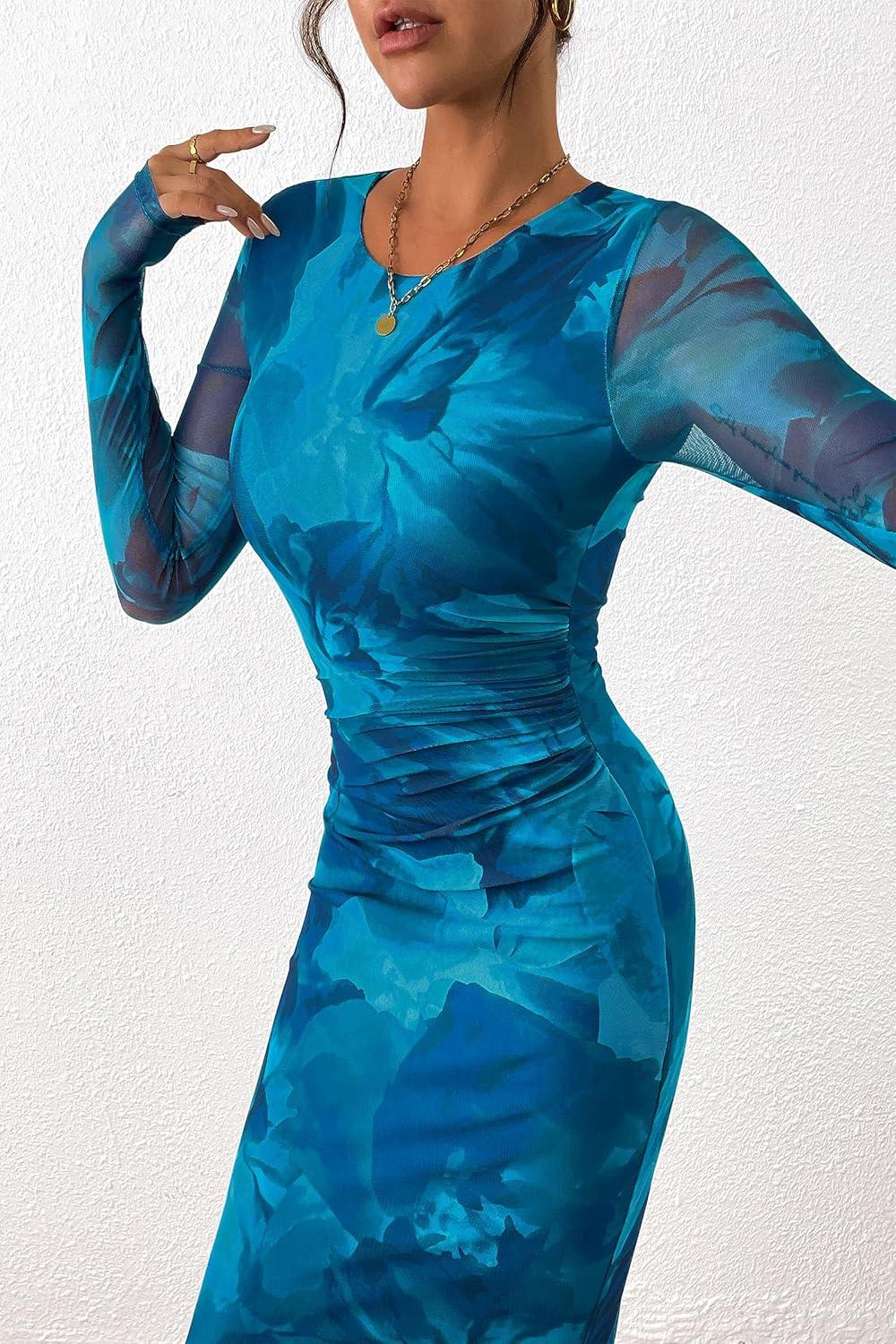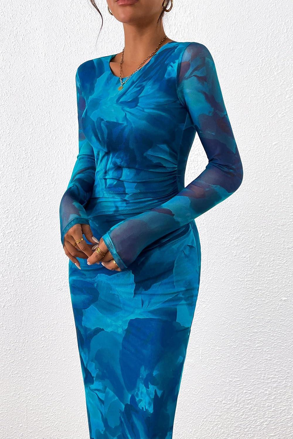 PRETTYGARDEN Women's Bodycon Maxi Dress Fall Spring Fashion Long Sleeve Floral Print Tight Fitted Party Club Ruched Dresses(Print Blue Green)