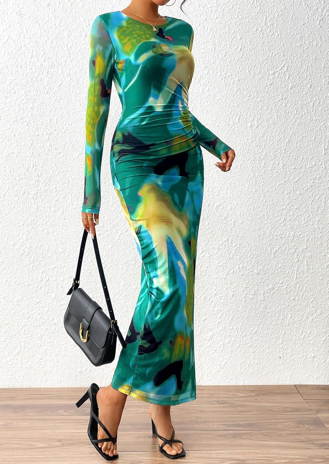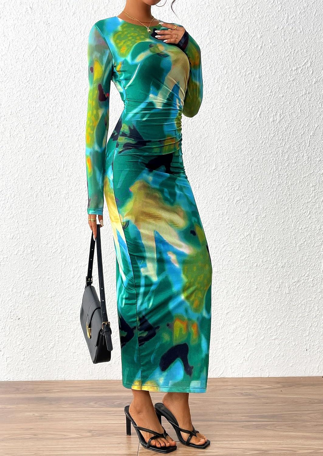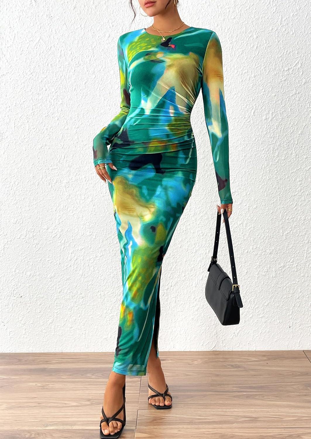PRETTYGARDEN Women's Bodycon Maxi Dress Fall Spring Fashion Long Sleeve Floral Print Tight Fitted Party Club Ruched Dresses(Print Green)