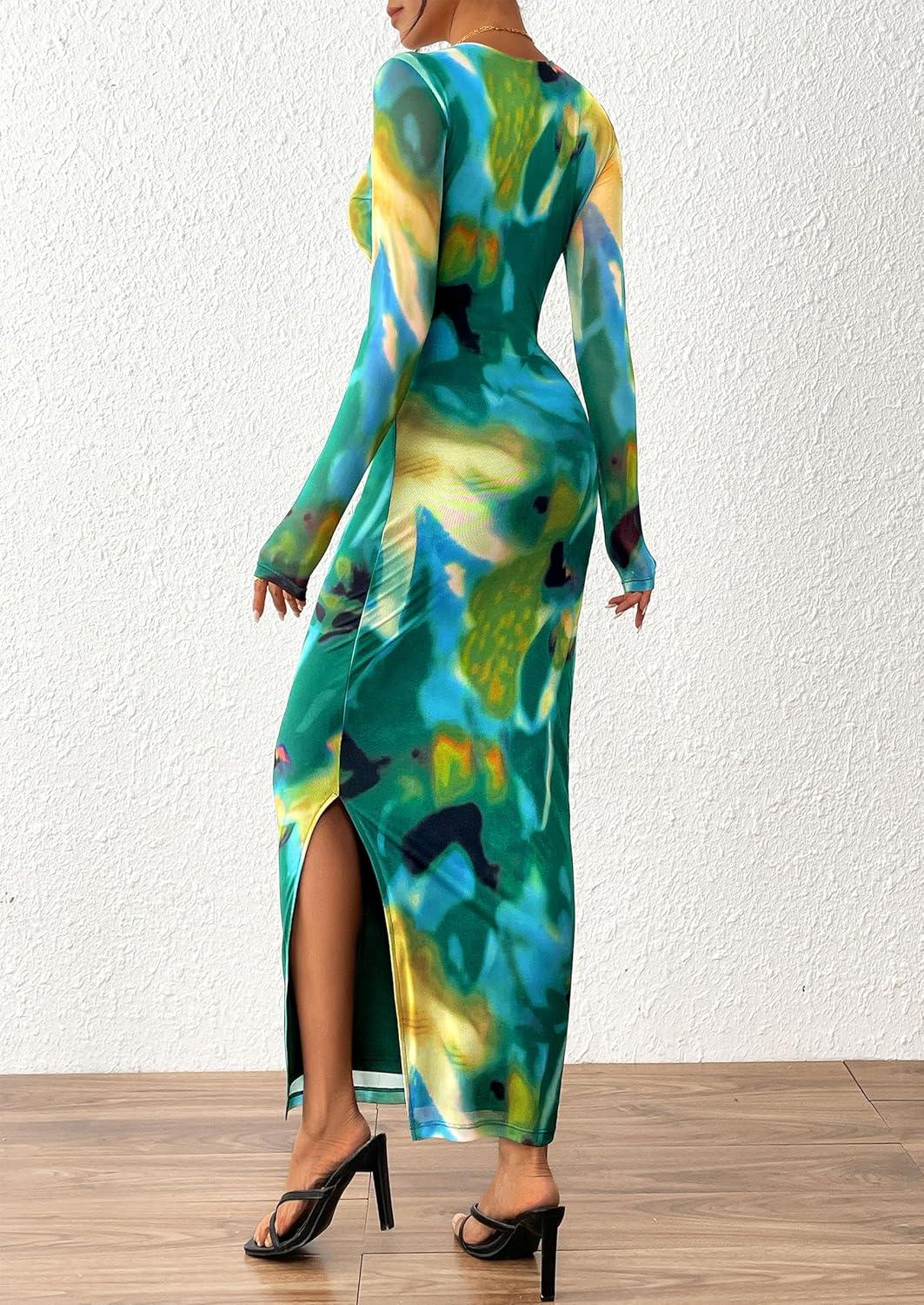 PRETTYGARDEN Women’s Bodycon Maxi Dress Fall Spring Fashion Long Sleeve Floral Print Tight Fitted Party Club Ruched Dresses(Print Blue Green)